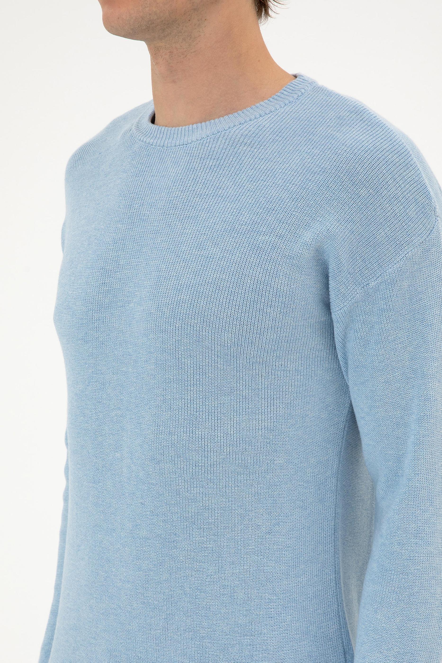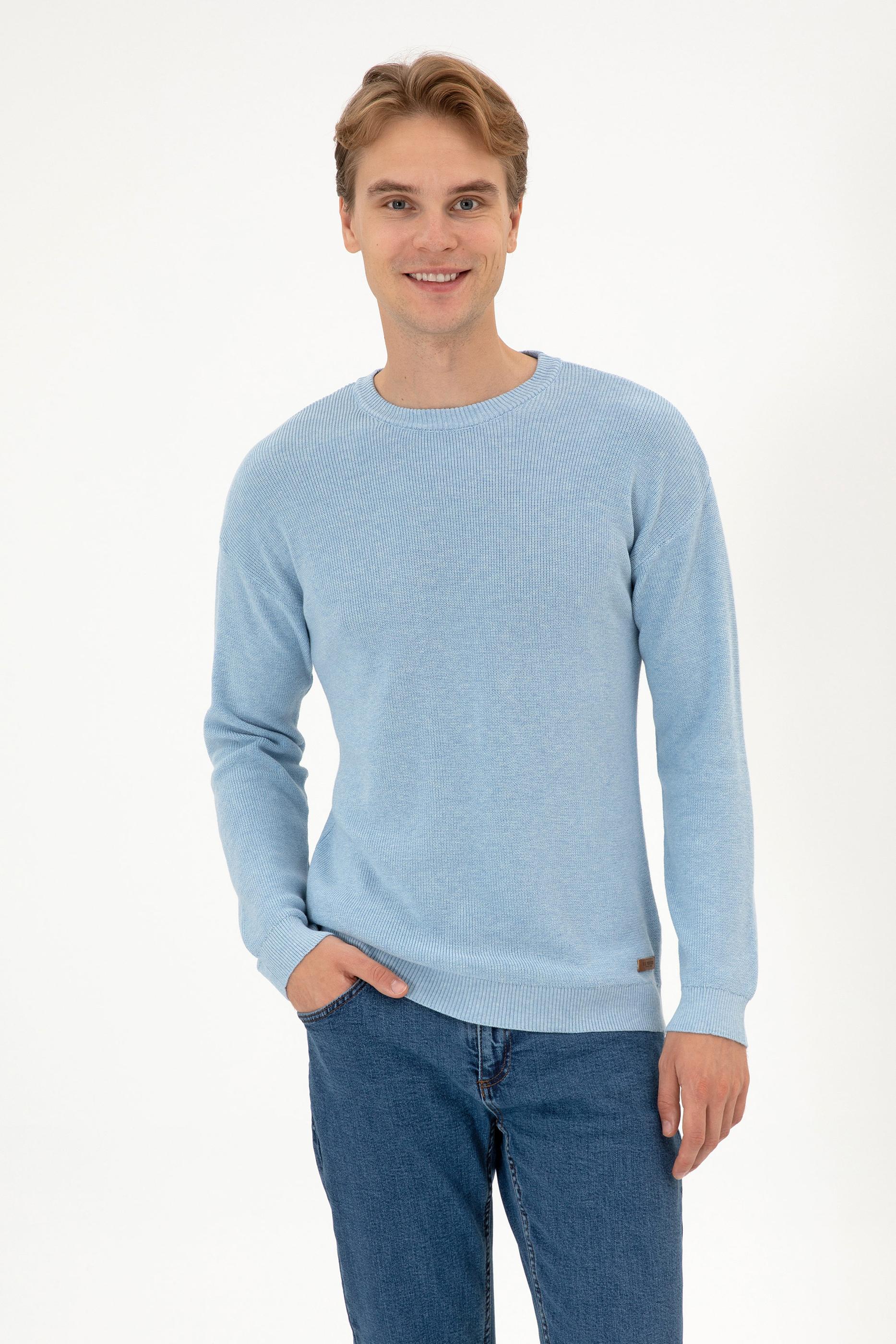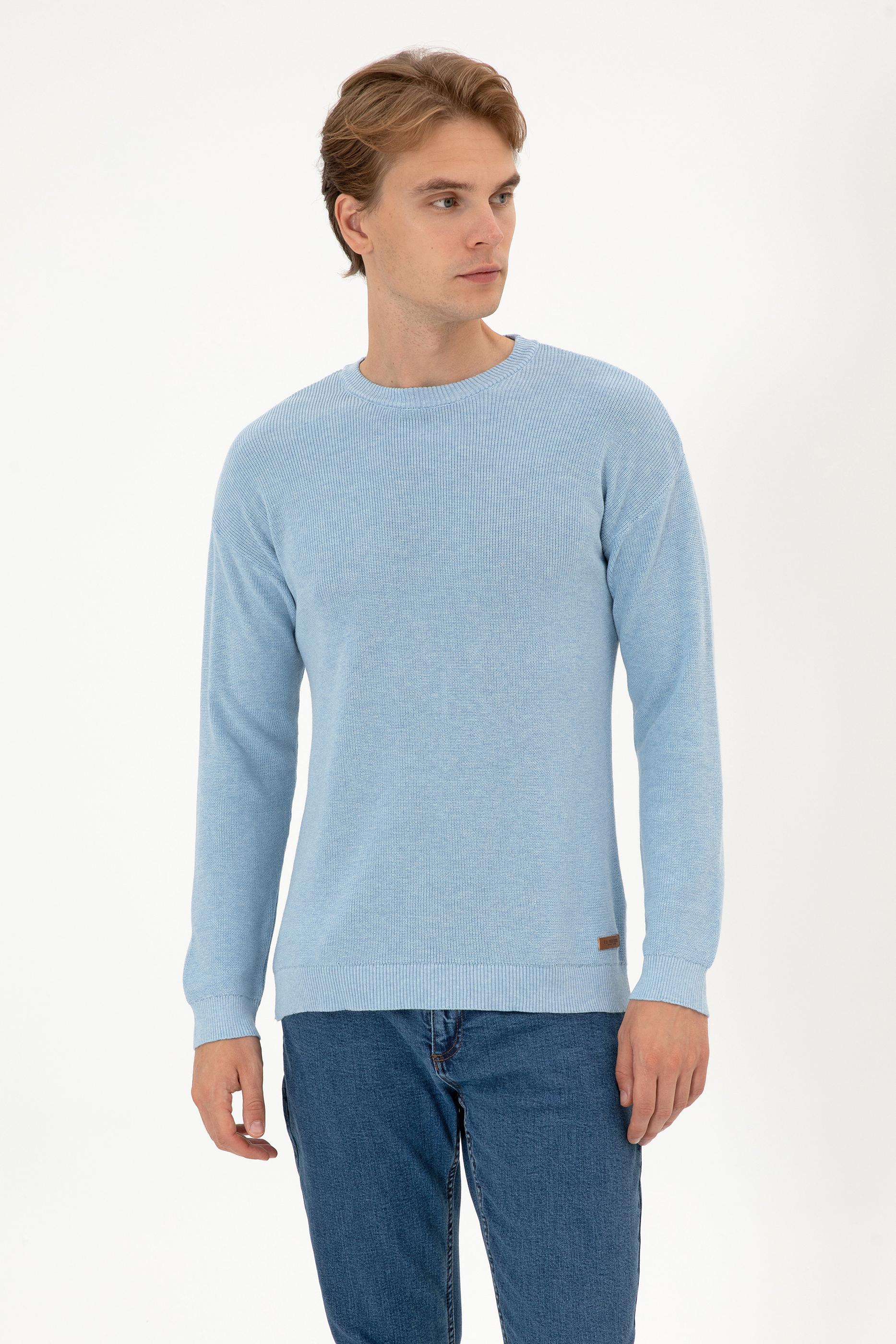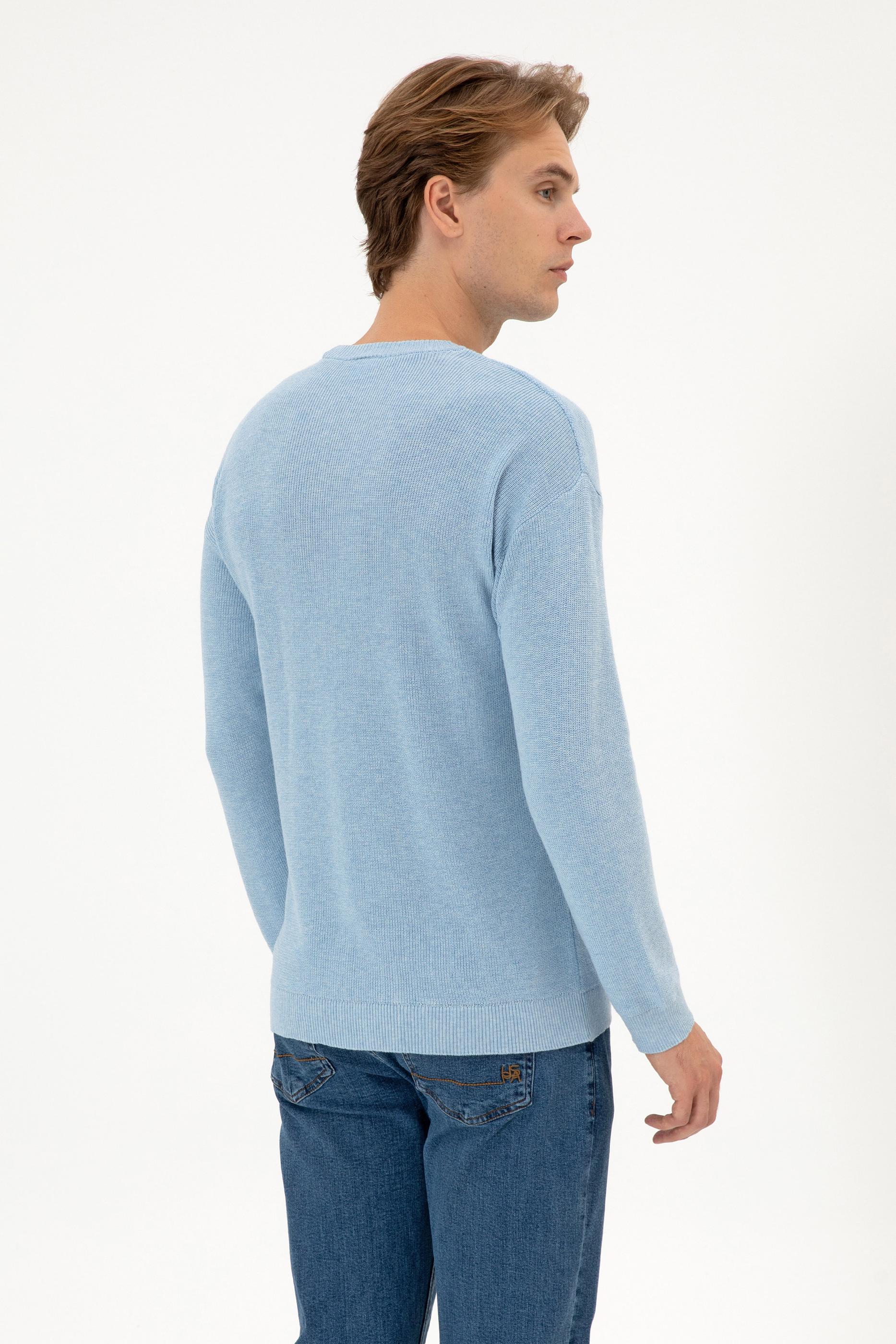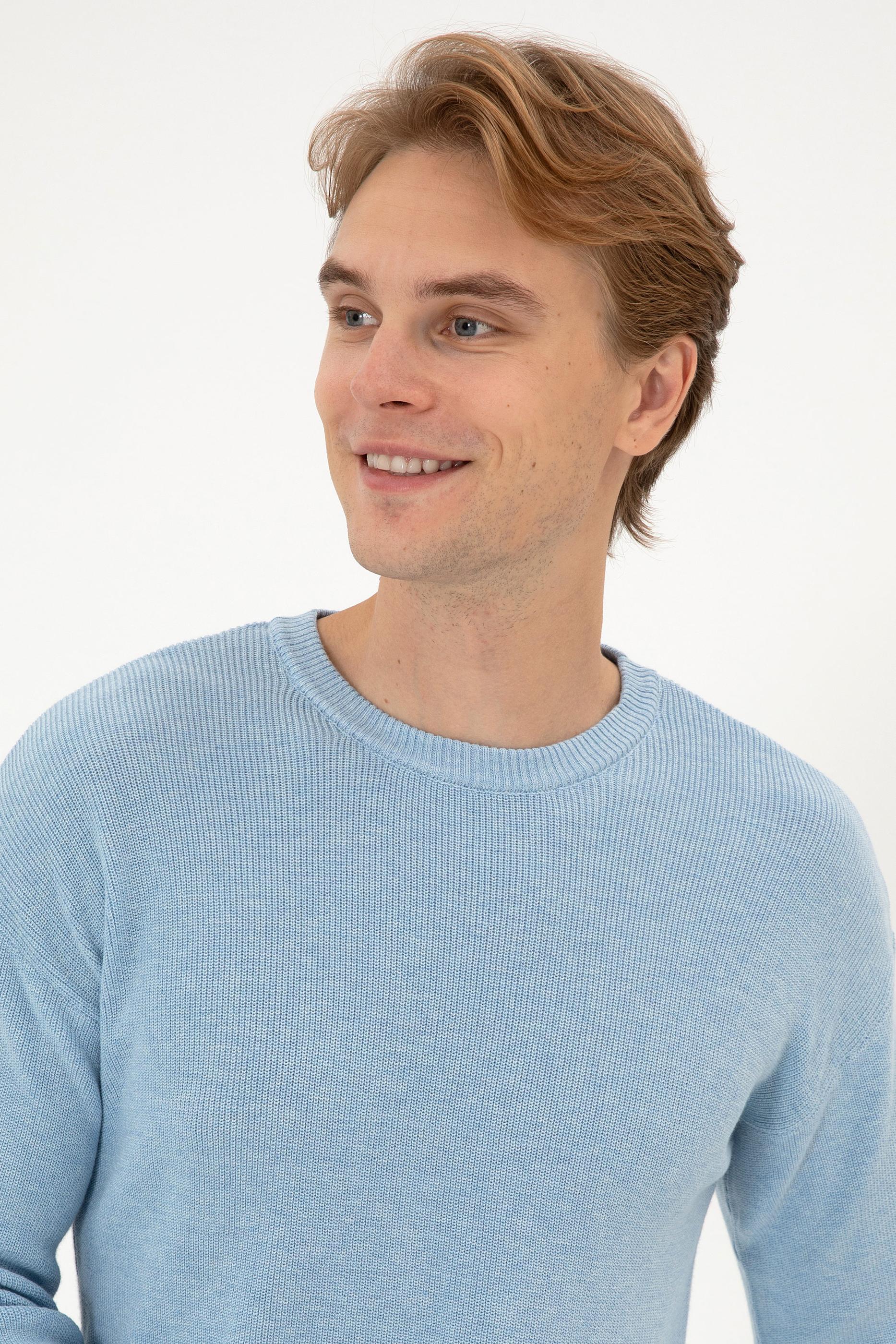 - Erkek Comfort Fit Bisiklet Yaka Açık Mavi Melanj Basic Kazak