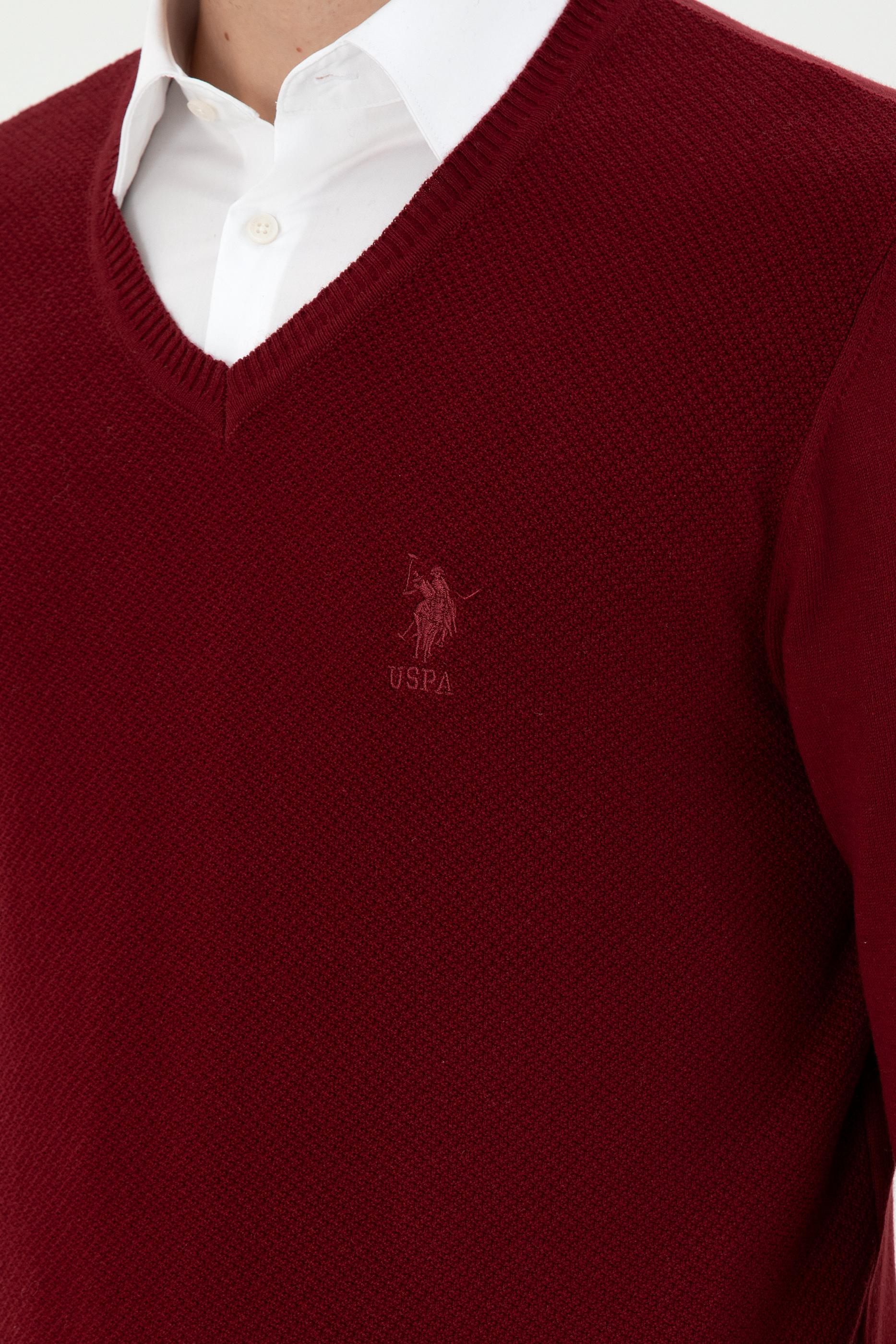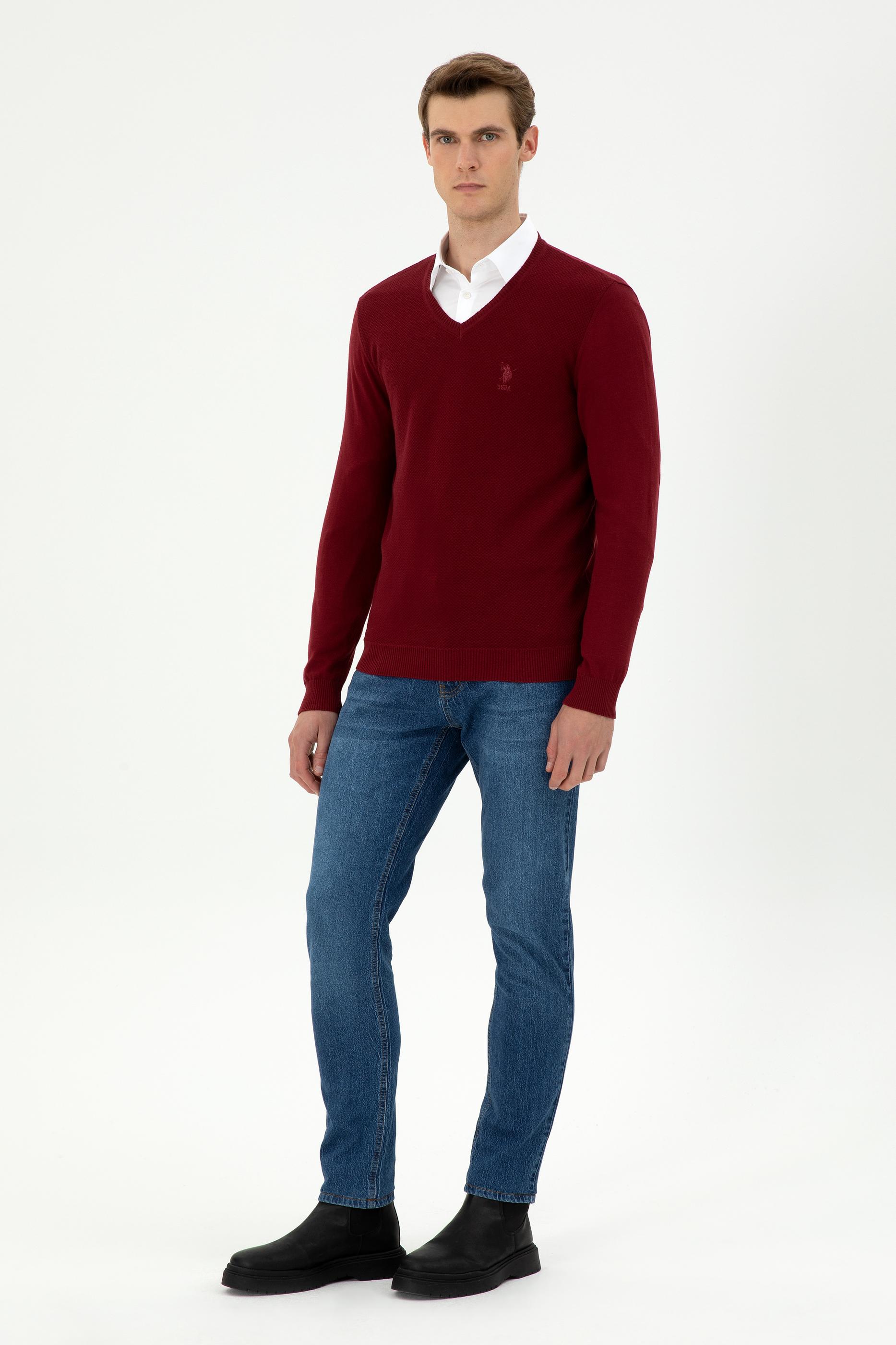 - Erkek Slim Fit V Yaka Bordo Basic Kazak