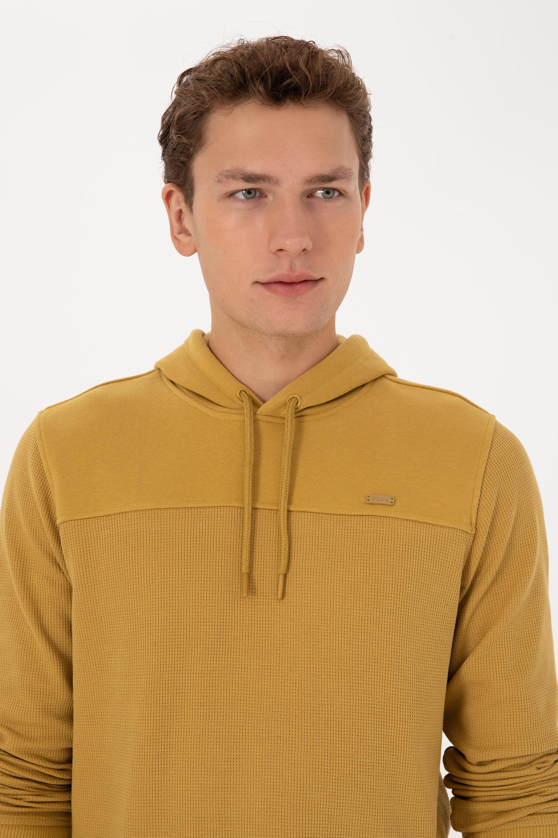 Erkek Regular Fit Kapüşonlu Petek Dokulu Hardal Sweatshirt