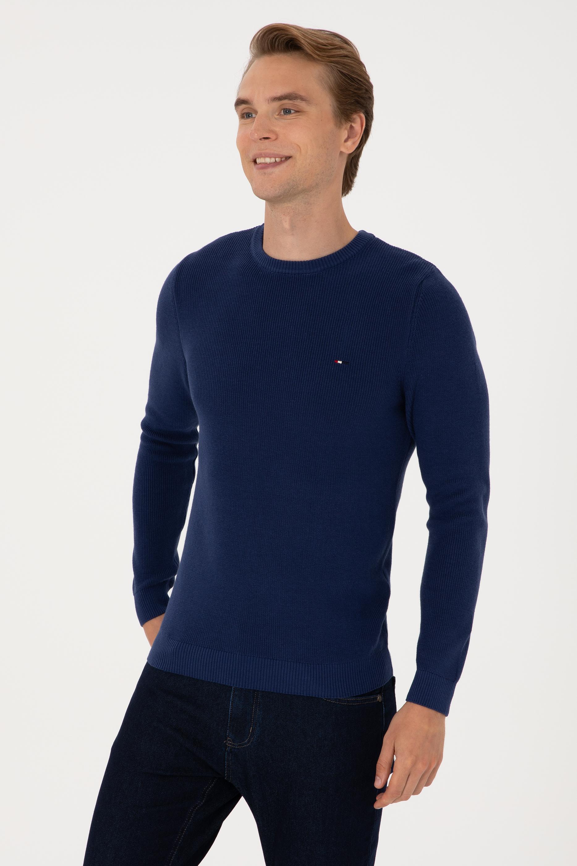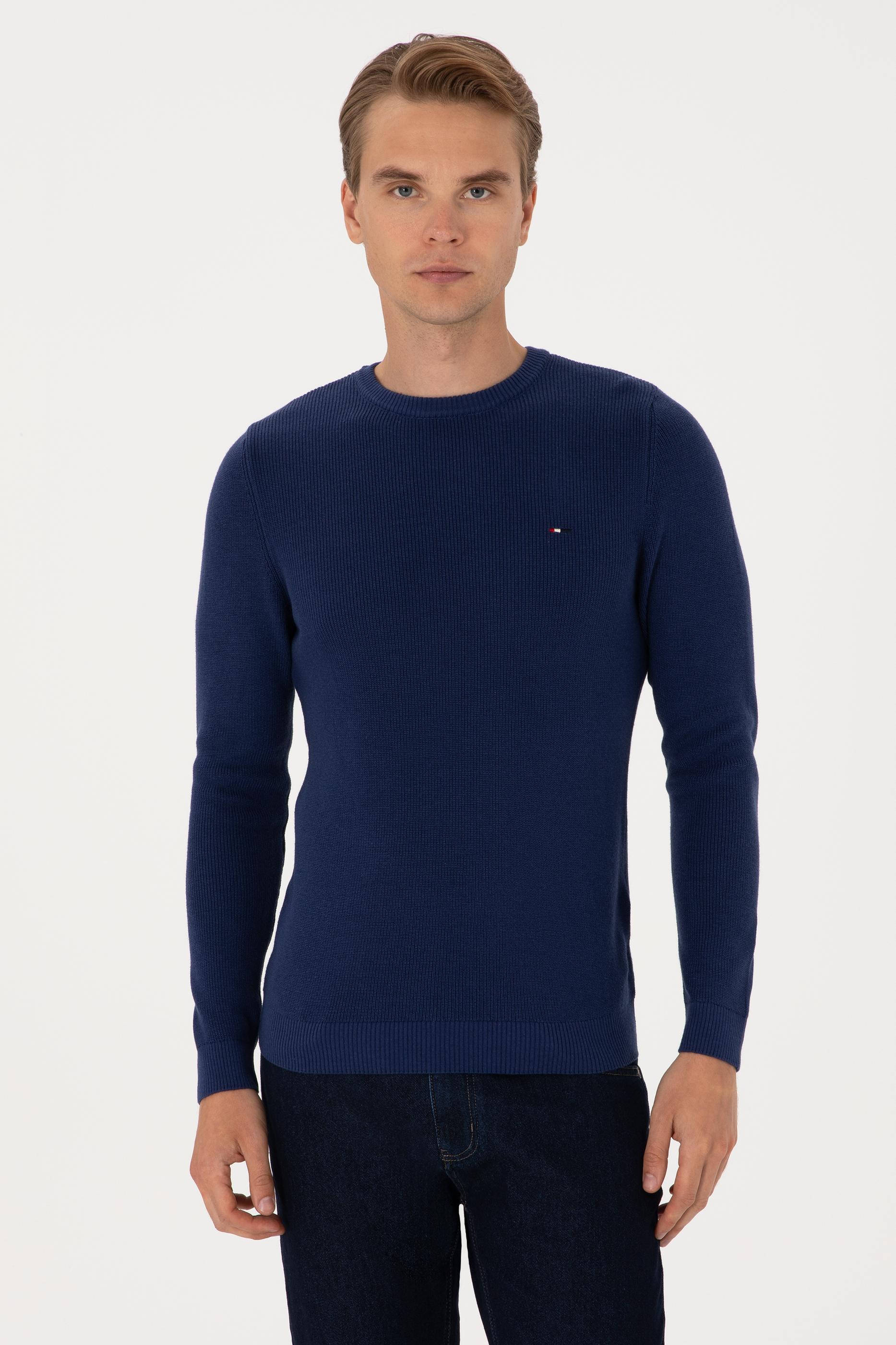 Erkek Slim Fit Bisiklet Yaka İndigo Basic Kazak