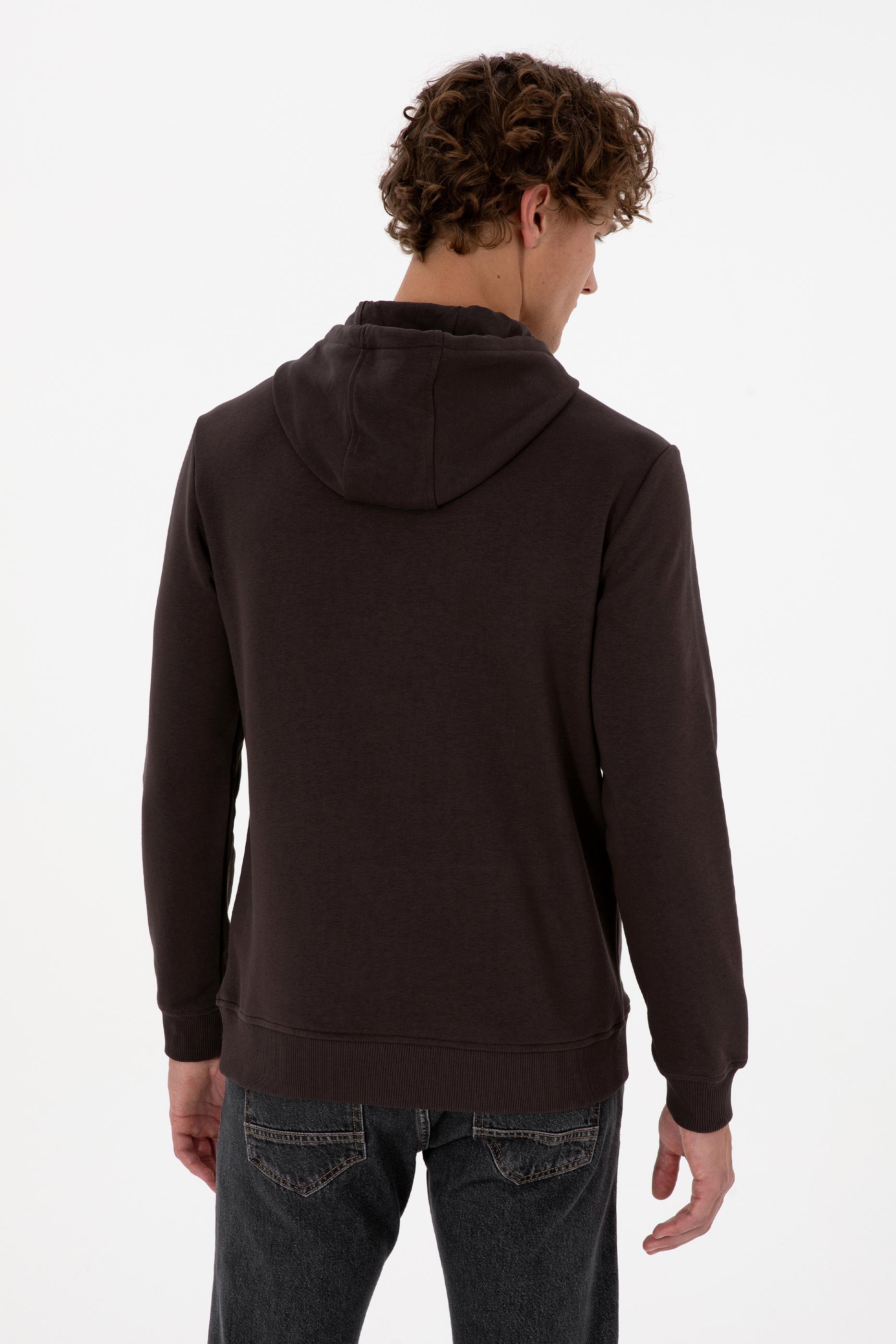 Erkek Regular Fit Kapüşonlu Koyu Kahverengi Basic Sweatshirt