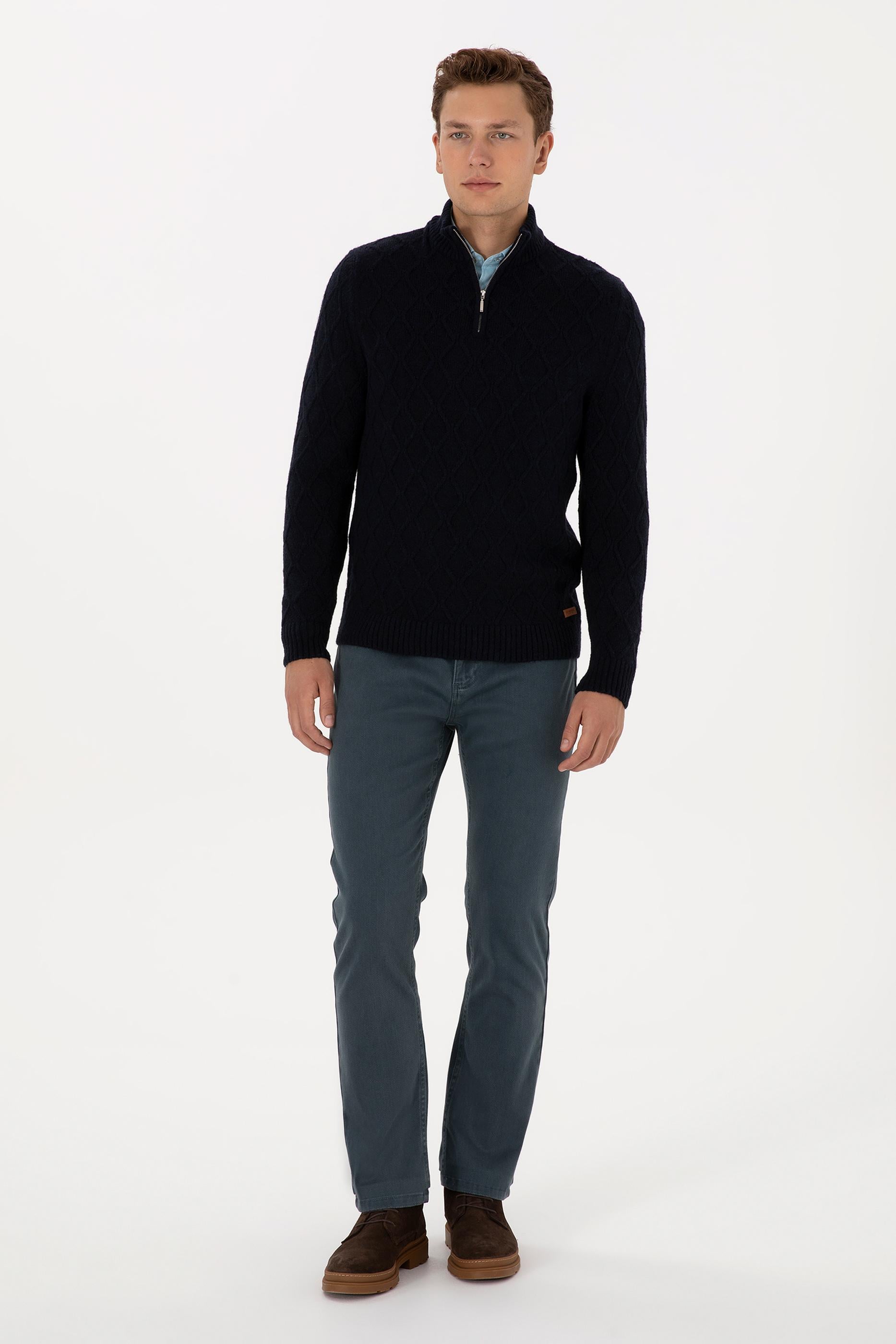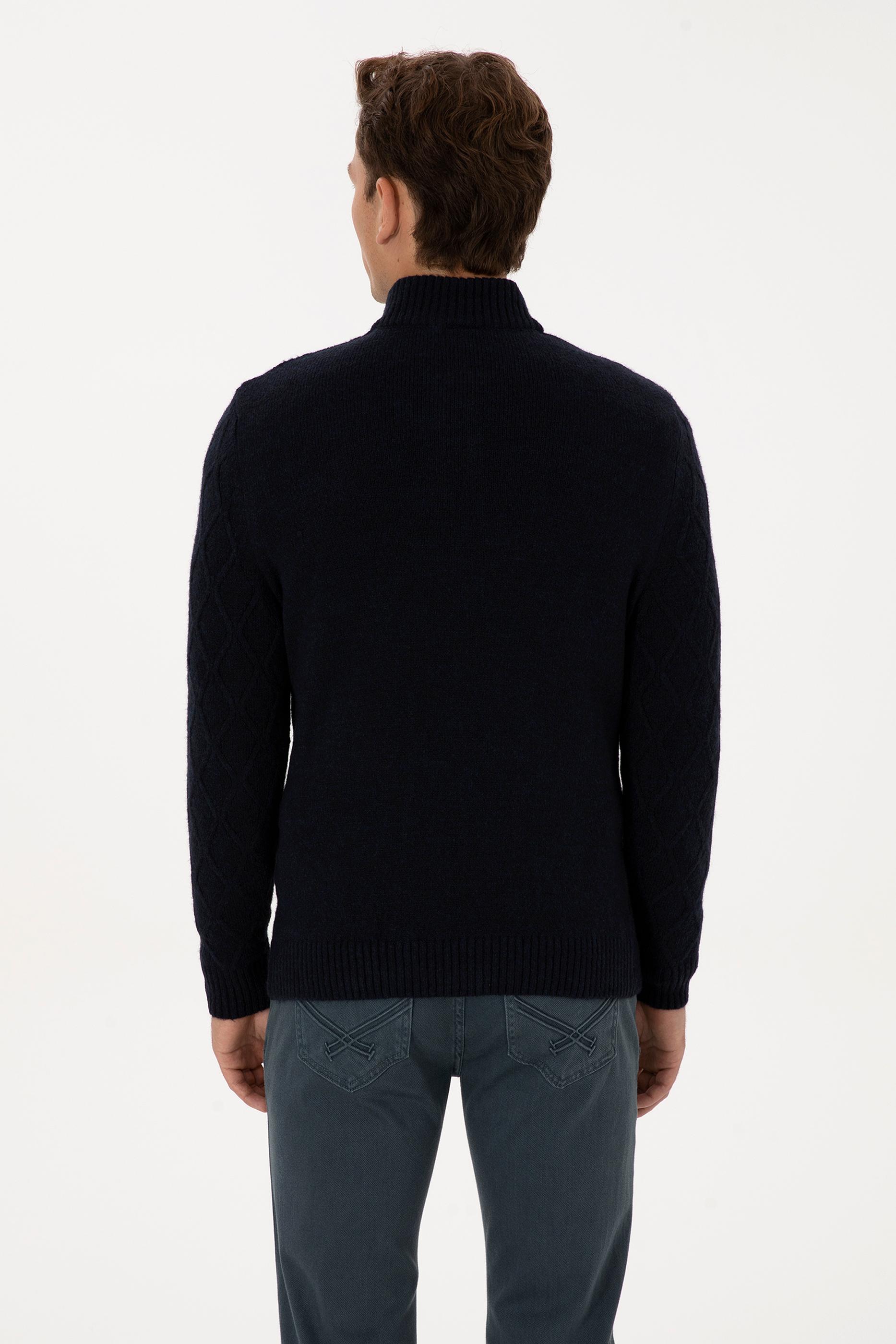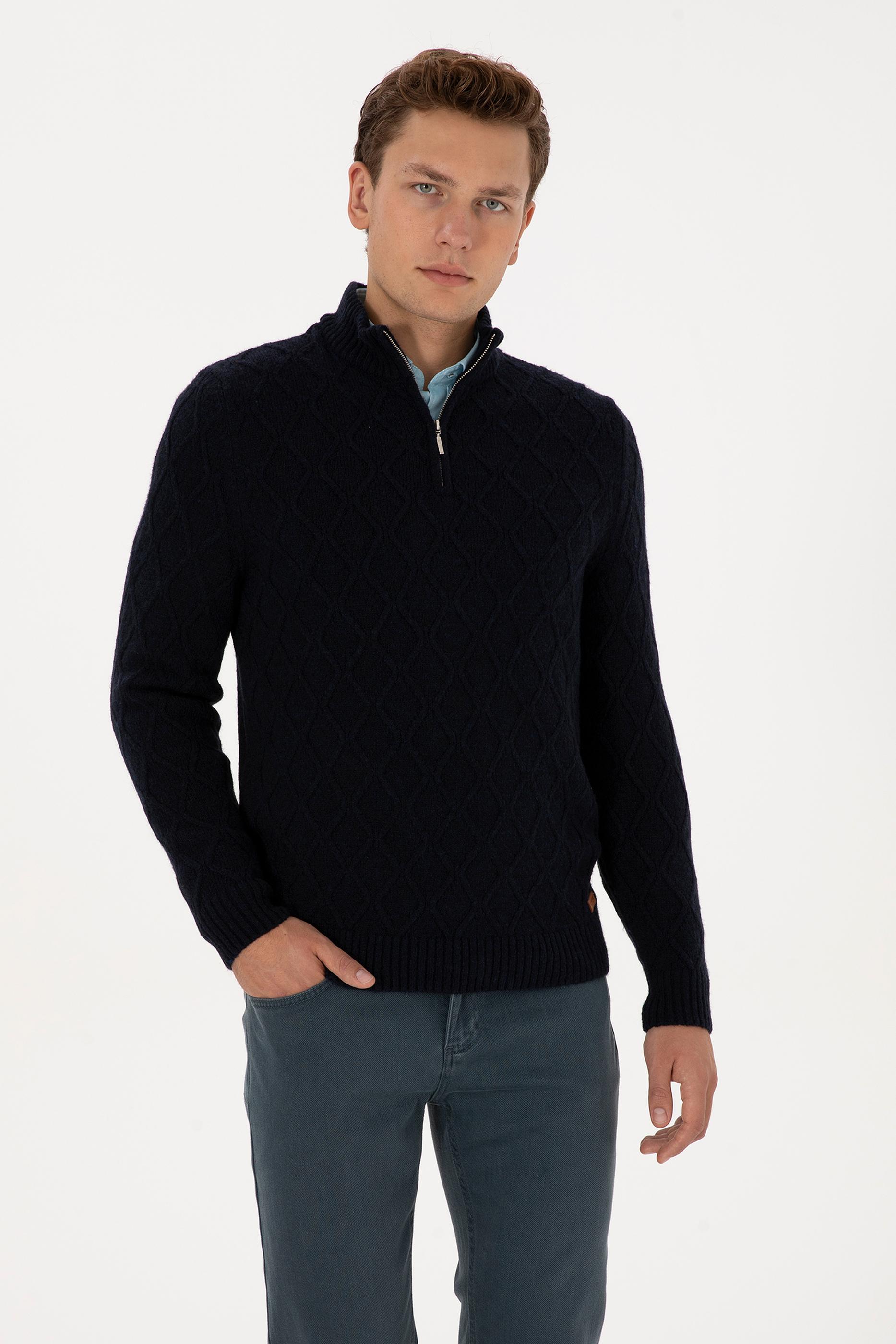 - Erkek Regular Fit Yarım Fermuarlı Desenli Lacivert Kazak