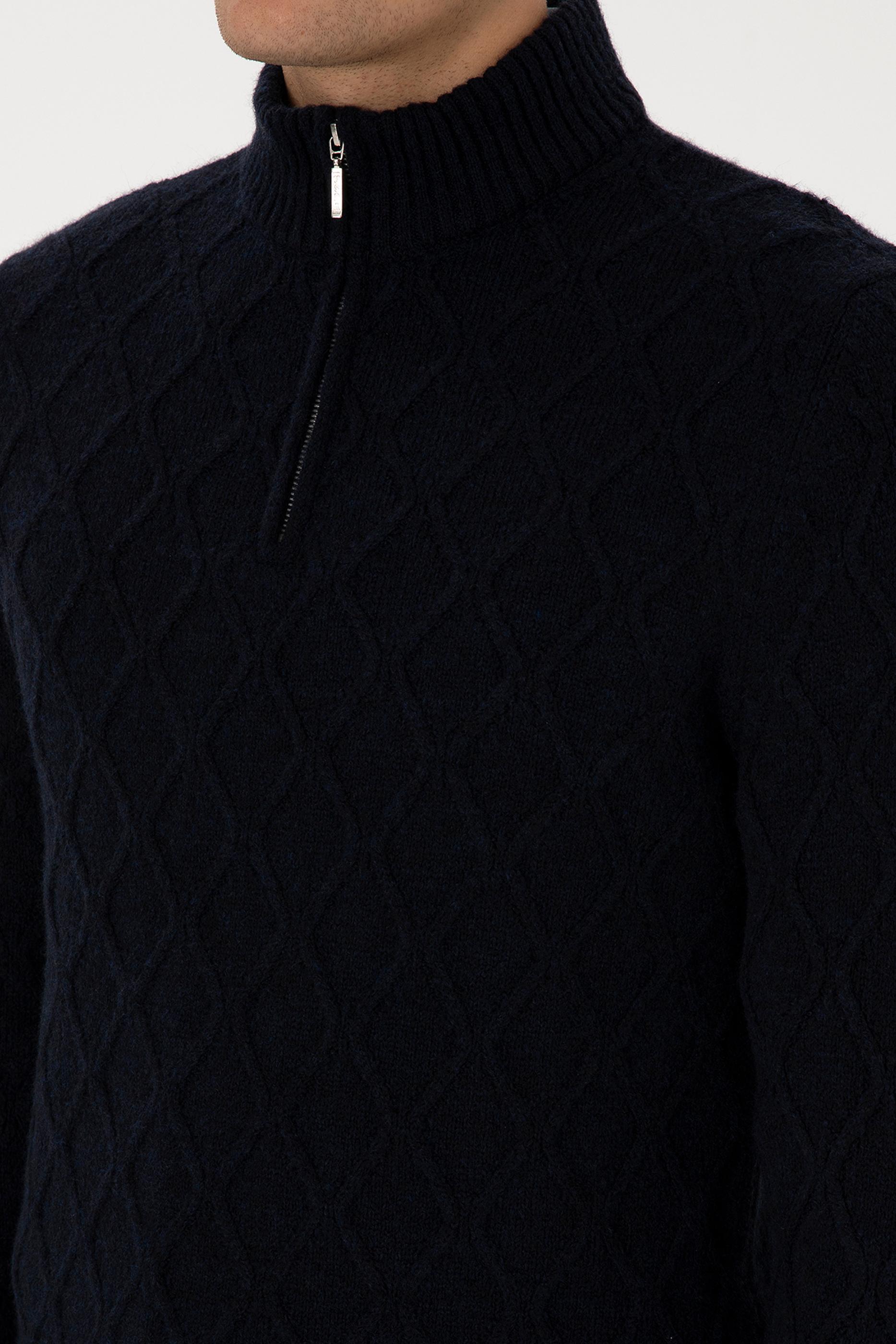 Erkek Regular Fit Yarım Fermuarlı Desenli Lacivert Kazak