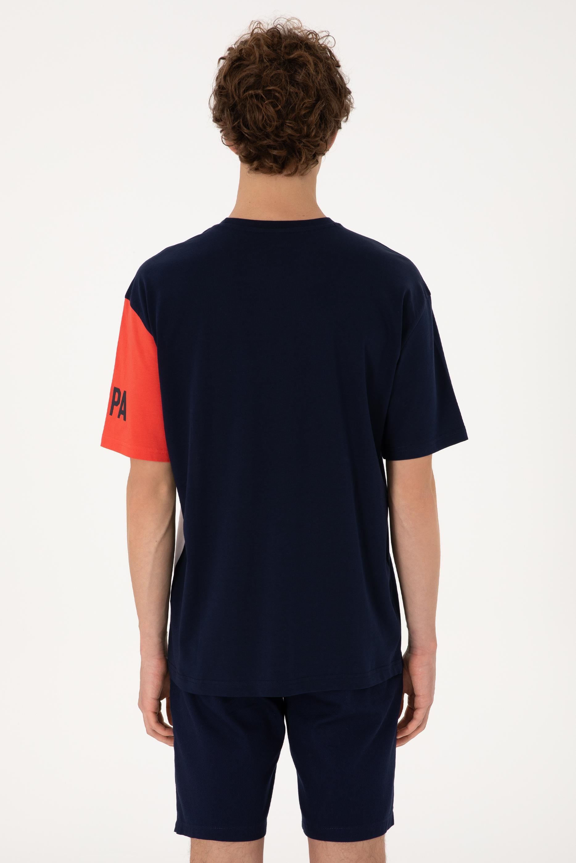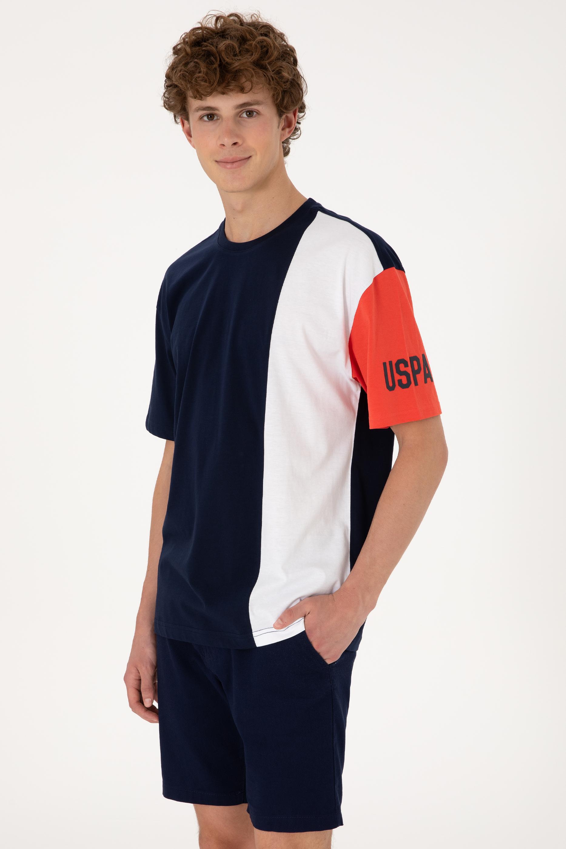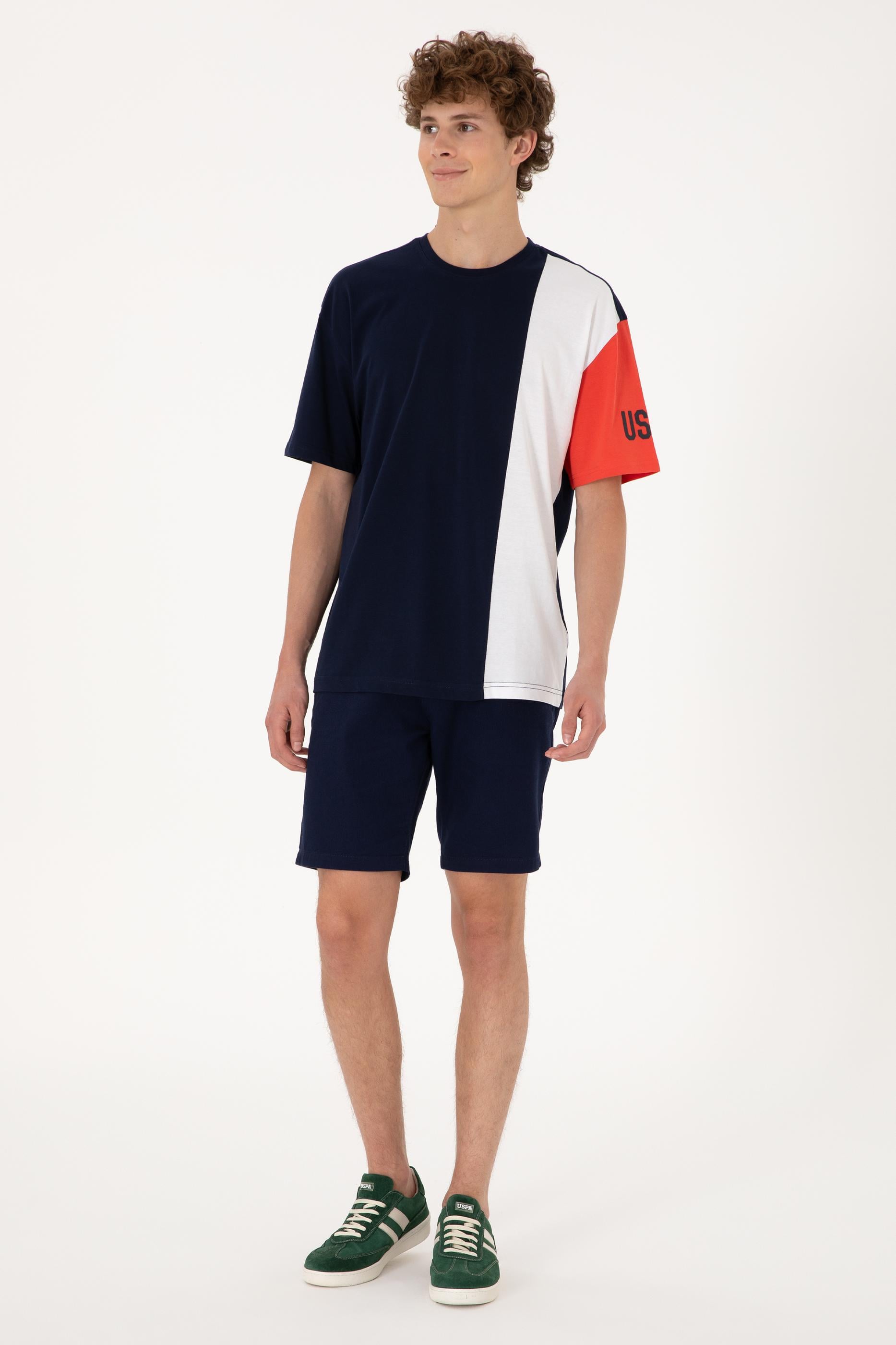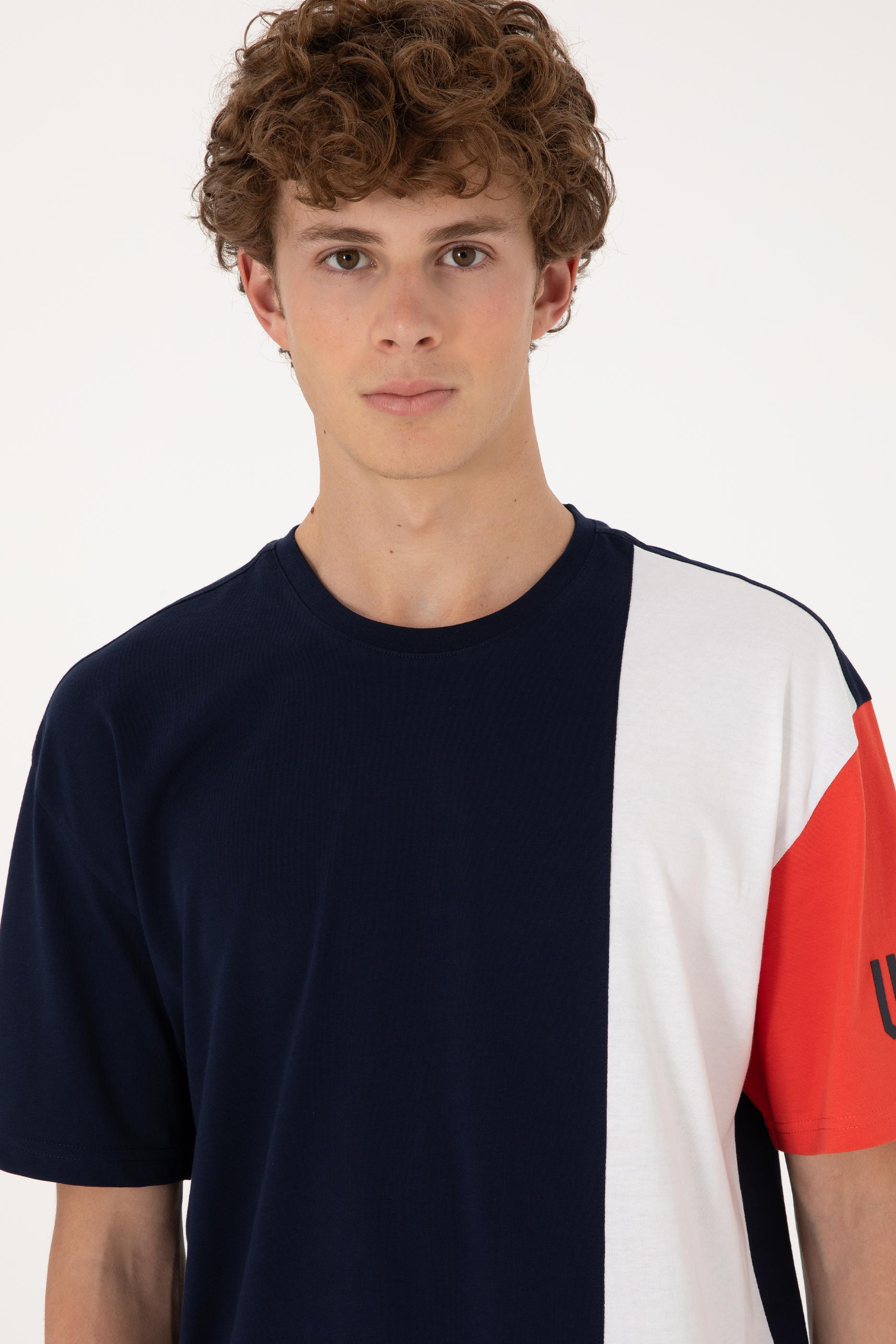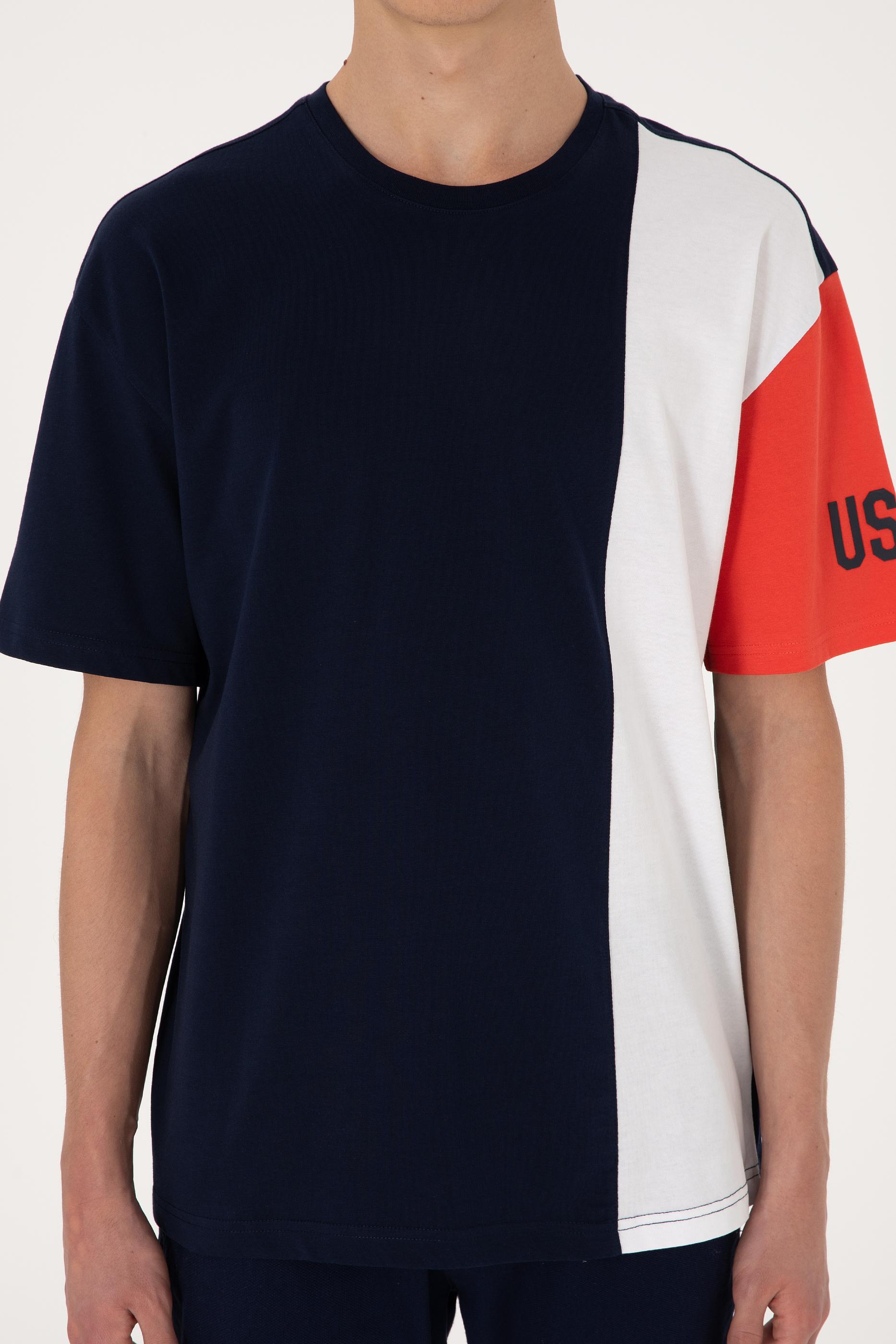 U.S. Polo Assn. tasarımı bu lacivert tişört, blok renk geçişleriyle dinamik ve çağdaş bir görünüm sunar. %100 pamuklu dokusu sayesinde ciltle uyumlu, nefes alabilir ve yumuşak bir yapı sunan model, comfort fit kalıbıyla gün boyu rahat hareket etmeyi mümkün kılar. Sol koldan başlayan ve omuzu aşarak gövdeye kadar inen mavi tonlar, sade formu dengeli şekilde hareketlendirir. Bisiklet yaka detayı klasik görünümünü korurken, modern blok tasarımıyla günlük kombinlere yenilikçi bir hava katar. Şort, eşofman veya jean'lerle kolayca kombinlenebilen bu tişört; konfor ve stilin bir arada arandığı günler için ideal bir seçimdir.