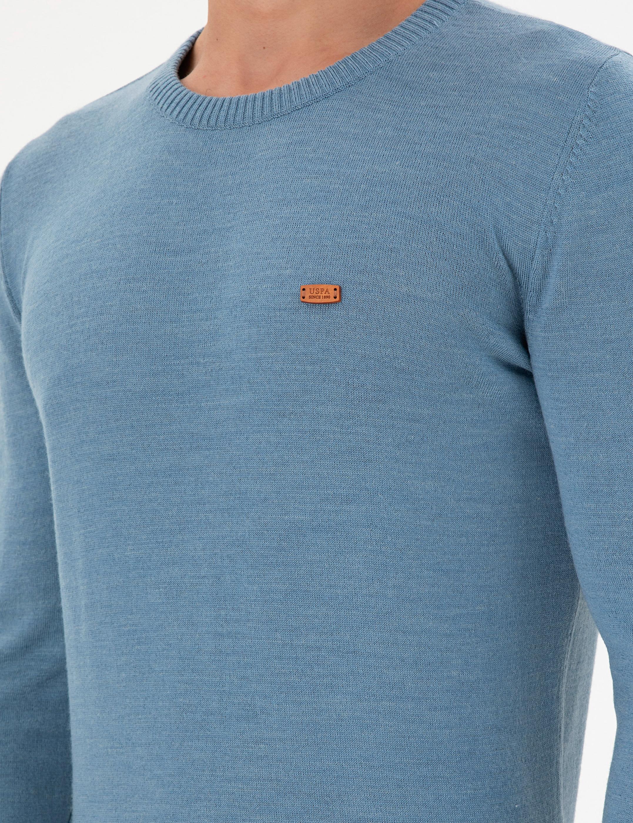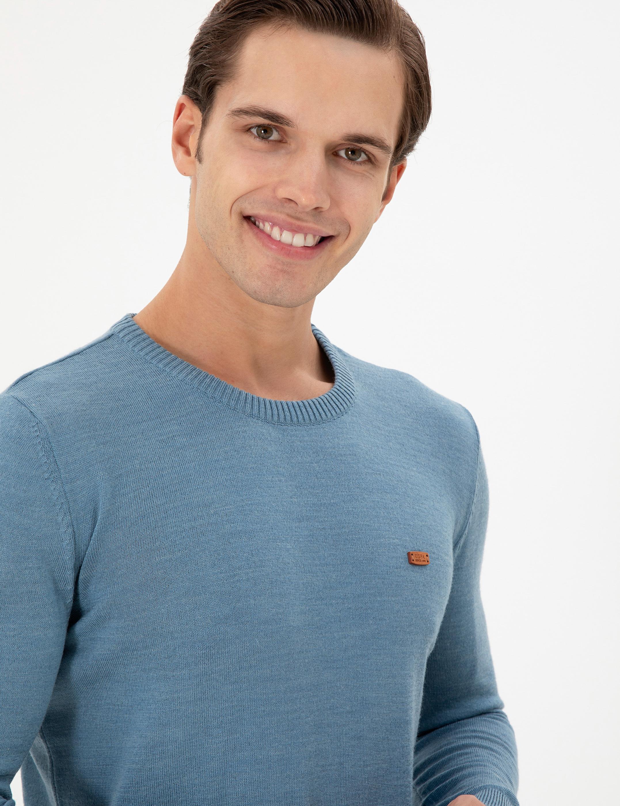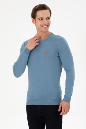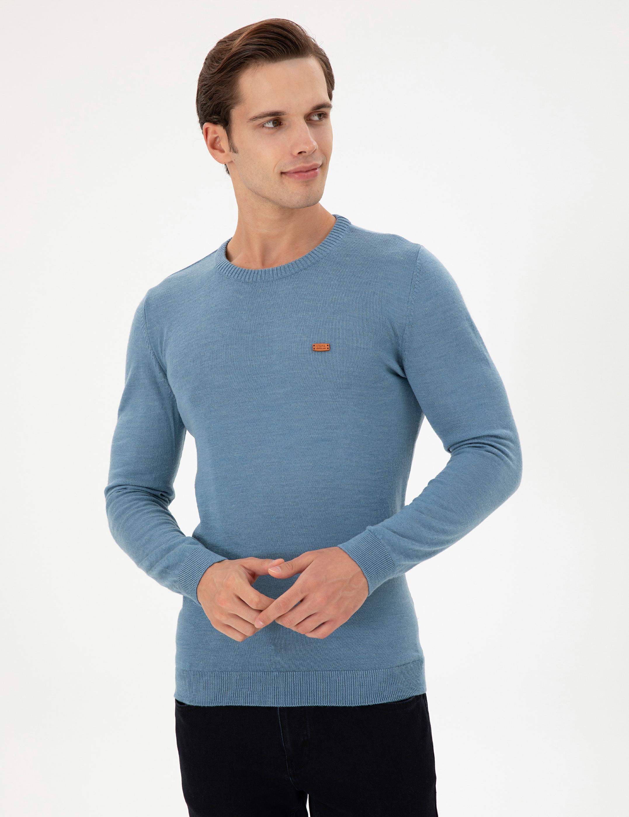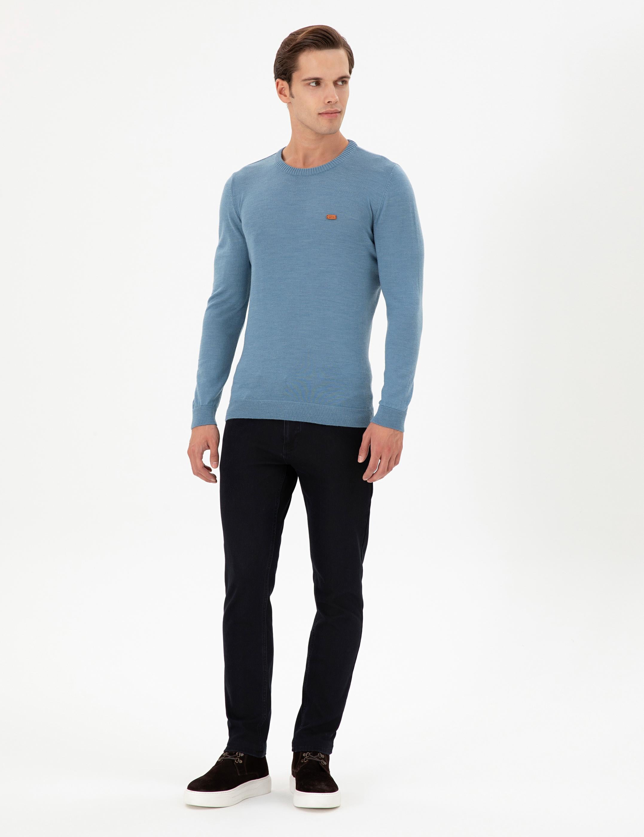 Erkek Slim Fit Bisiklet Yaka Mavi Kazak