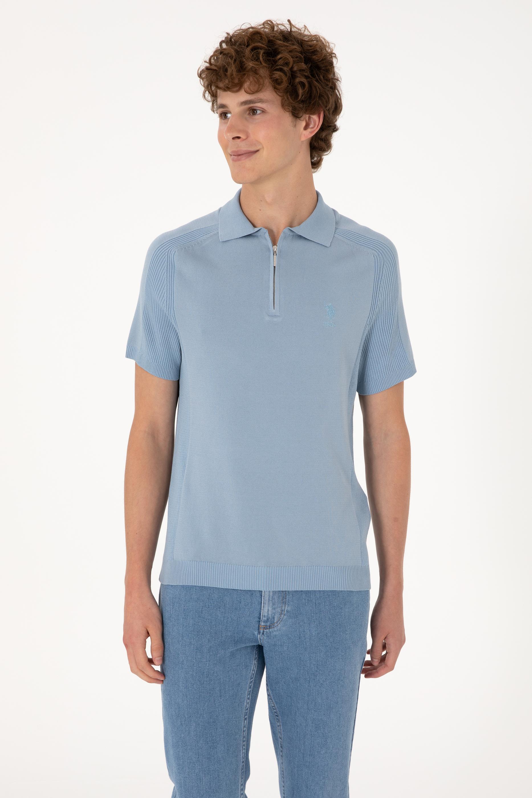 - Erkek Slim Fit Fermuarlı Mavi Triko Tişört