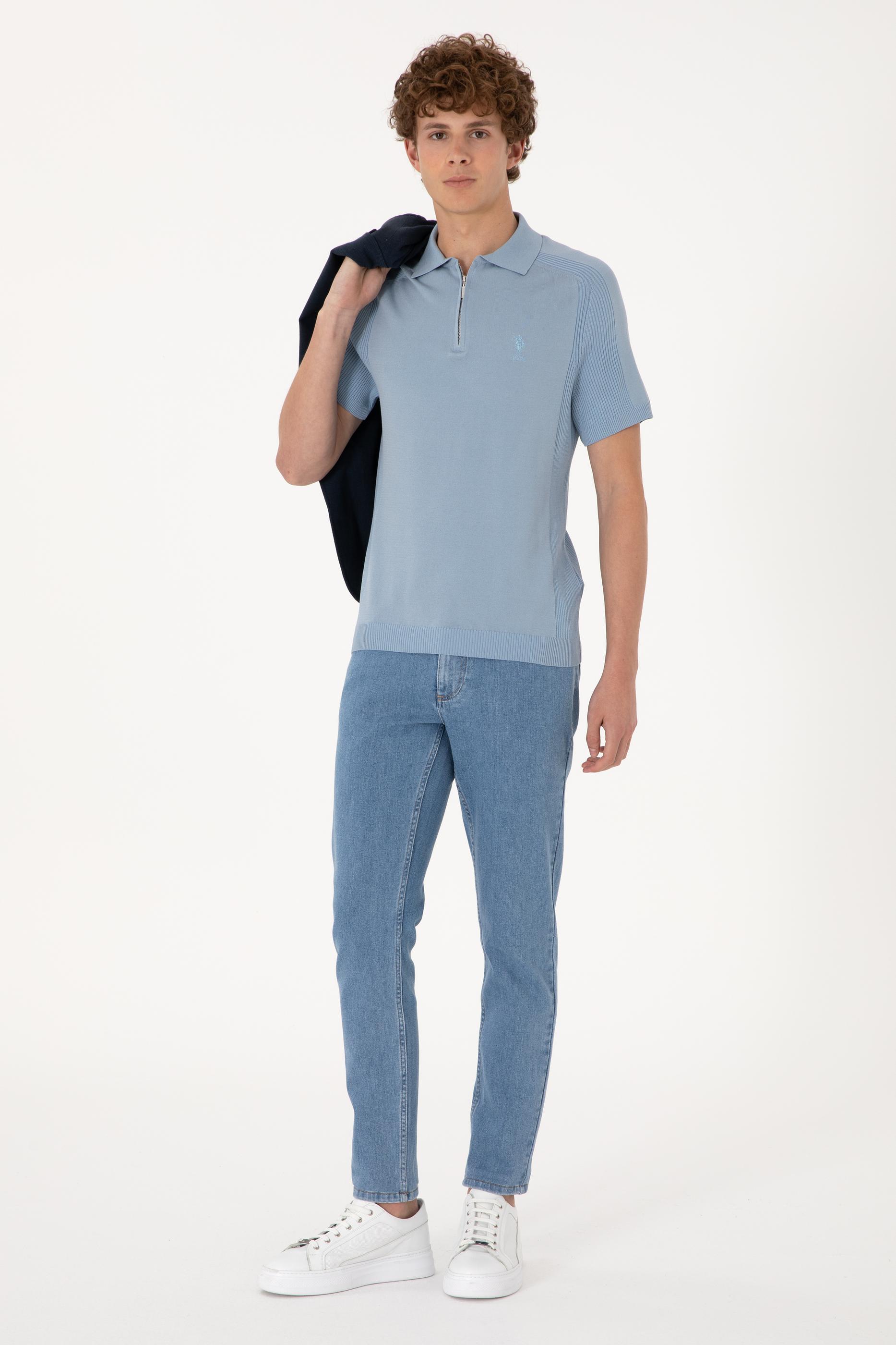 Erkek Slim Fit Fermuarlı Mavi Triko Tişört
