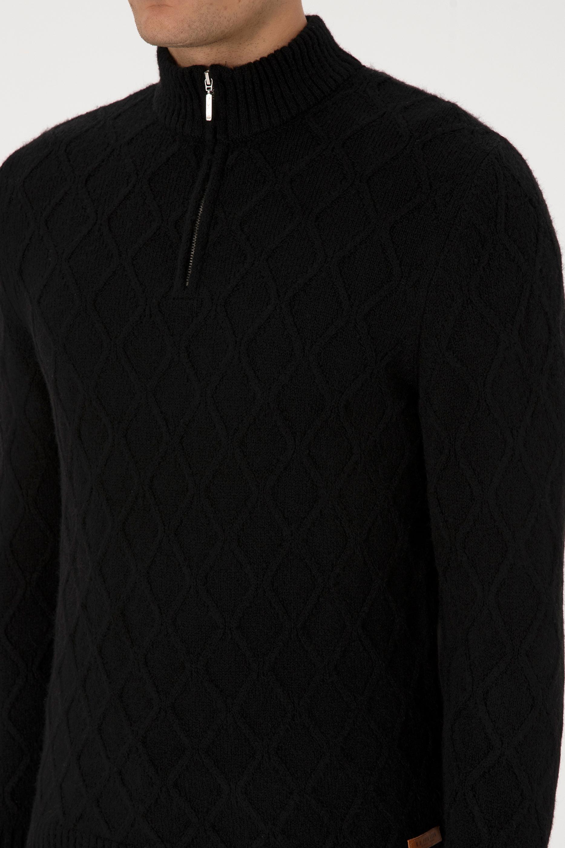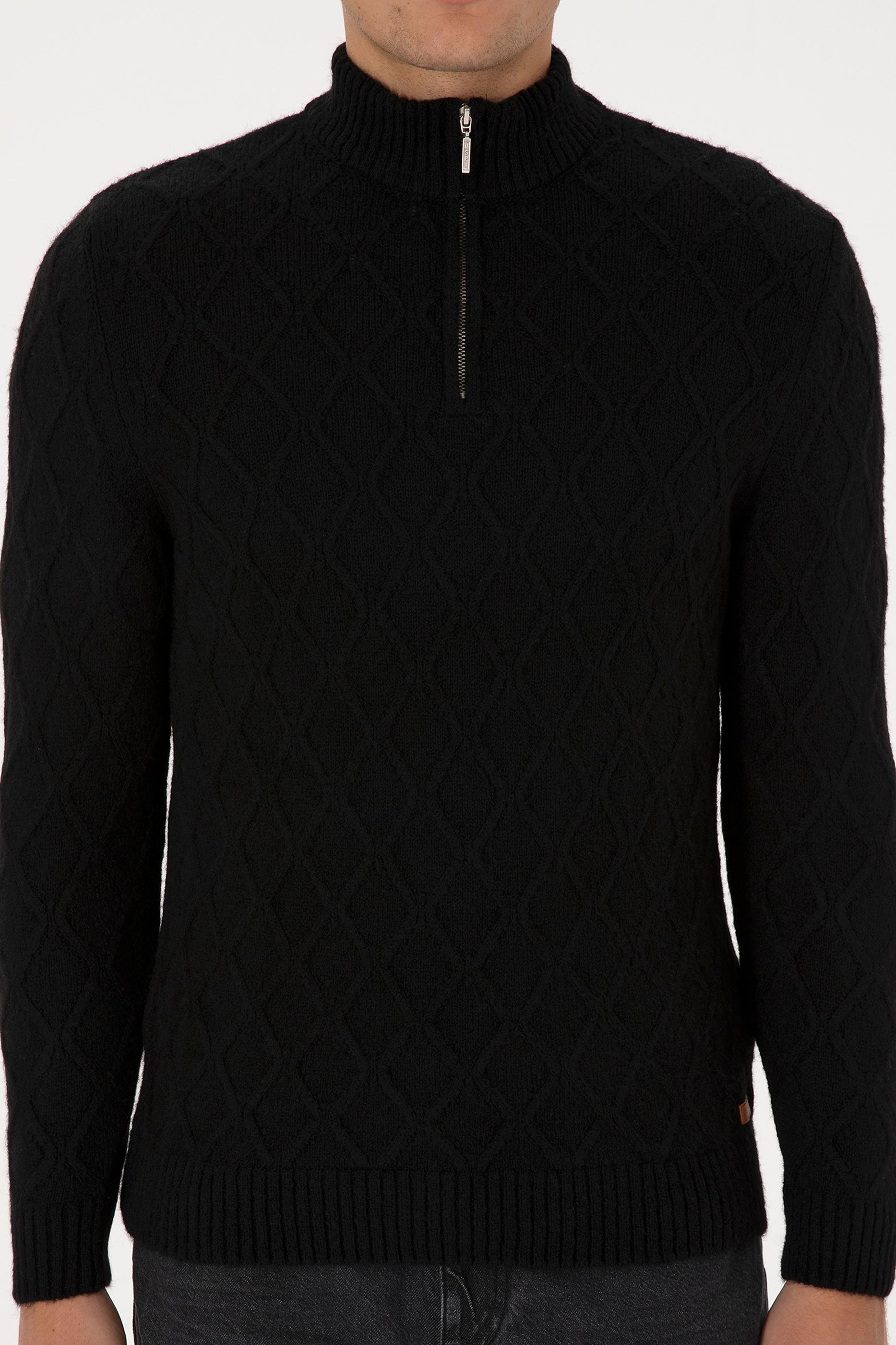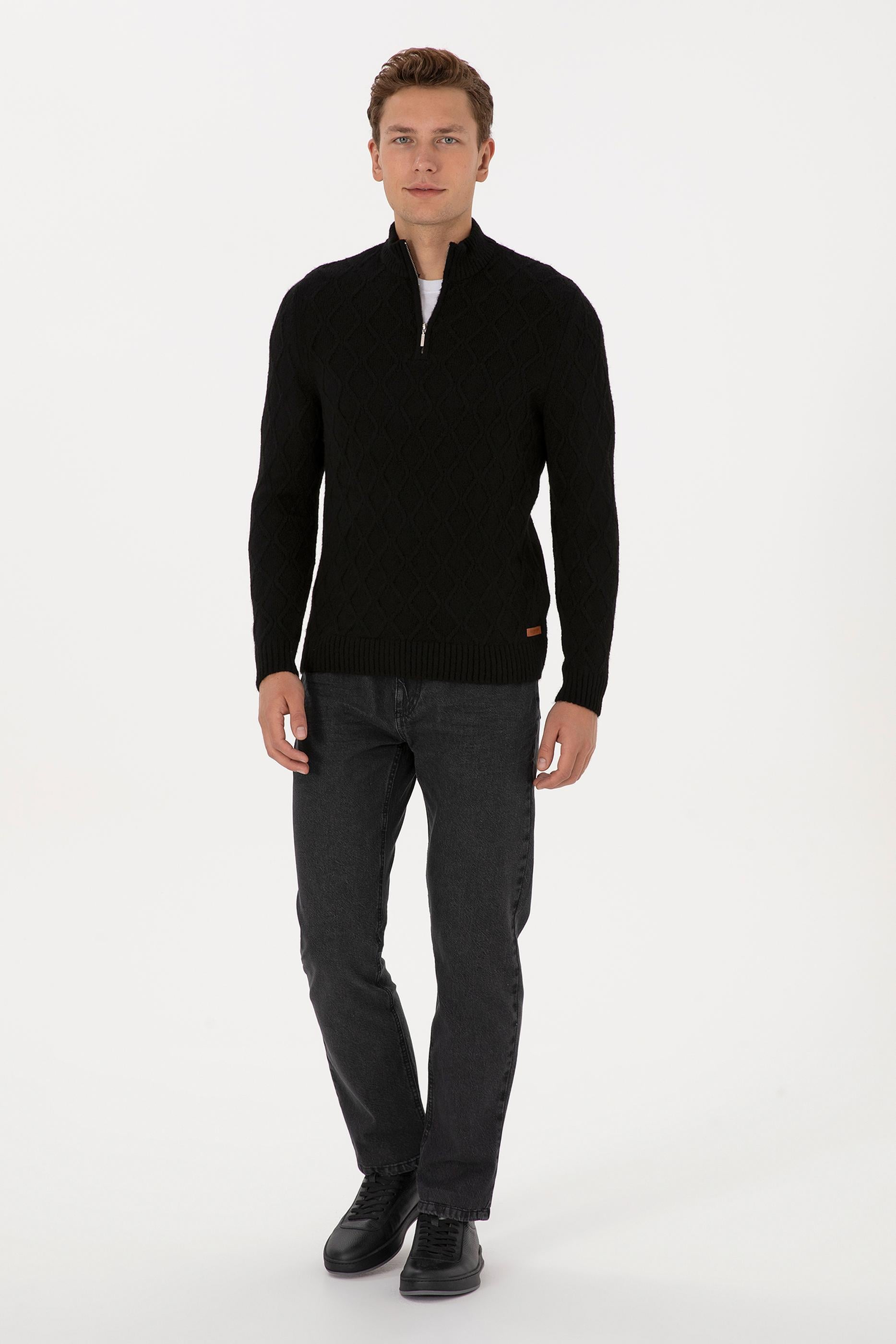 - Erkek Regular Fit Yarım Fermuarlı Desenli Siyah Kazak