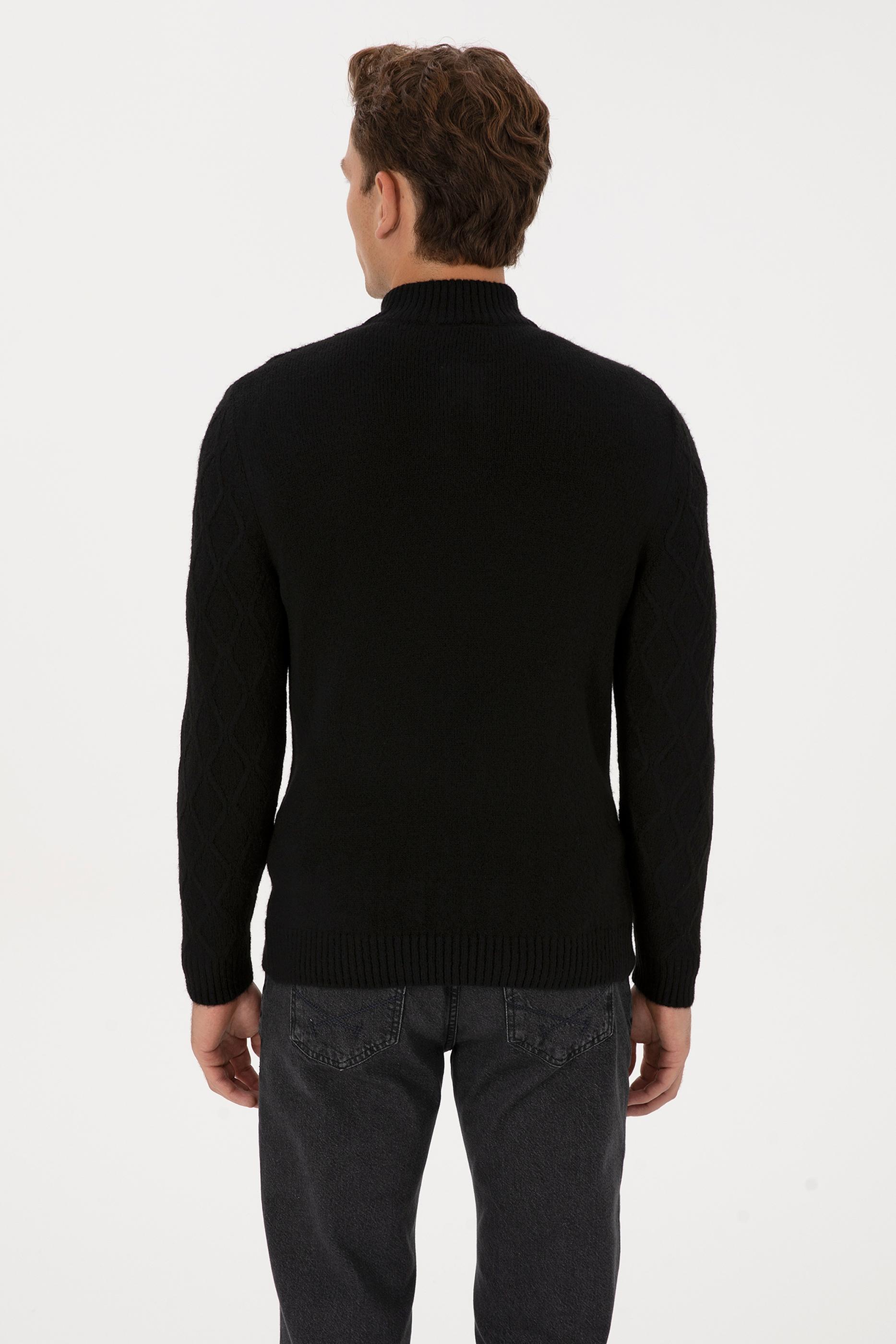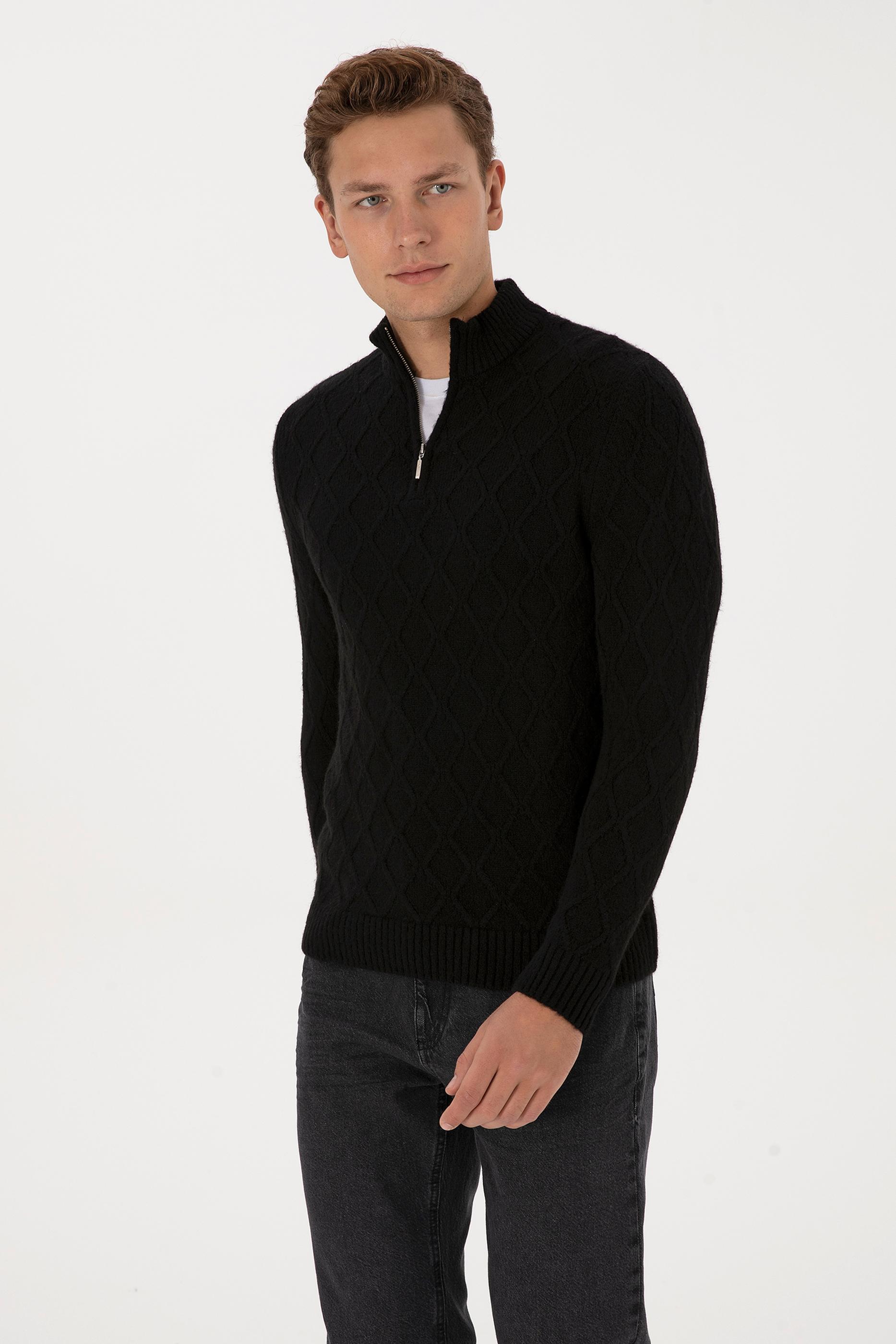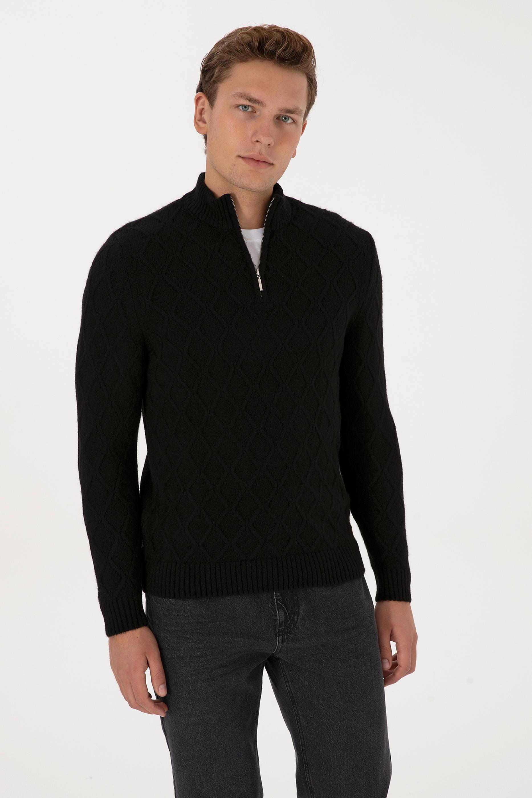 - Erkek Regular Fit Yarım Fermuarlı Desenli Siyah Kazak