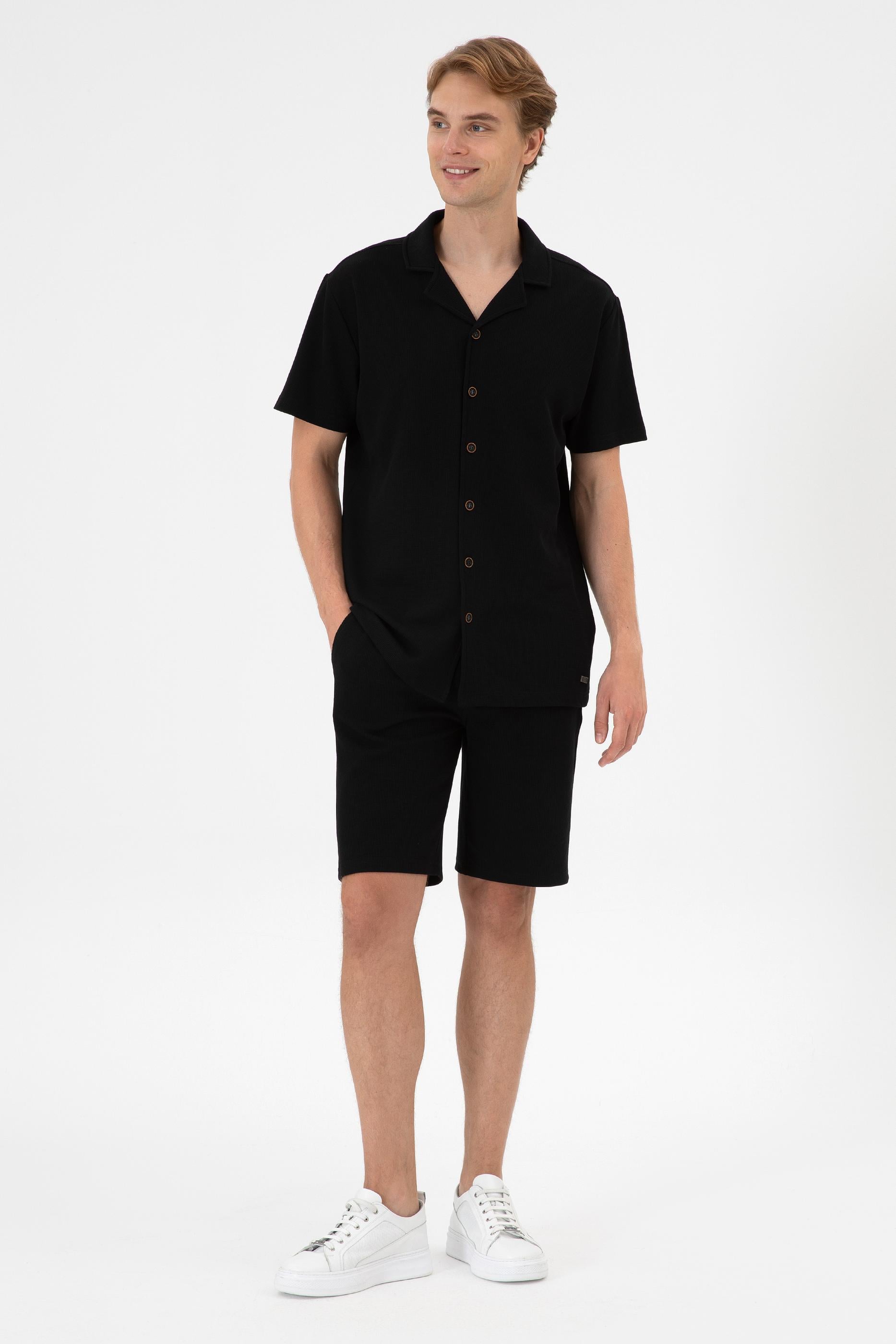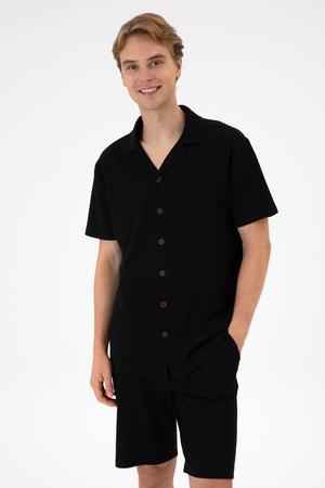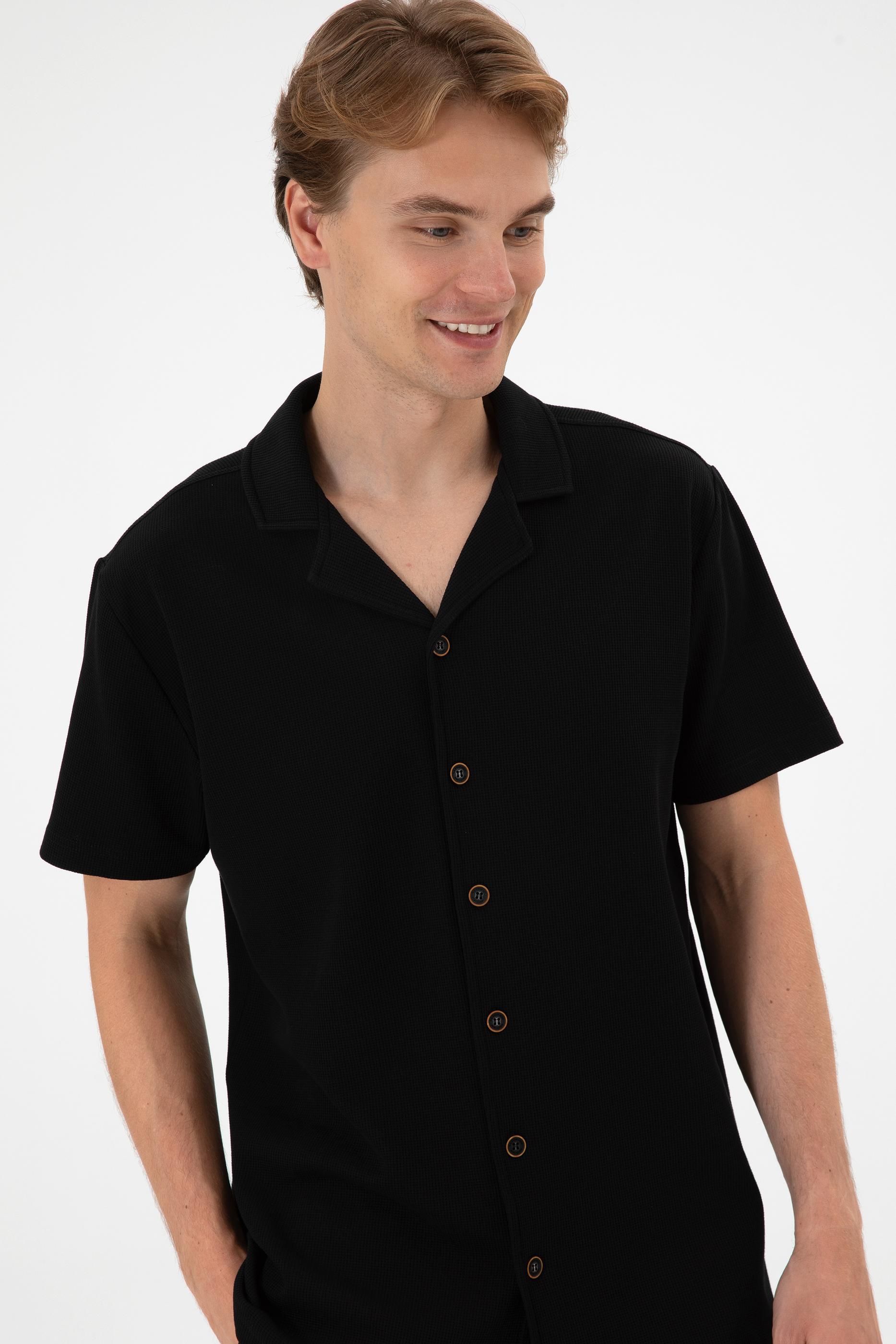 Erkek Siyah Apaş Yaka Kısa Kollu Örme Gömlek