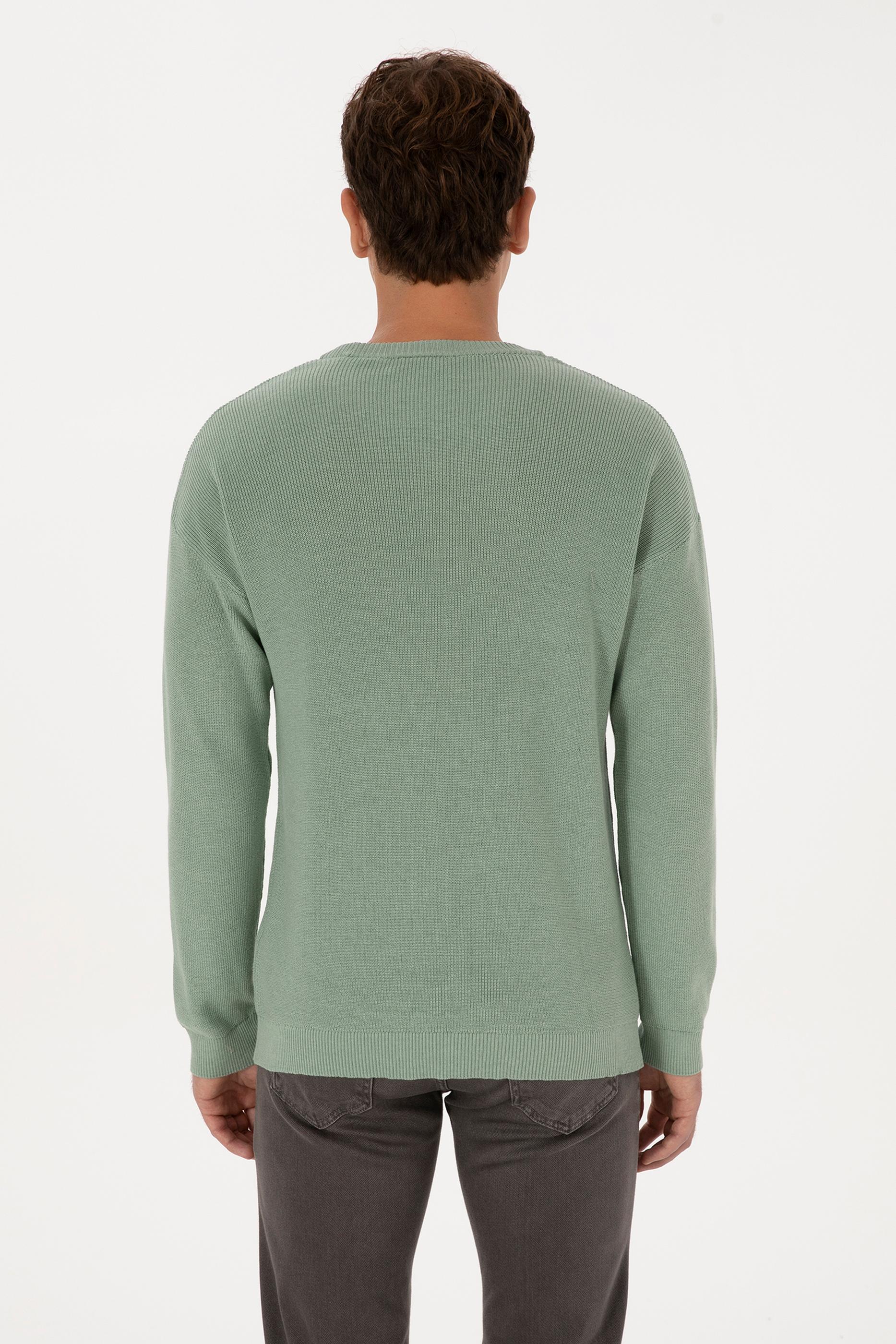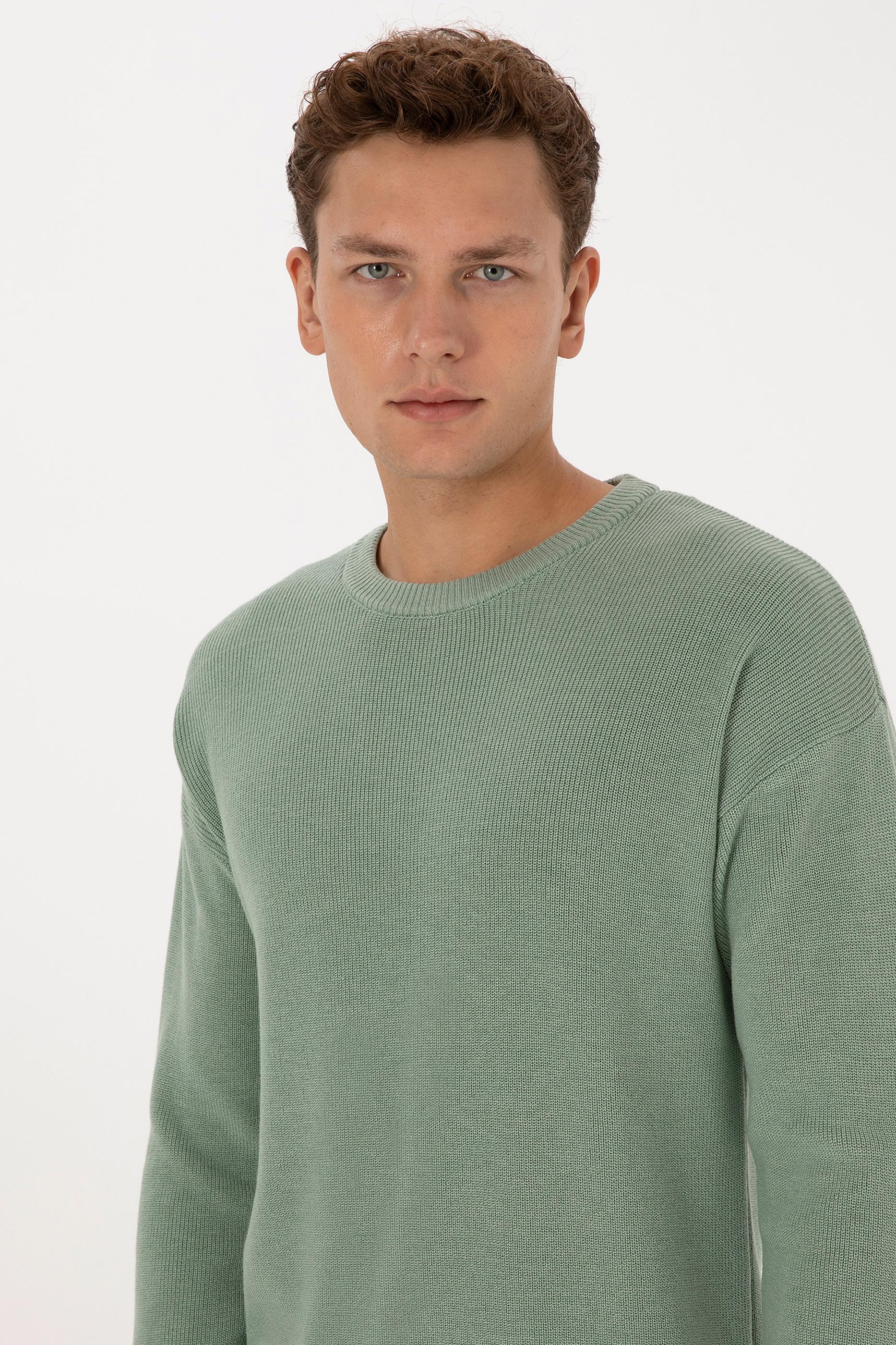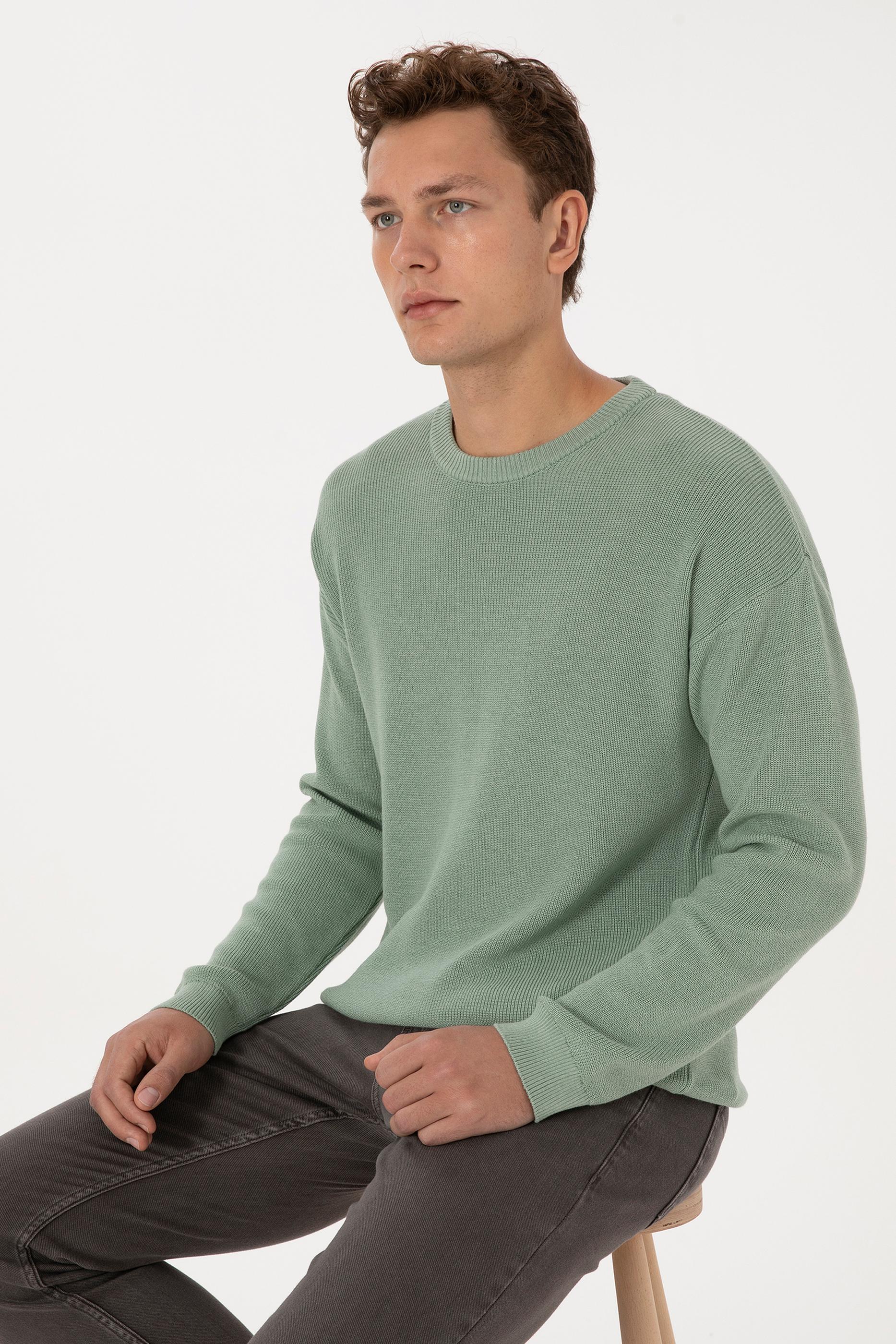 - Erkek Comfort Fit Bisiklet Yaka Yeşil Melanj Basic Kazak