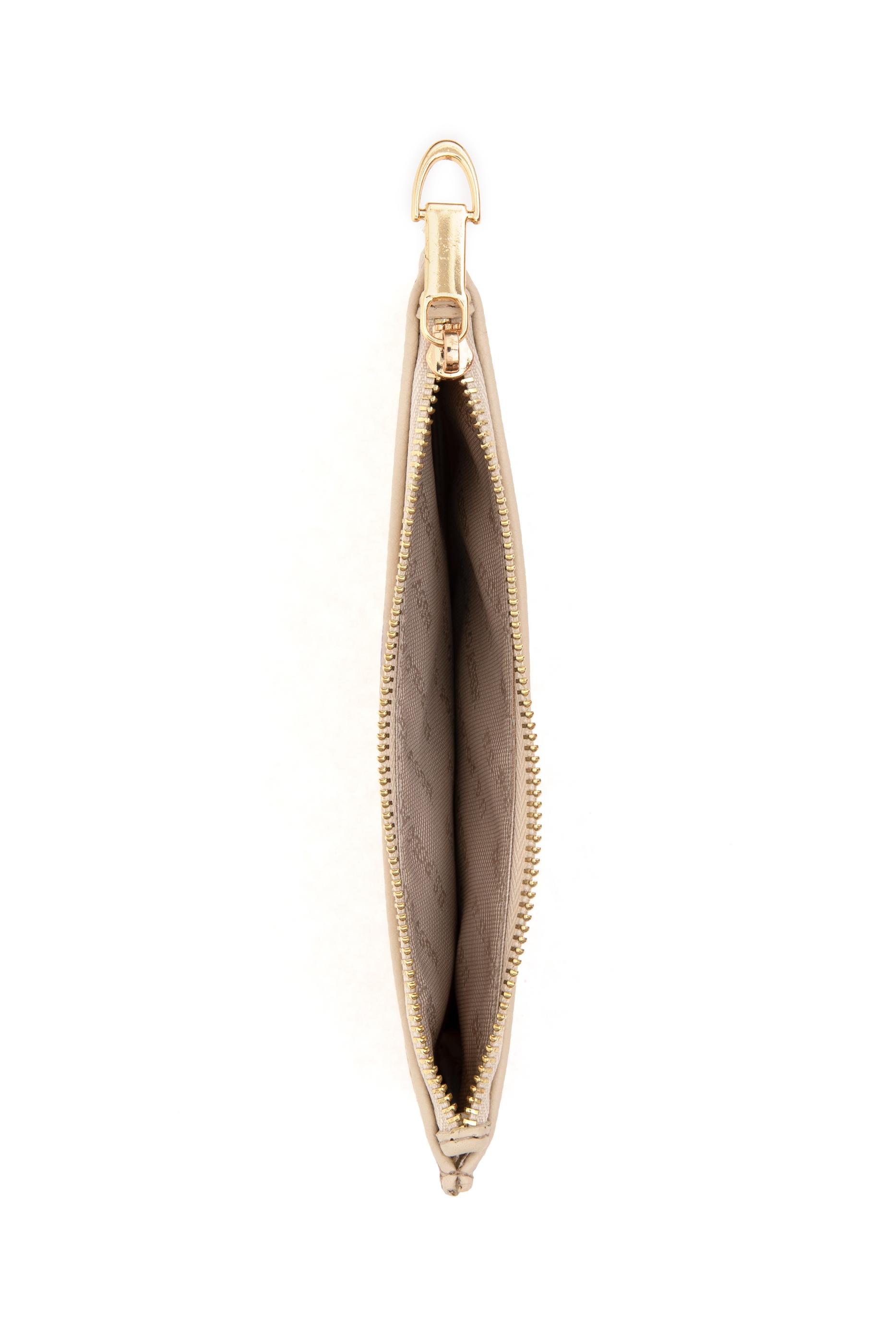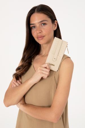 Modern çizgilerle şekillenen bu bej cüzdan, dış yüzeyindeki ince dokulu deseniyle sade şıklığına karakter katıyor. Üst yüzeyine yerleştirilmiş kart bölmeleri, pratik kullanımı ön plana çıkarırken çıtçıt kapamalı şerit detayı güvenli bir kapanış sağlıyor. Zarif formu ve işlevsel düzeniyle hem elde taşımaya hem çantada taşımaya uygun olan bu model, stilini sade ama güçlü aksesuarlarla tamamlamak isteyenler için ideal bir tercih.