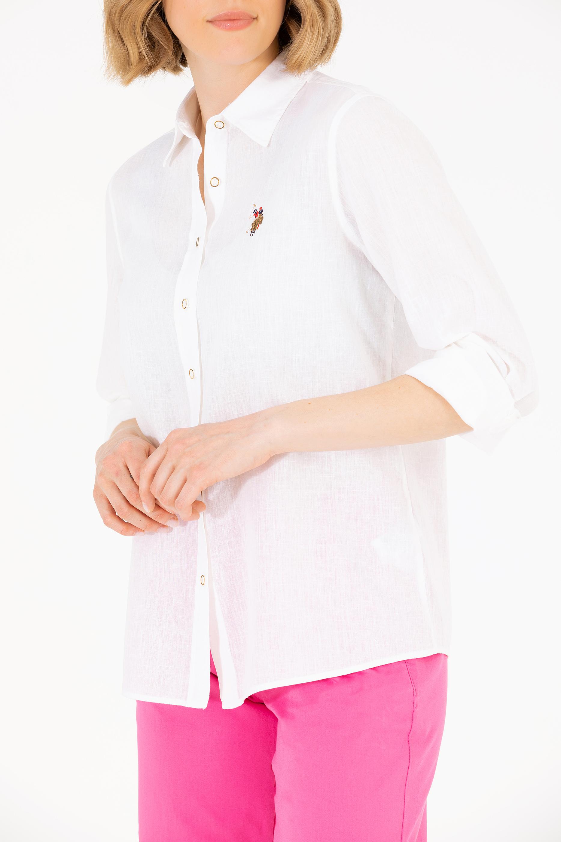 - Kadın Beyaz Keten Görünümlü Basic Uzun Kollu Gömlek