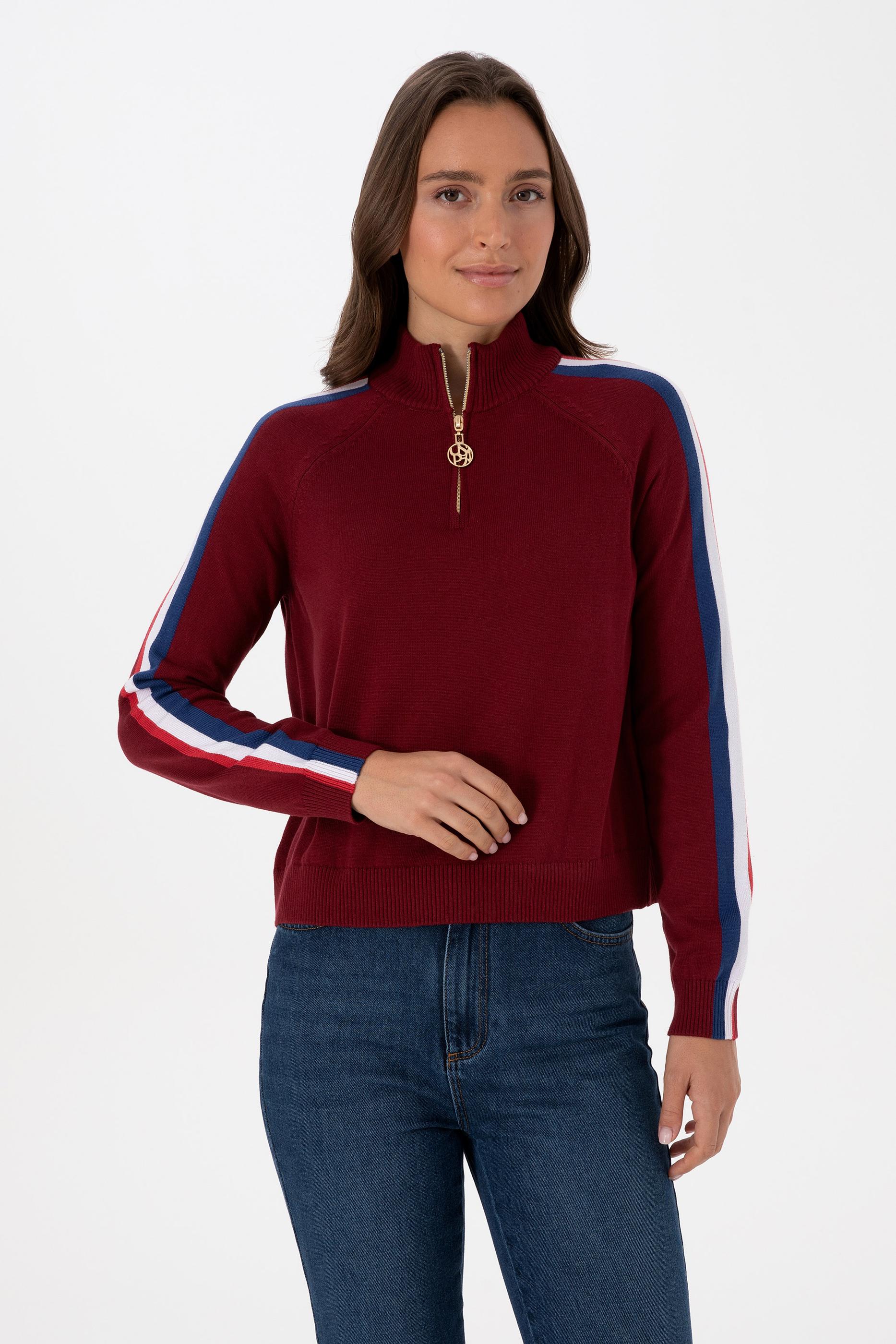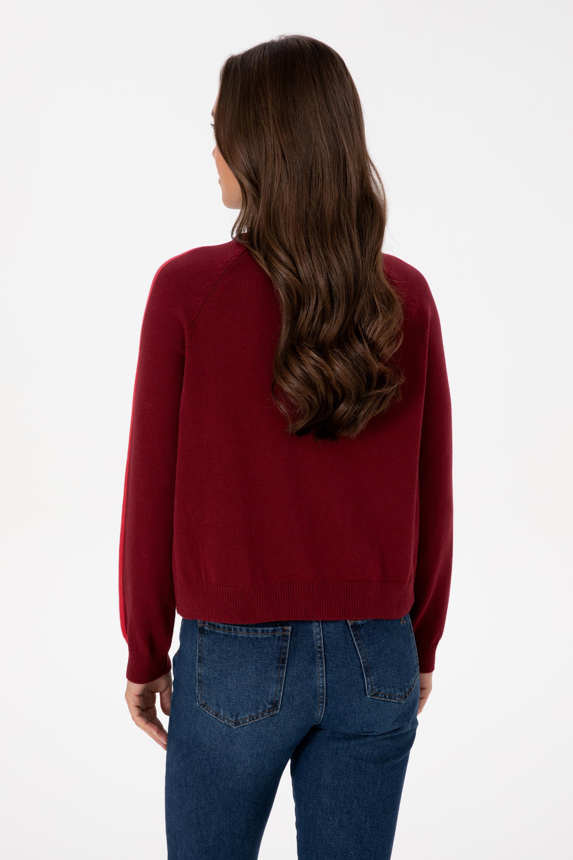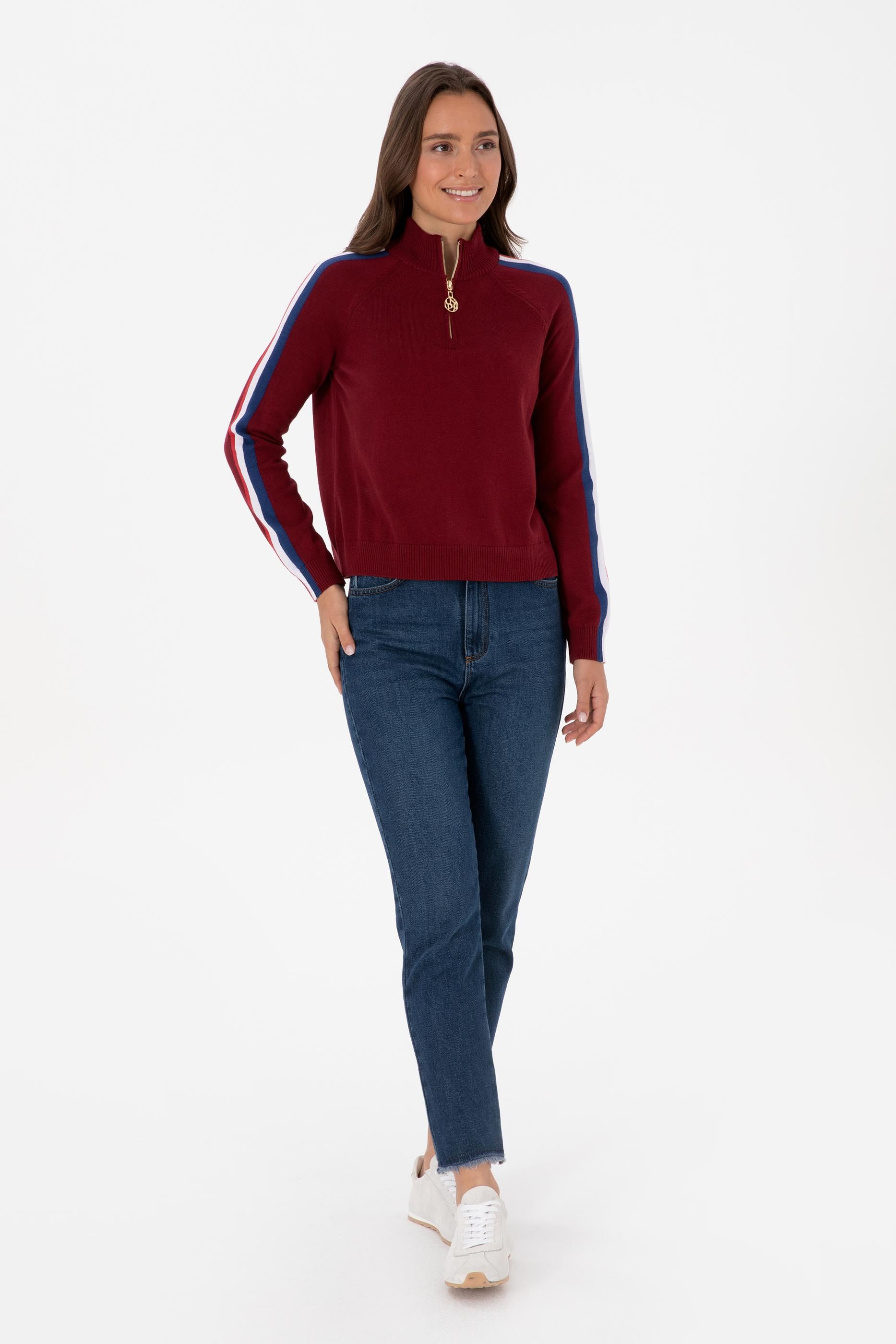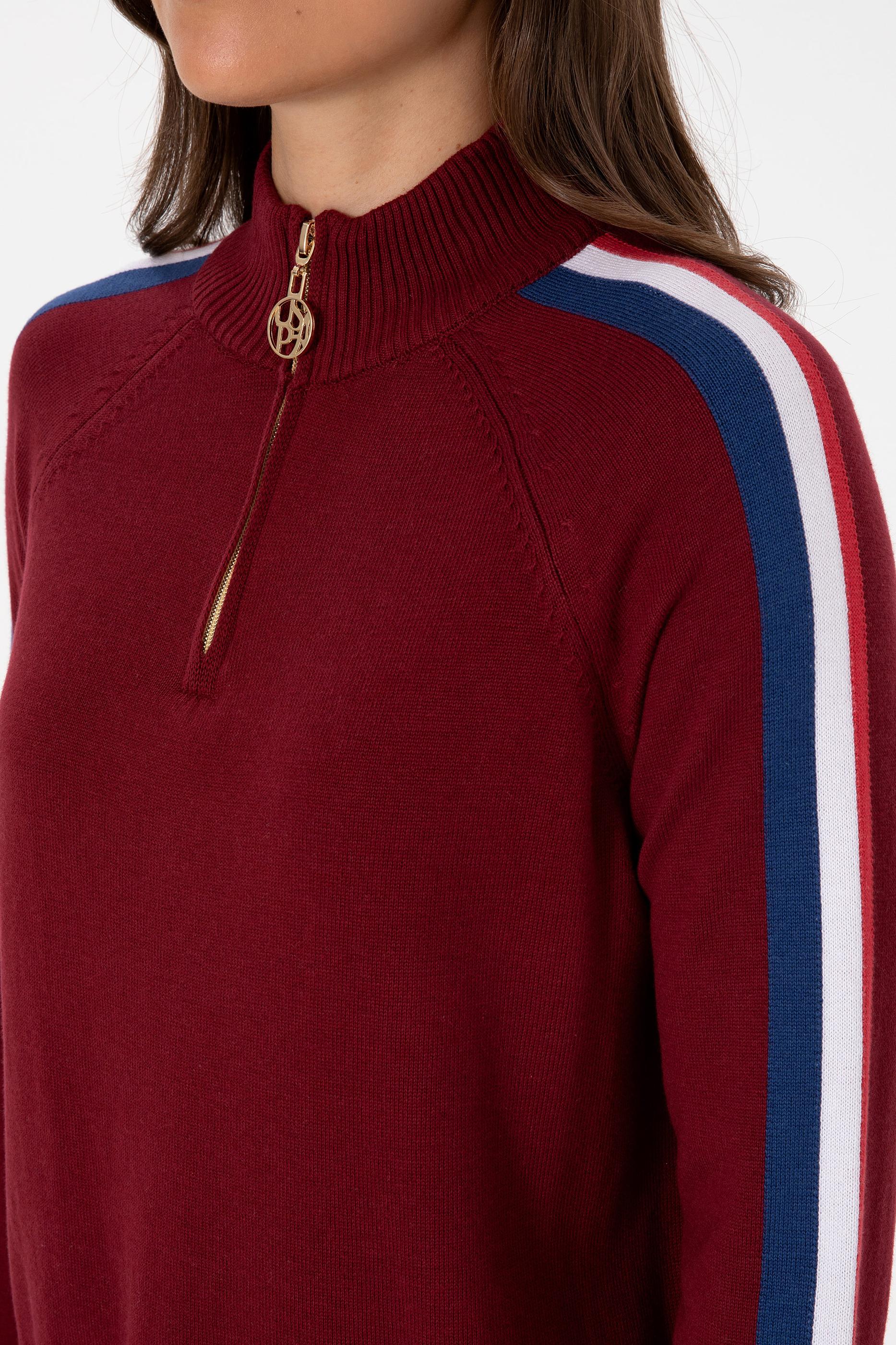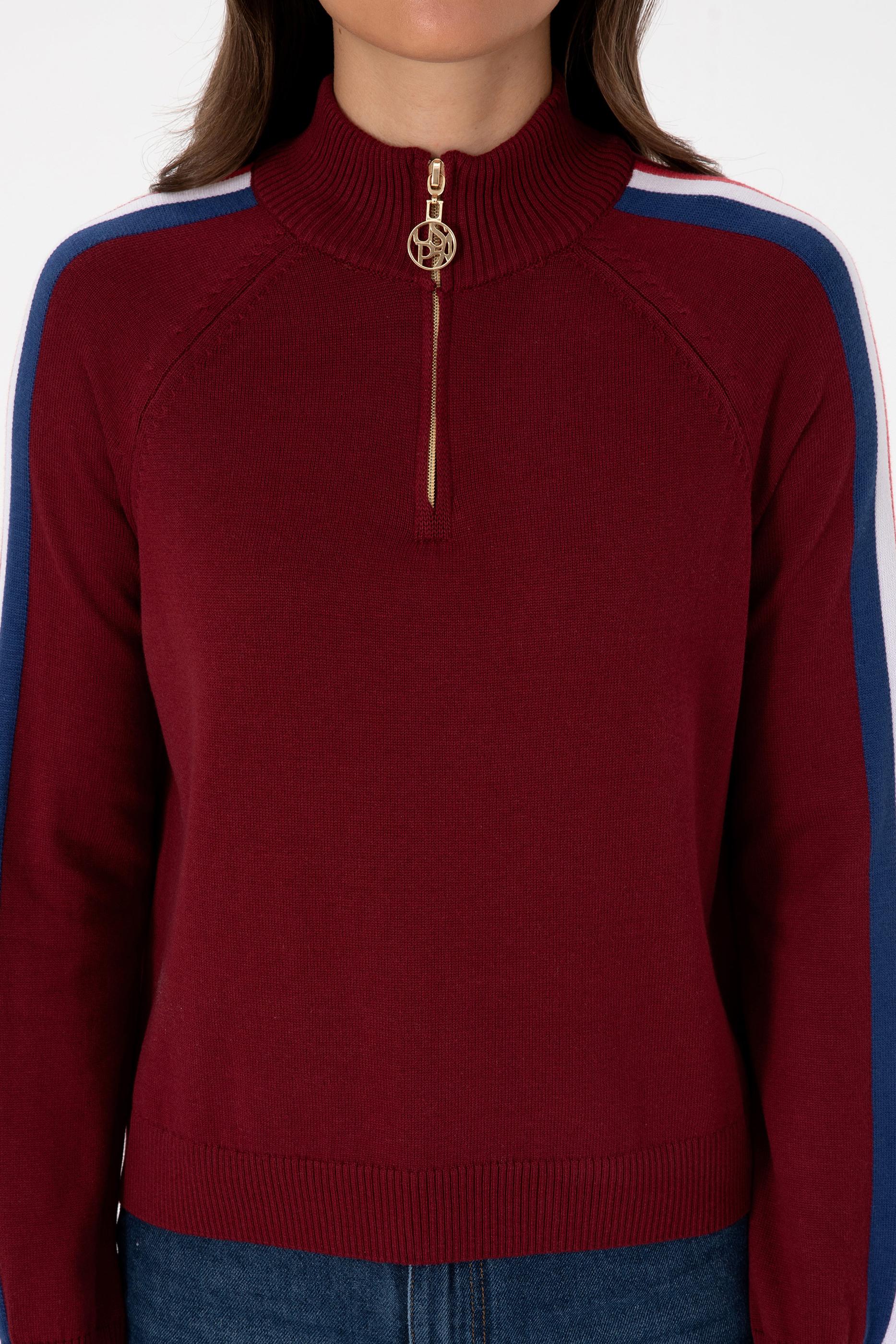 Kadın Bordo V Yaka Fermuarlı Kazak