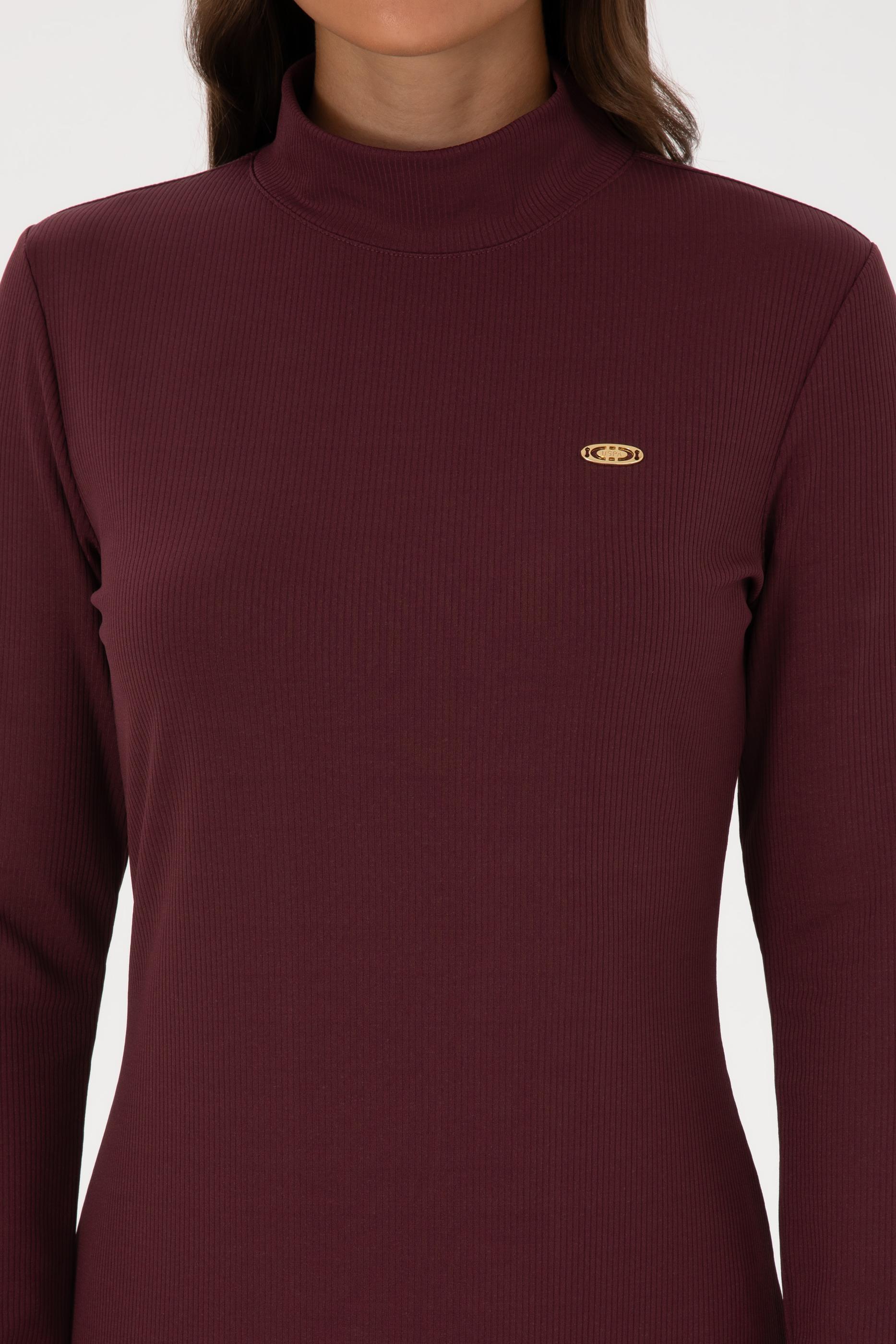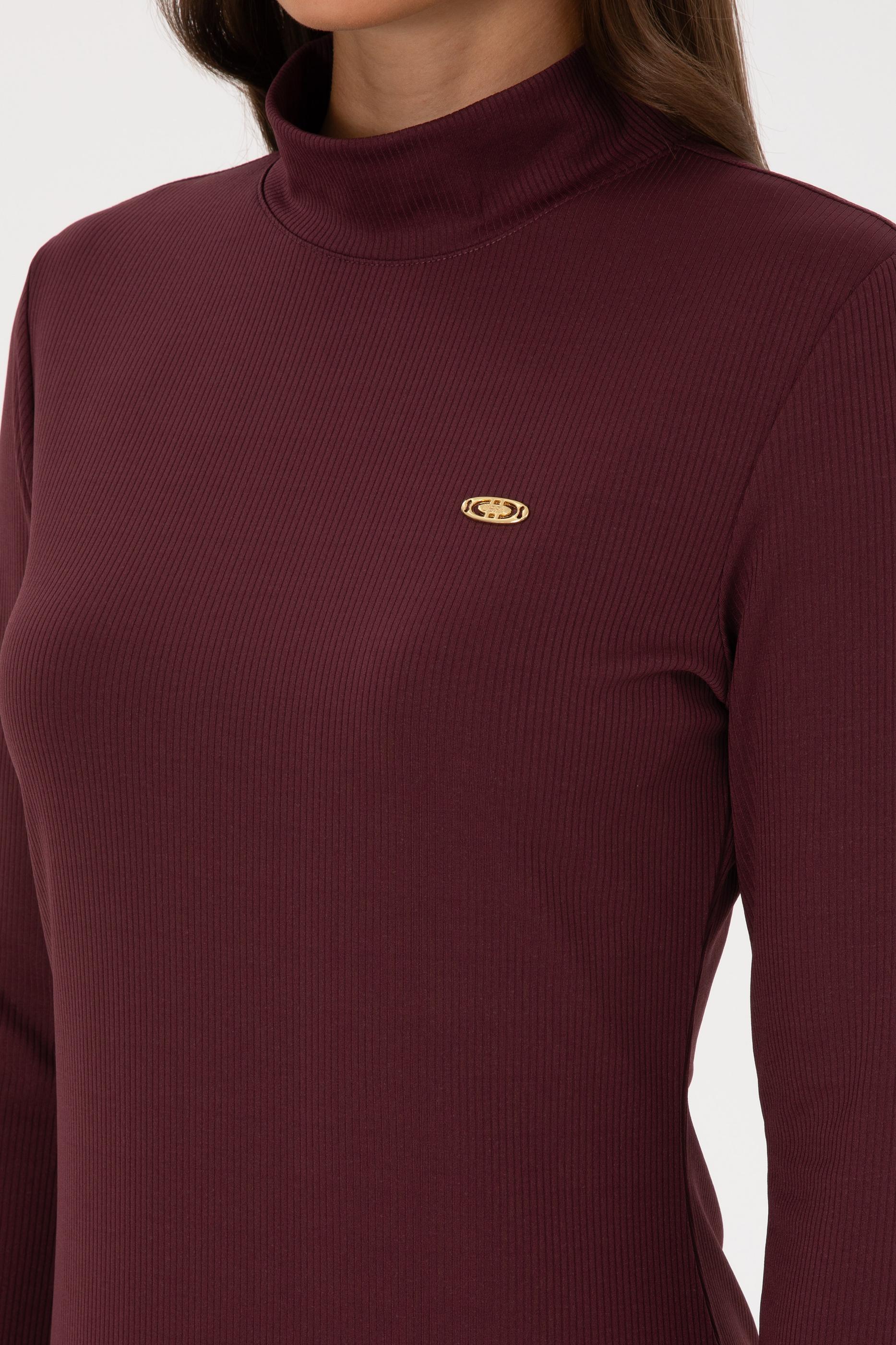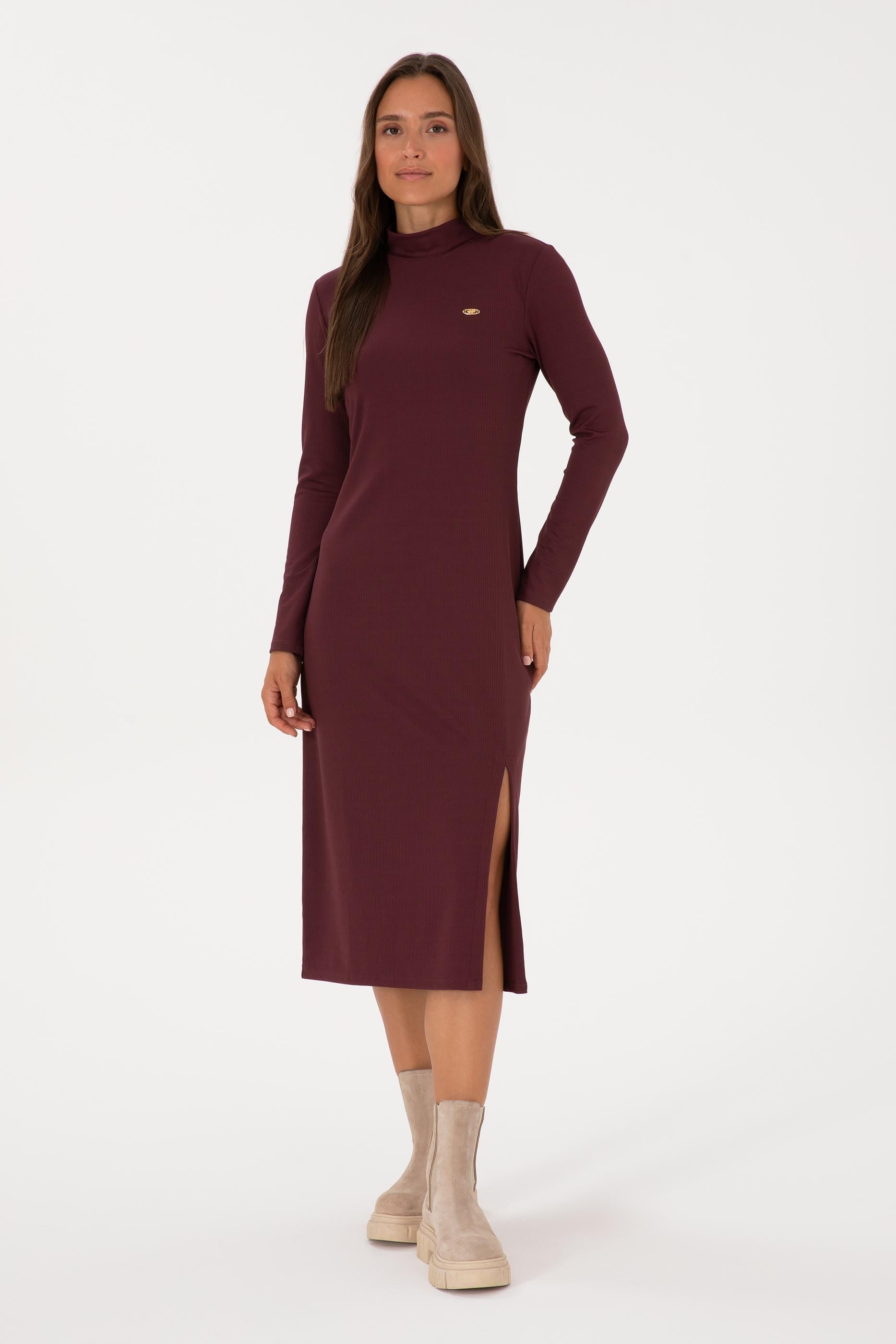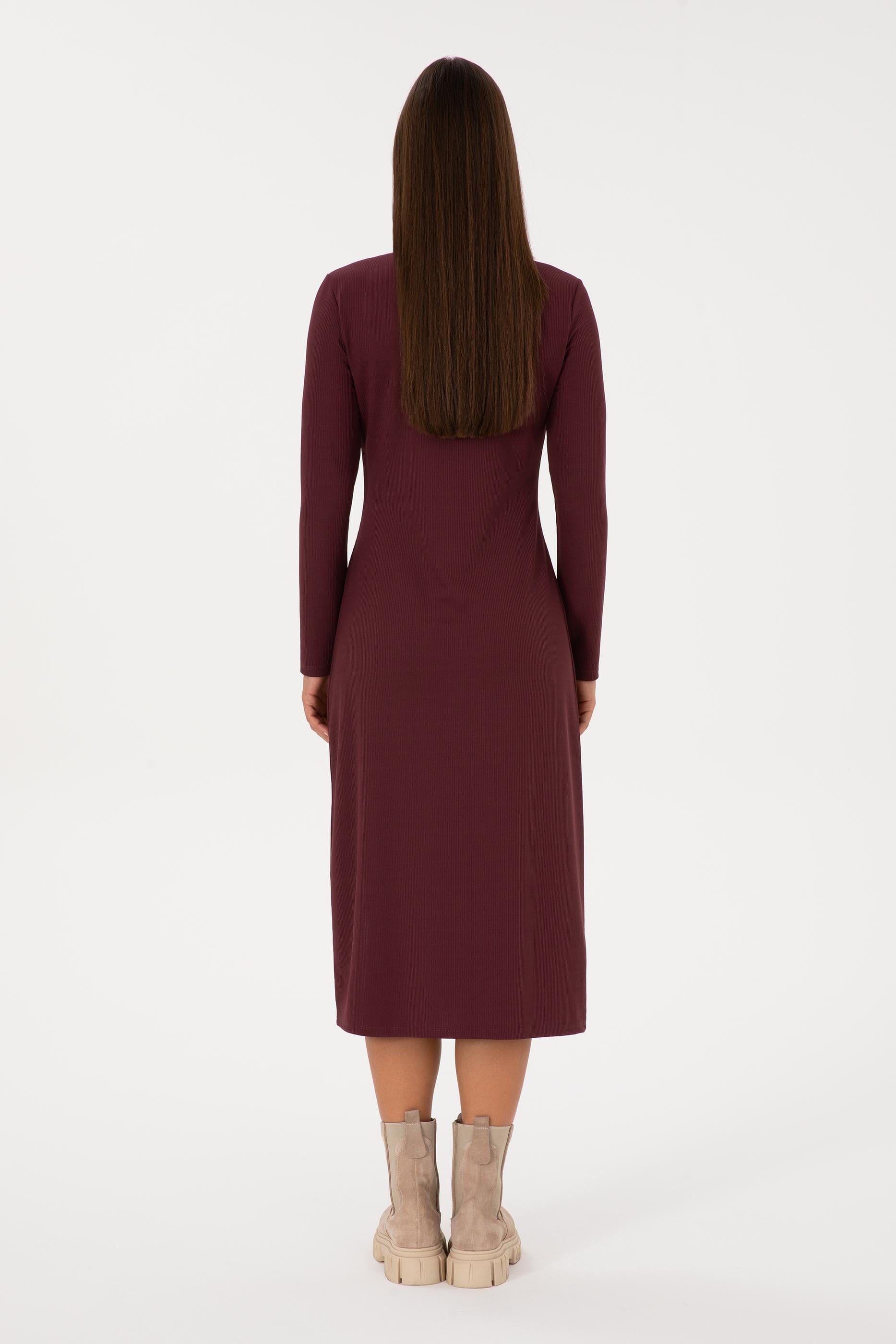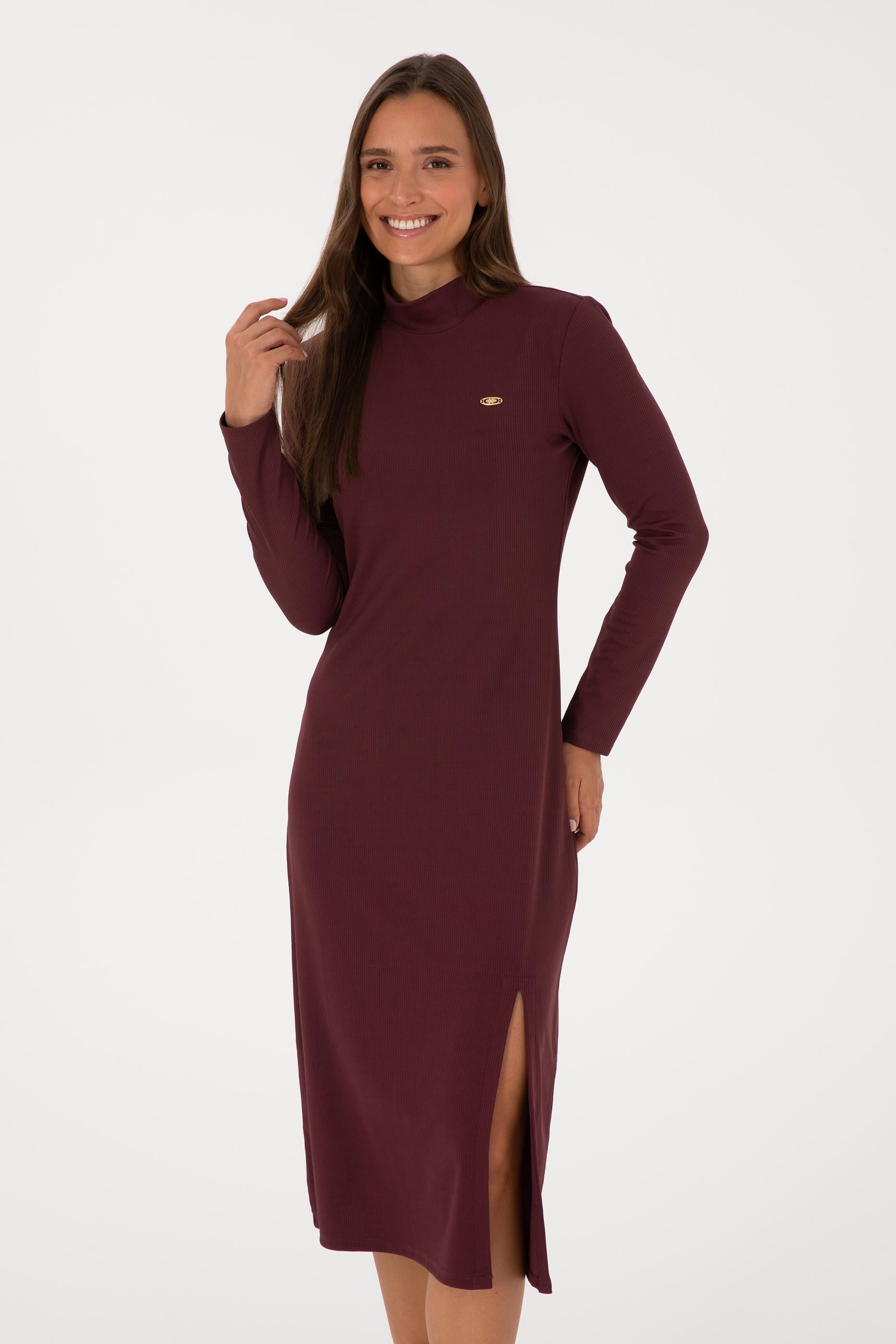 Kadın Bordo Yırtmaçlı Dik Yaka Midi Boy Örme Elbise