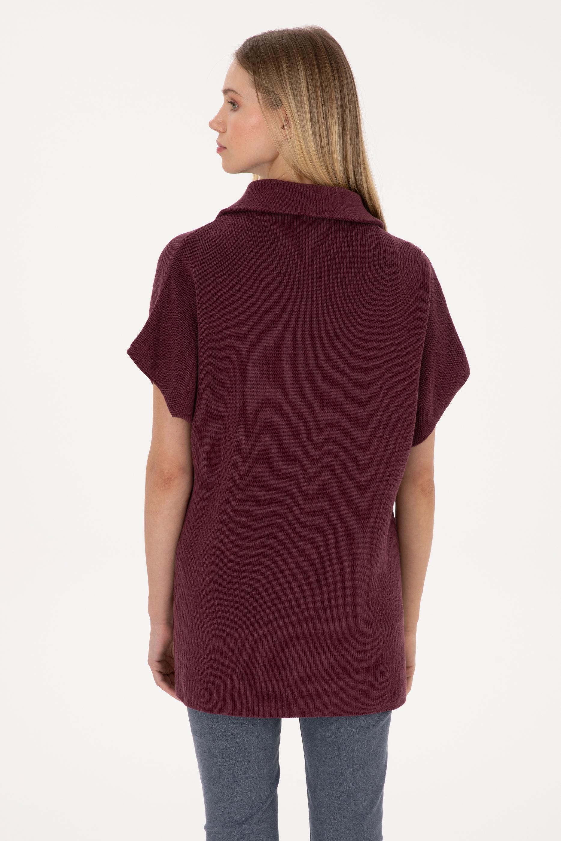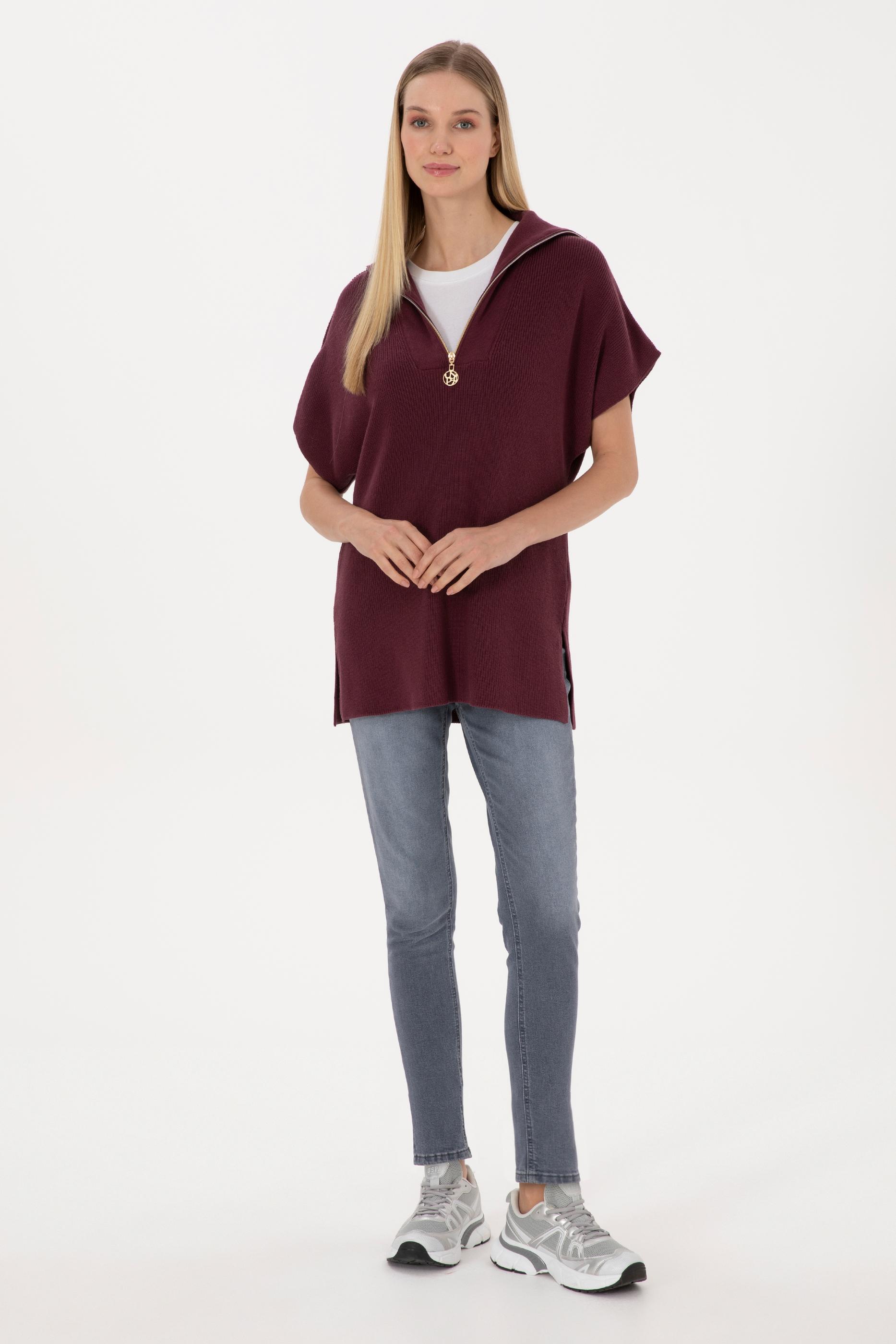 Kadın Bordo V Yaka Fermuarlı Süveter