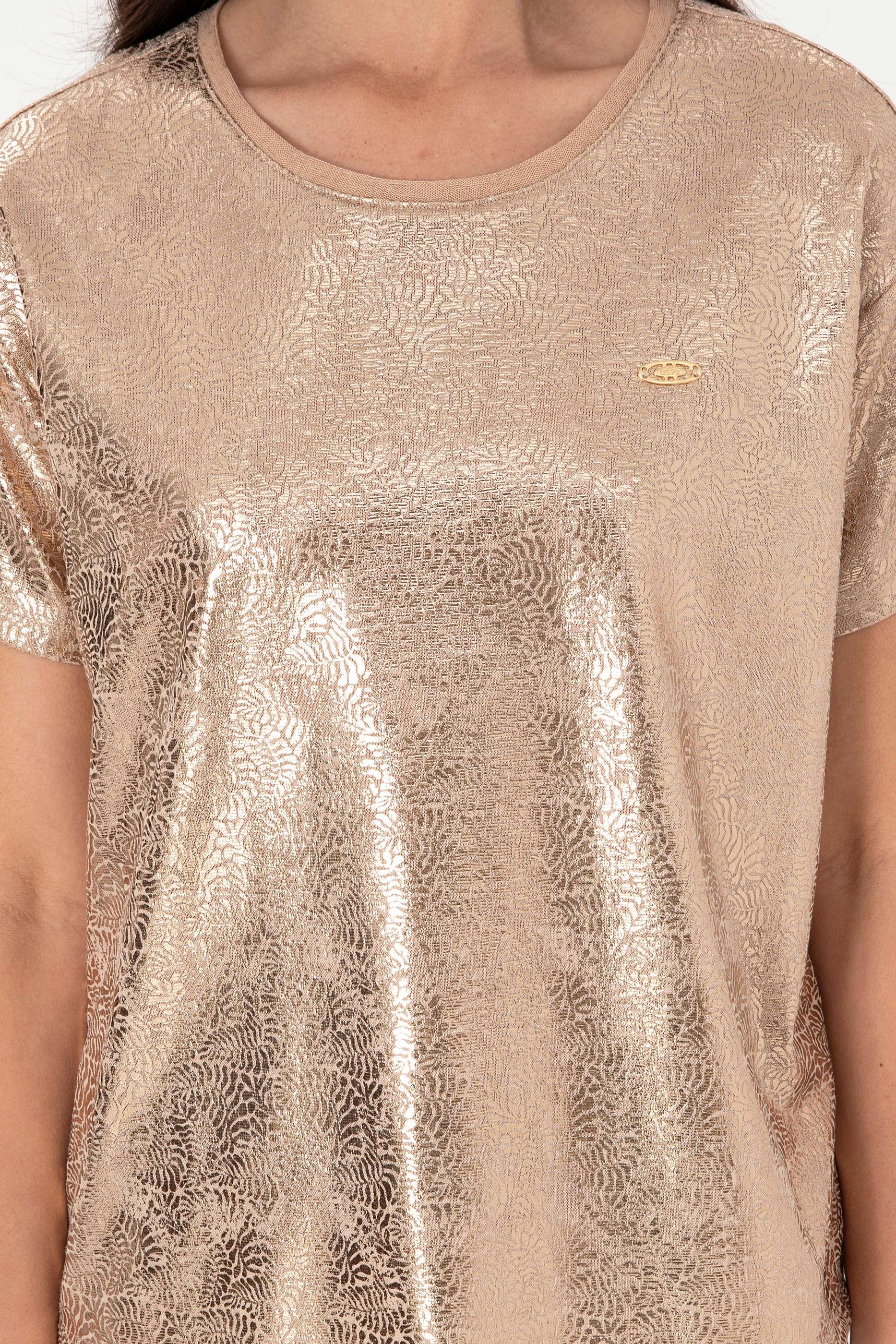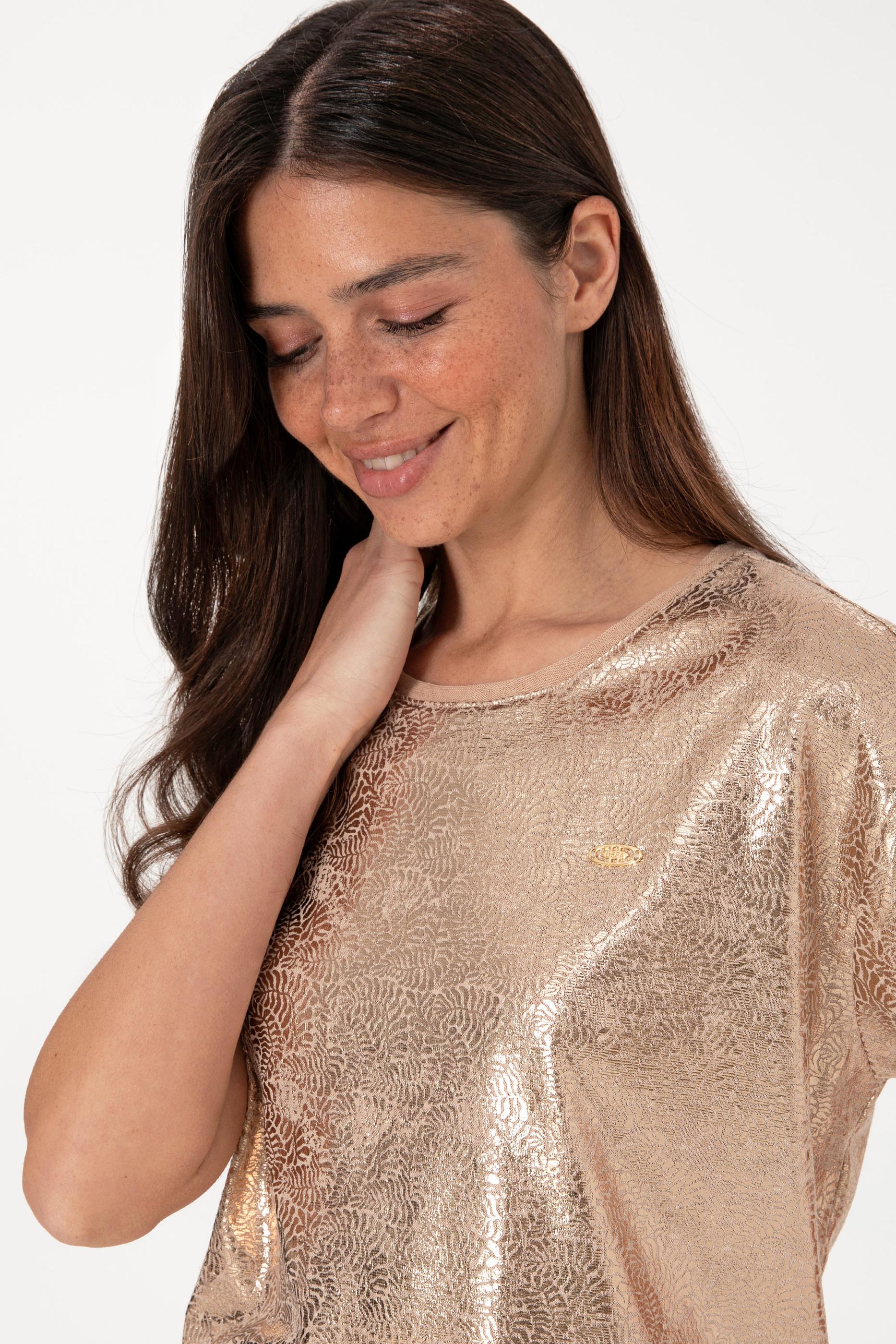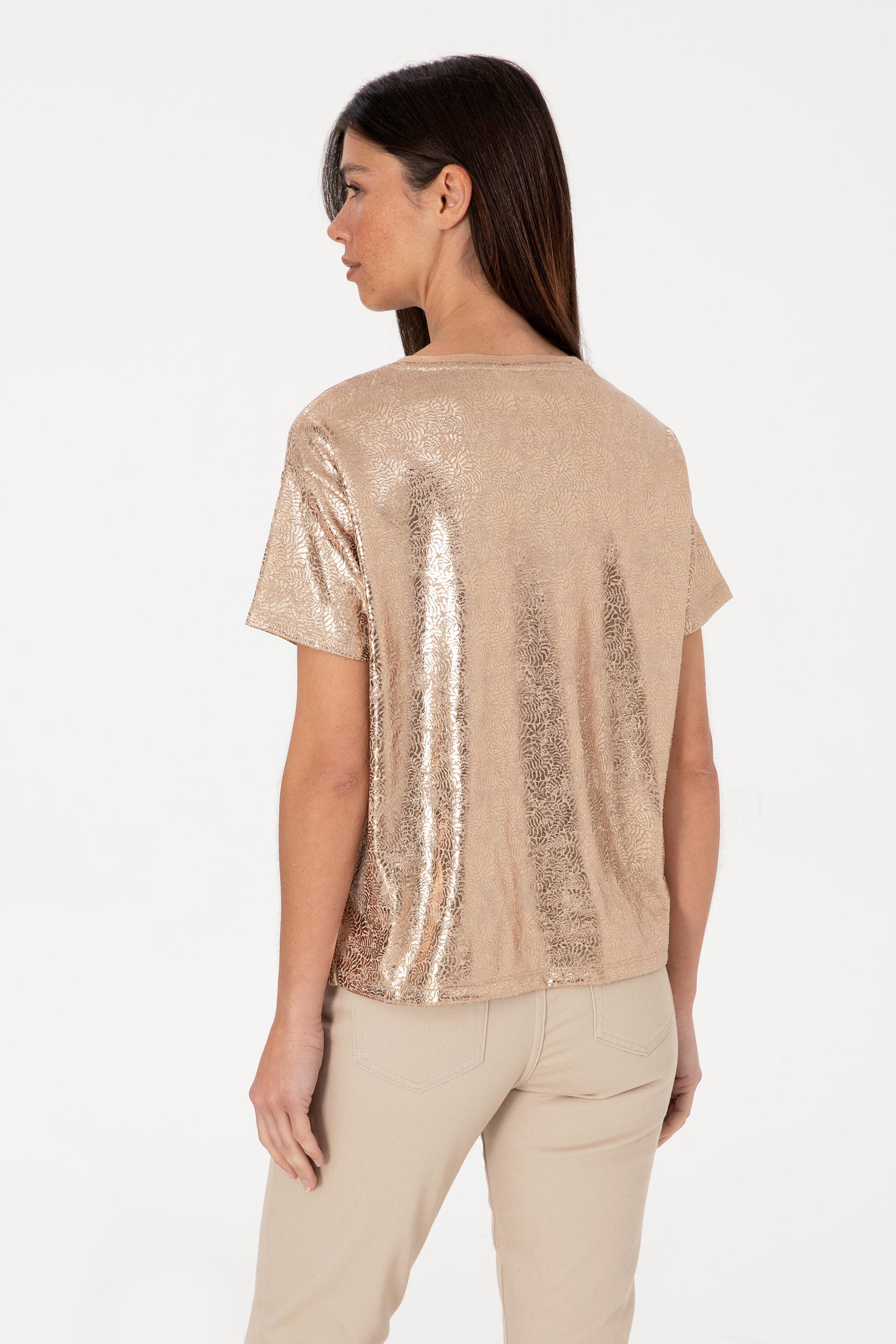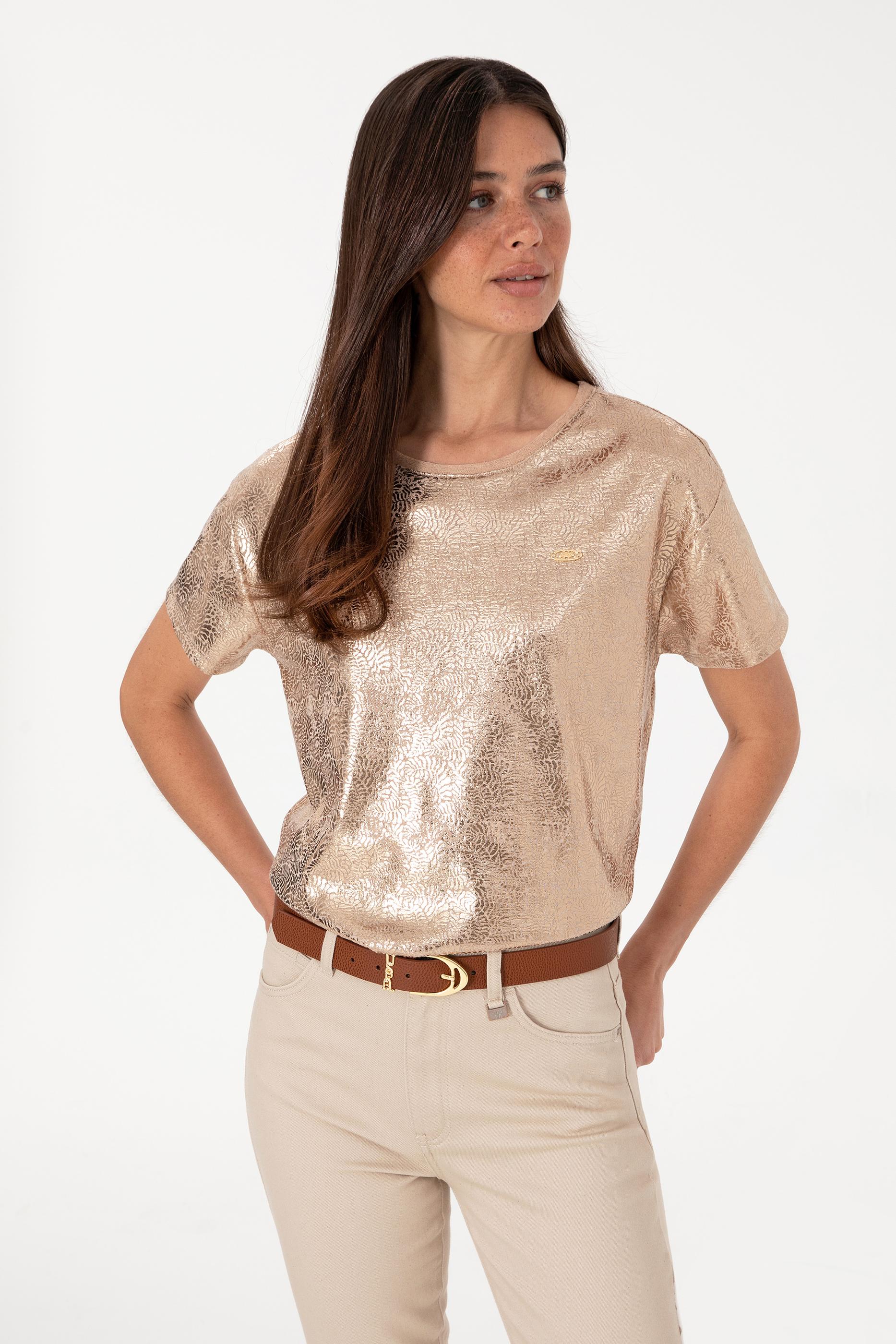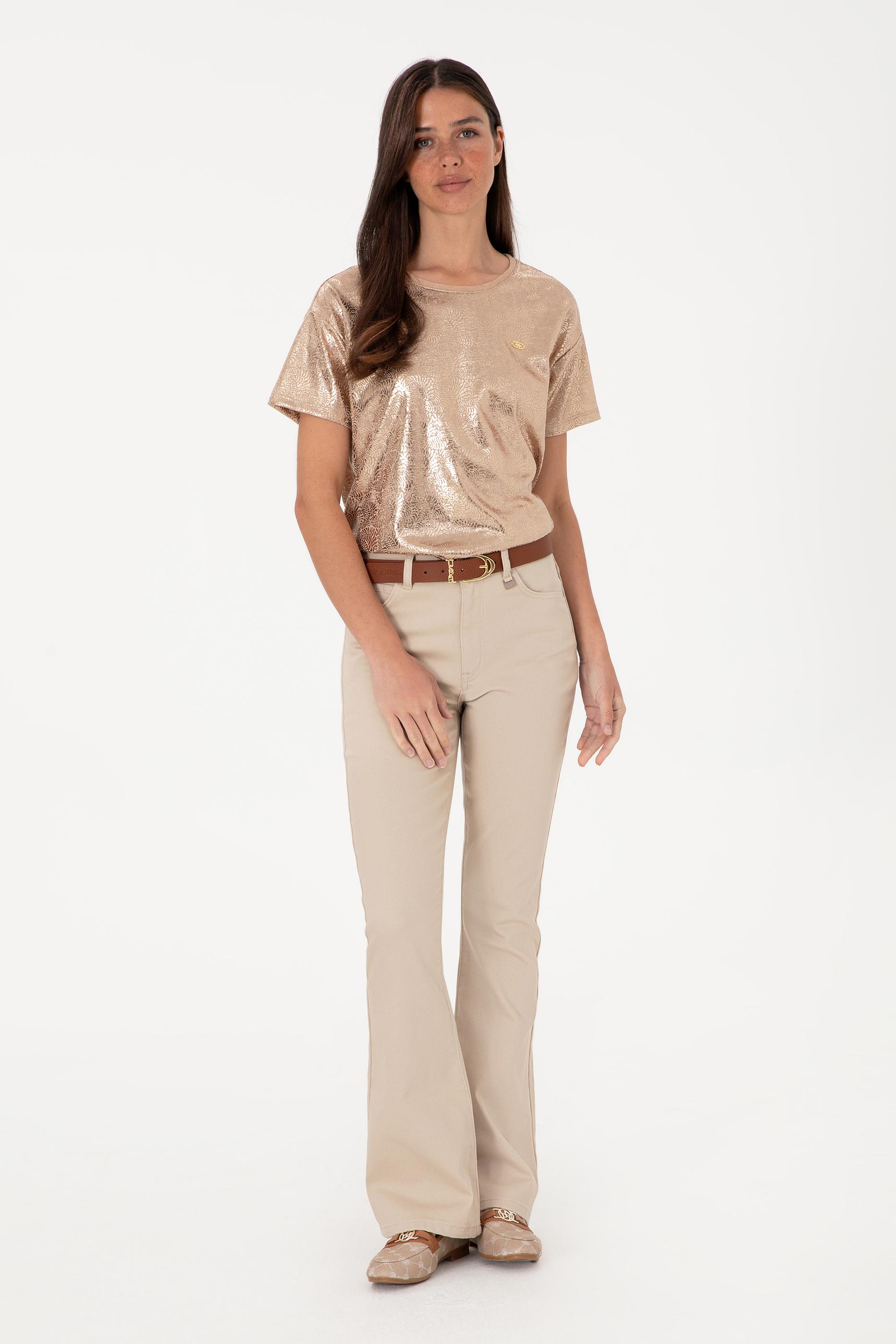 U.S. Polo Assn. tasarımı olan bu kadın bisiklet yaka tişört, dikkat çekici metalik yansımalı yüzeyiyle sıradan tişört formlarının ötesine geçiyor. Işıltılı dokusu sayesinde gün ışığında ya da yapay aydınlatmada parlayarak sofistike bir görünüm sunarken, sade bisiklet yaka kesimi ve kısa kollu yapısıyla dengeli bir siluet oluşturur. Rahat kalıbı sayesinde vücuda yapışmadan dökümlü bir duruş sergilerken, sol göğüsteki minik metal logo tasarıma zarif bir imza niteliği kazandırıyor. Bej, krem veya beyaz tonlarla kombinlenerek stilinize gösterişli ama zarif bir hava katacak bu tişört, hem gündüz şıklığında hem de akşam kombinlerinde öne çıkar.