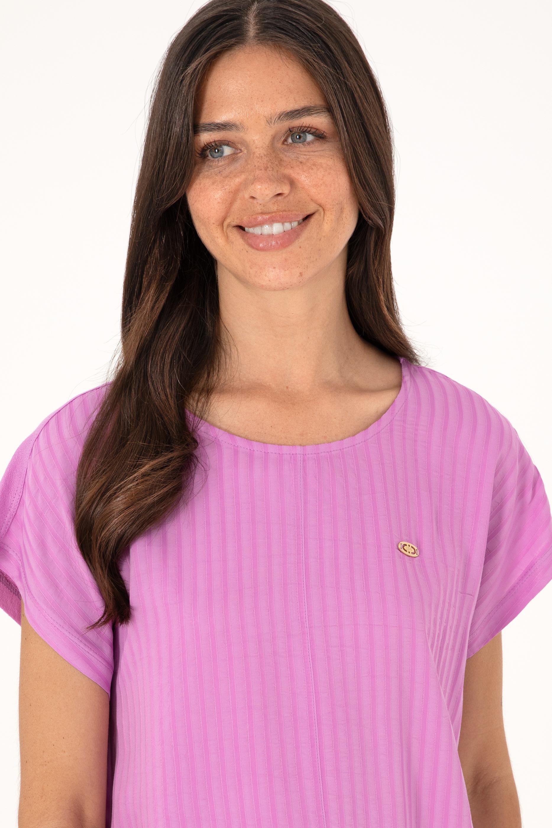 - Kadın Fuşya Çizgili Bisiklet Yaka Tişört