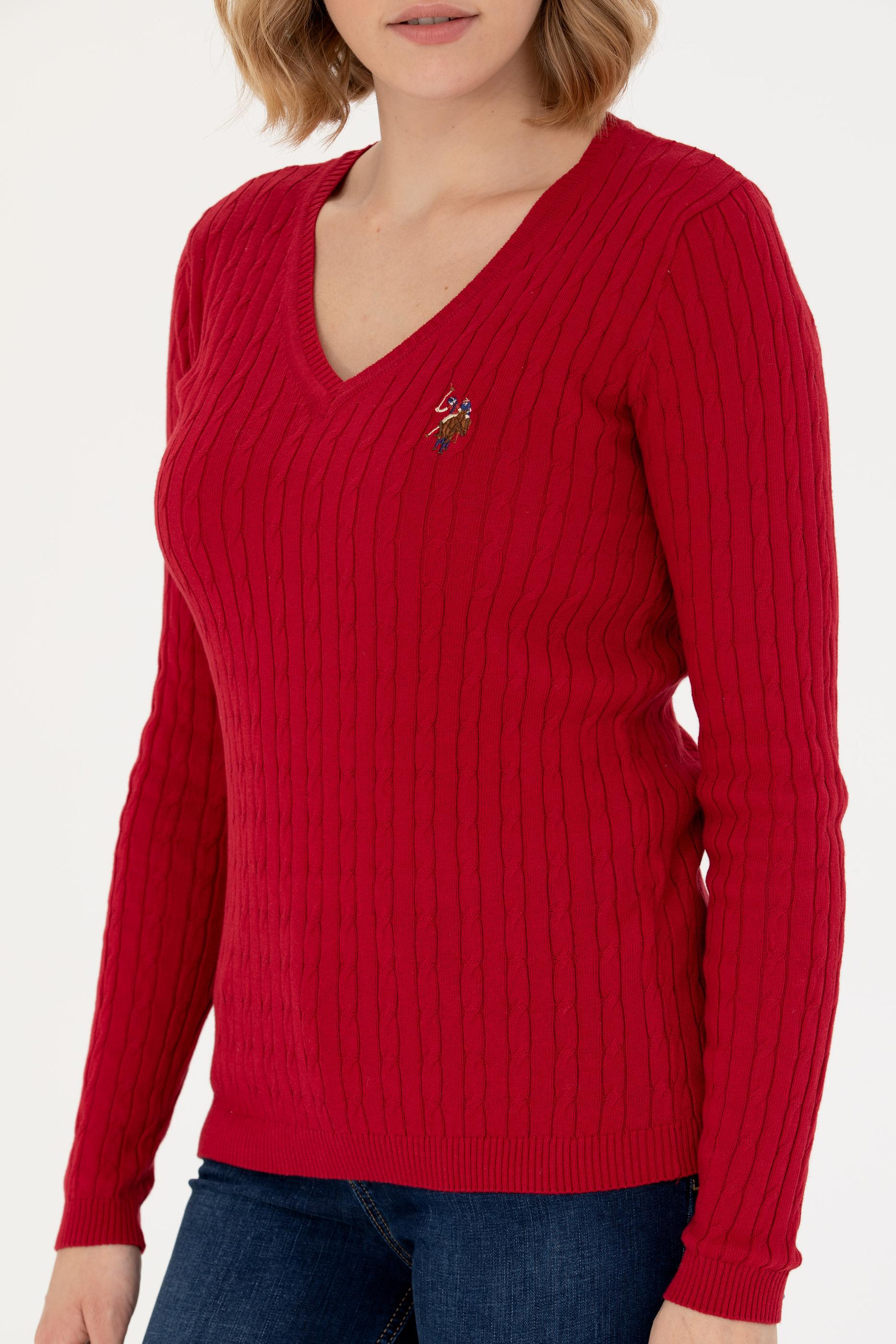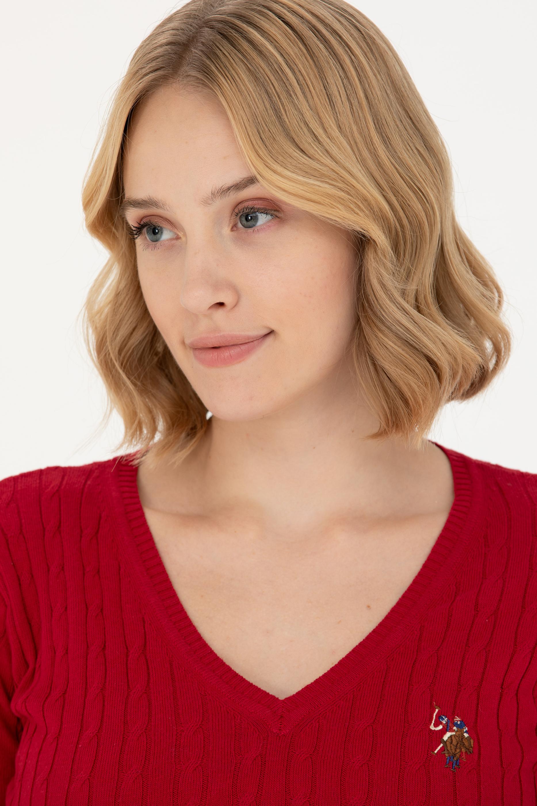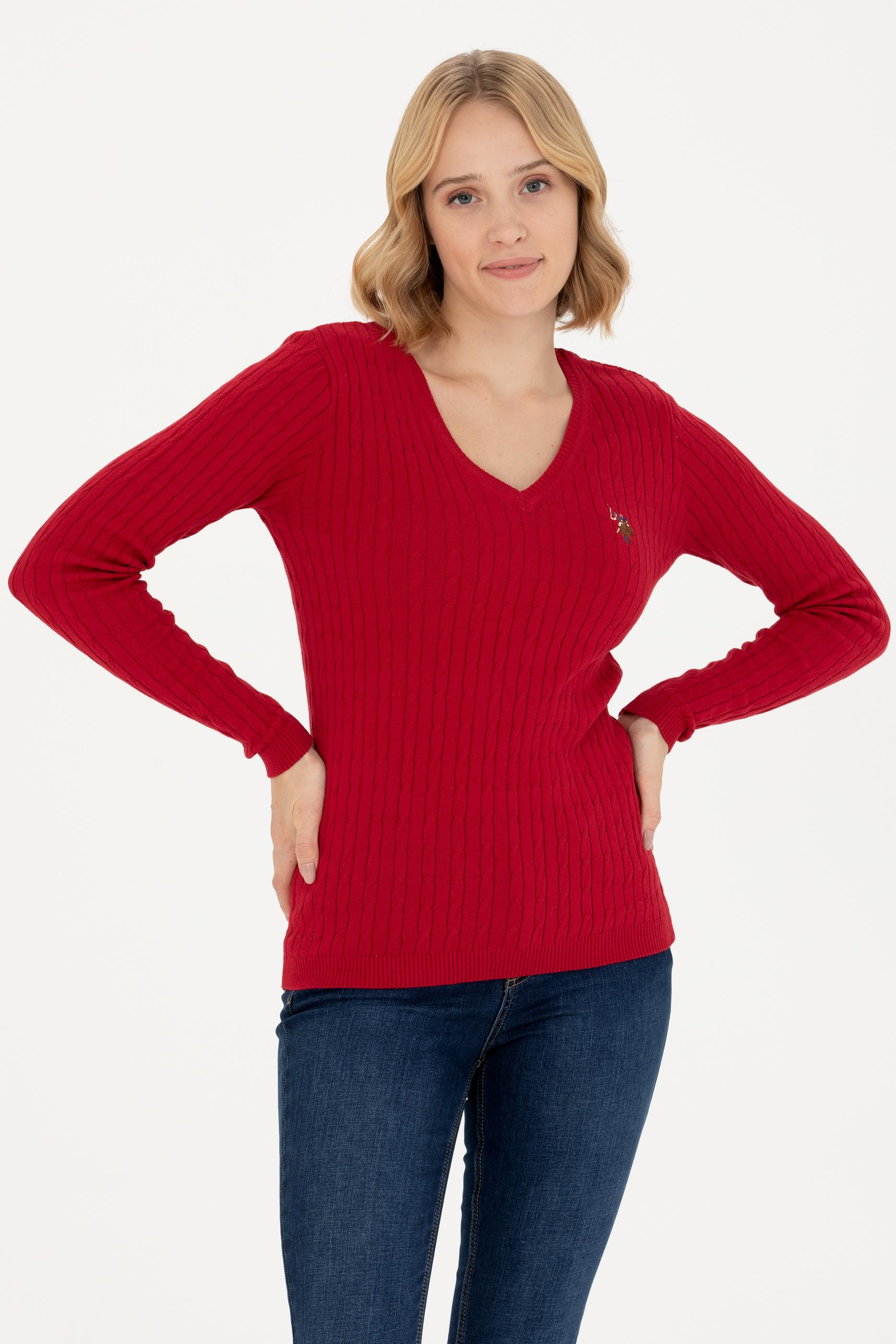 Kadın Kırmızı V Yaka Basic Kazak