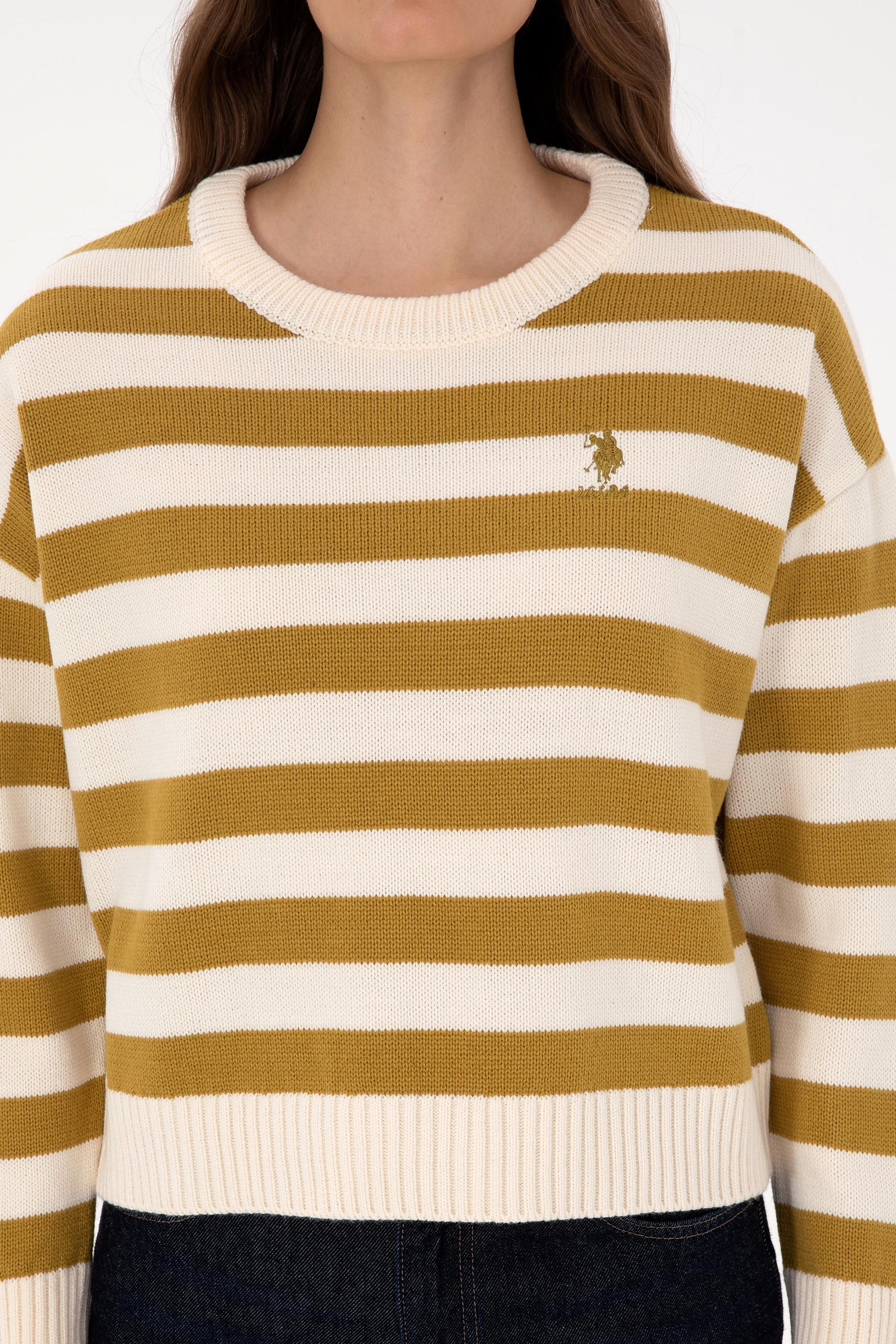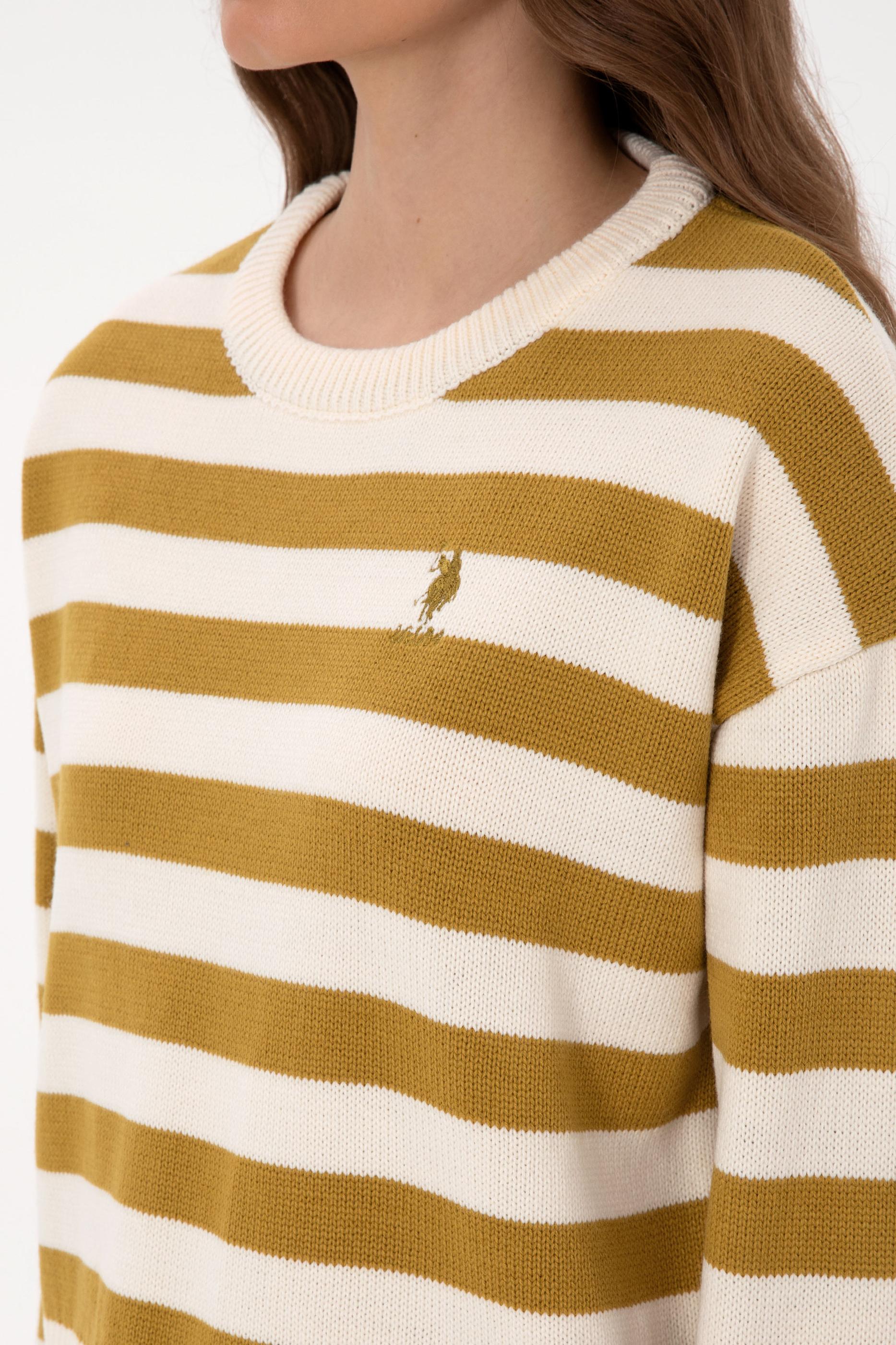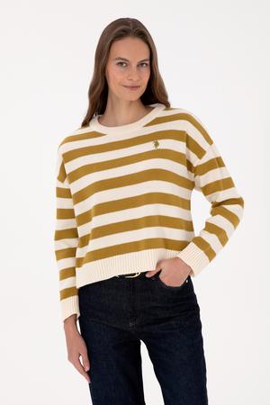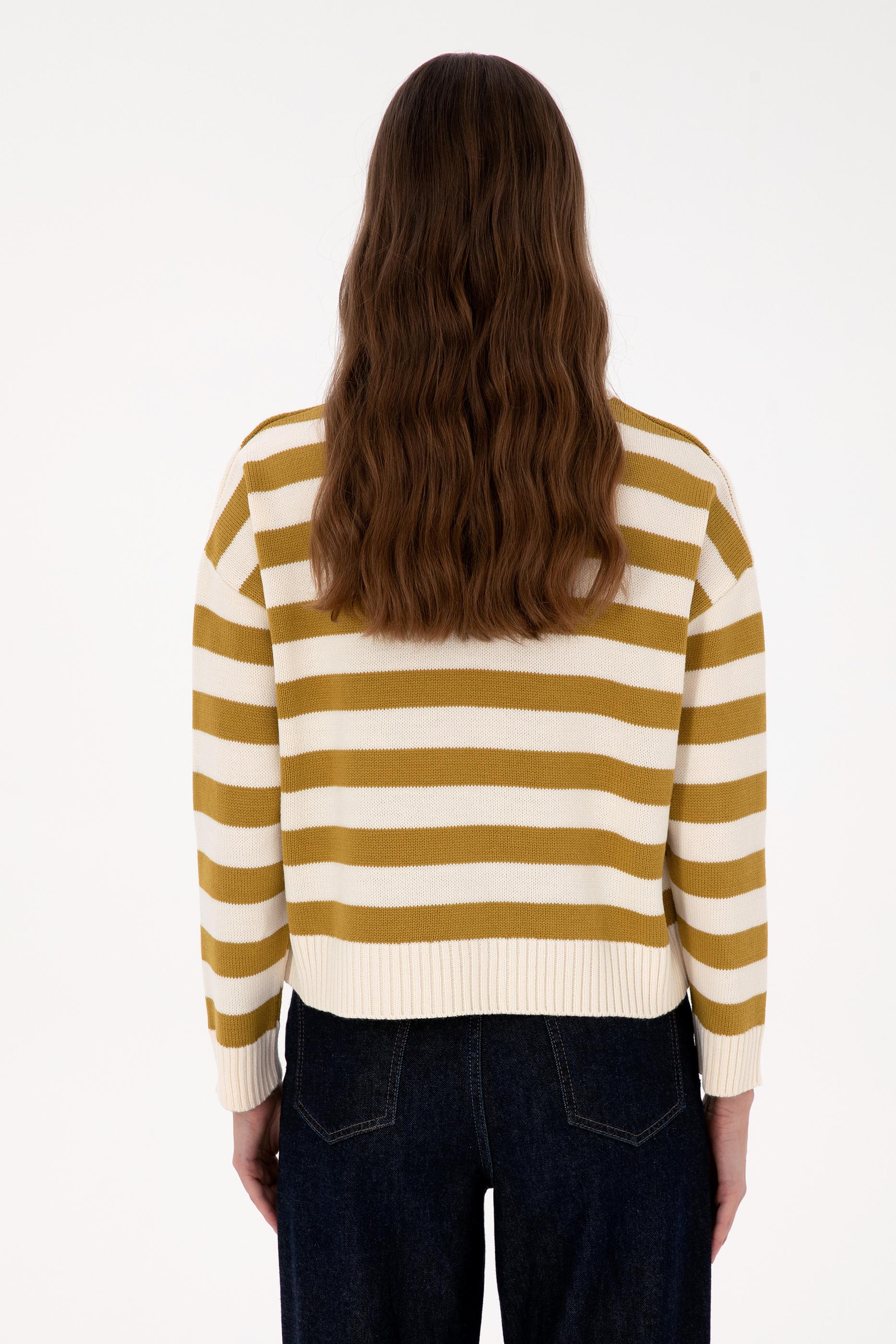 Kadın Krem Çizgili Bisiklet Yaka Kazak