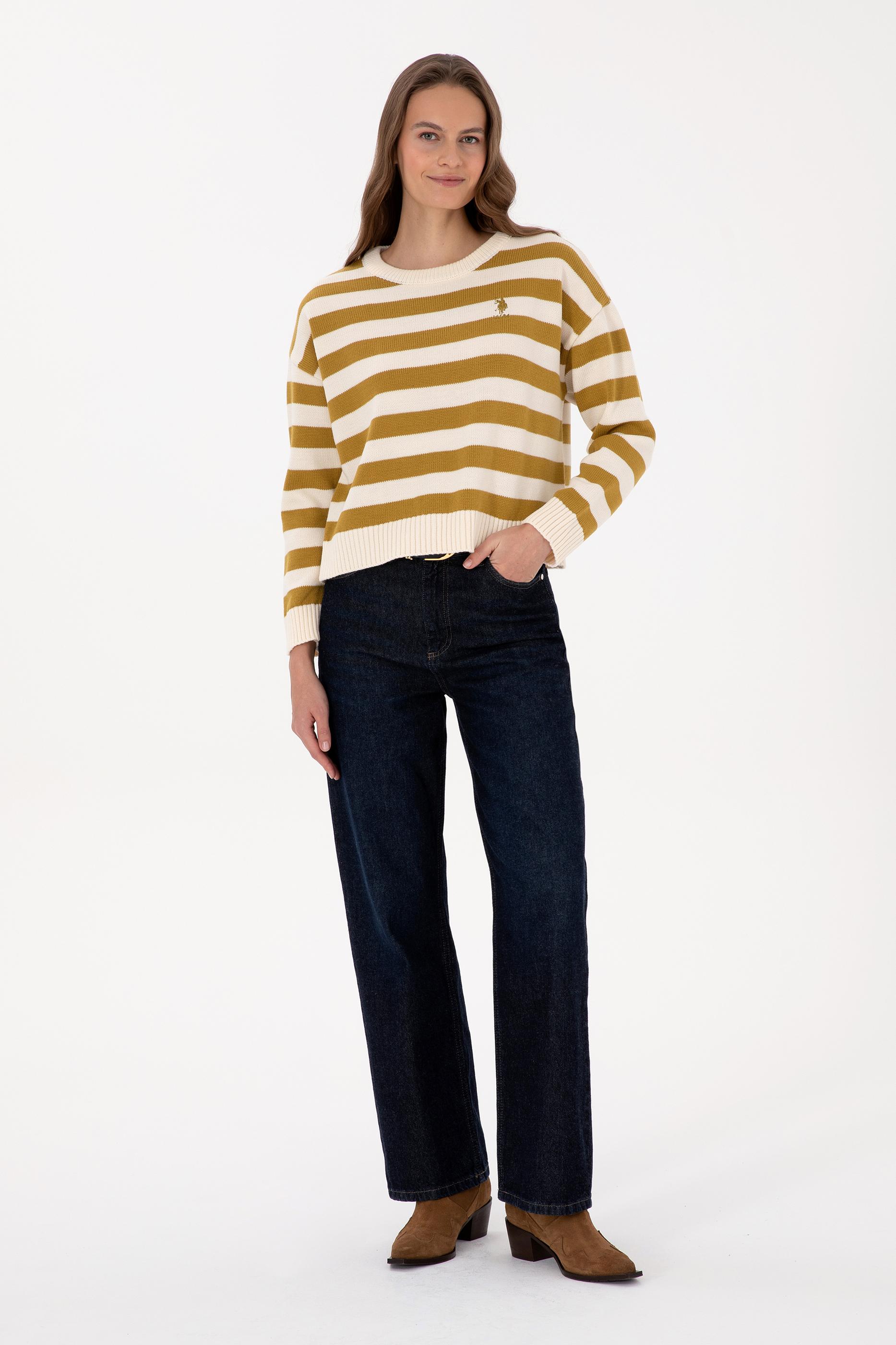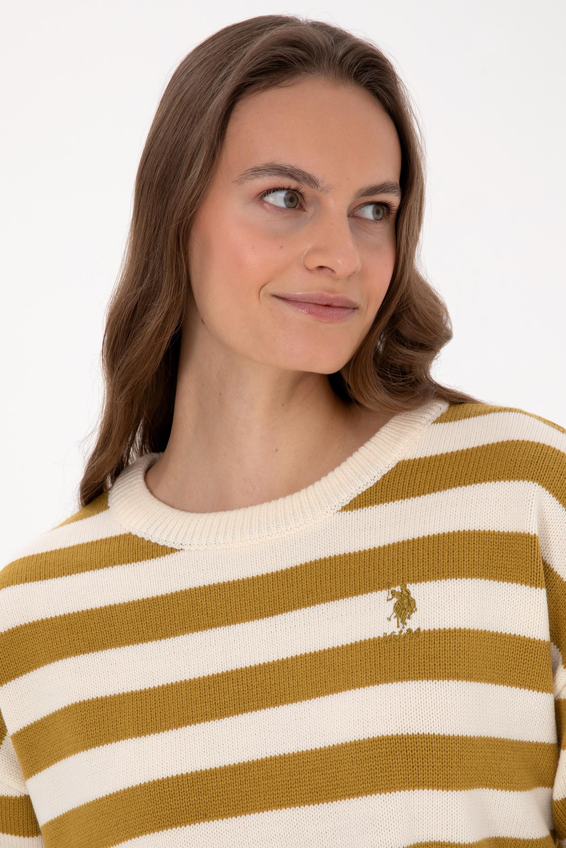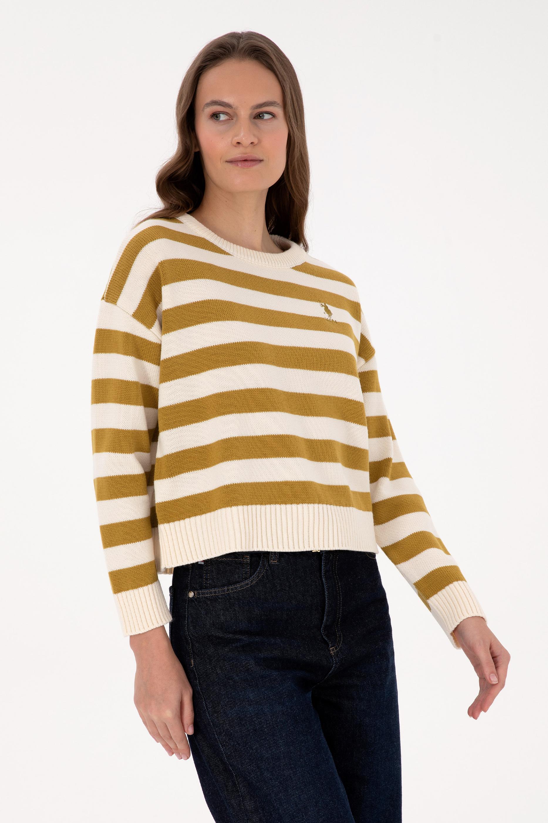 Kadın Krem Çizgili Bisiklet Yaka Kazak
