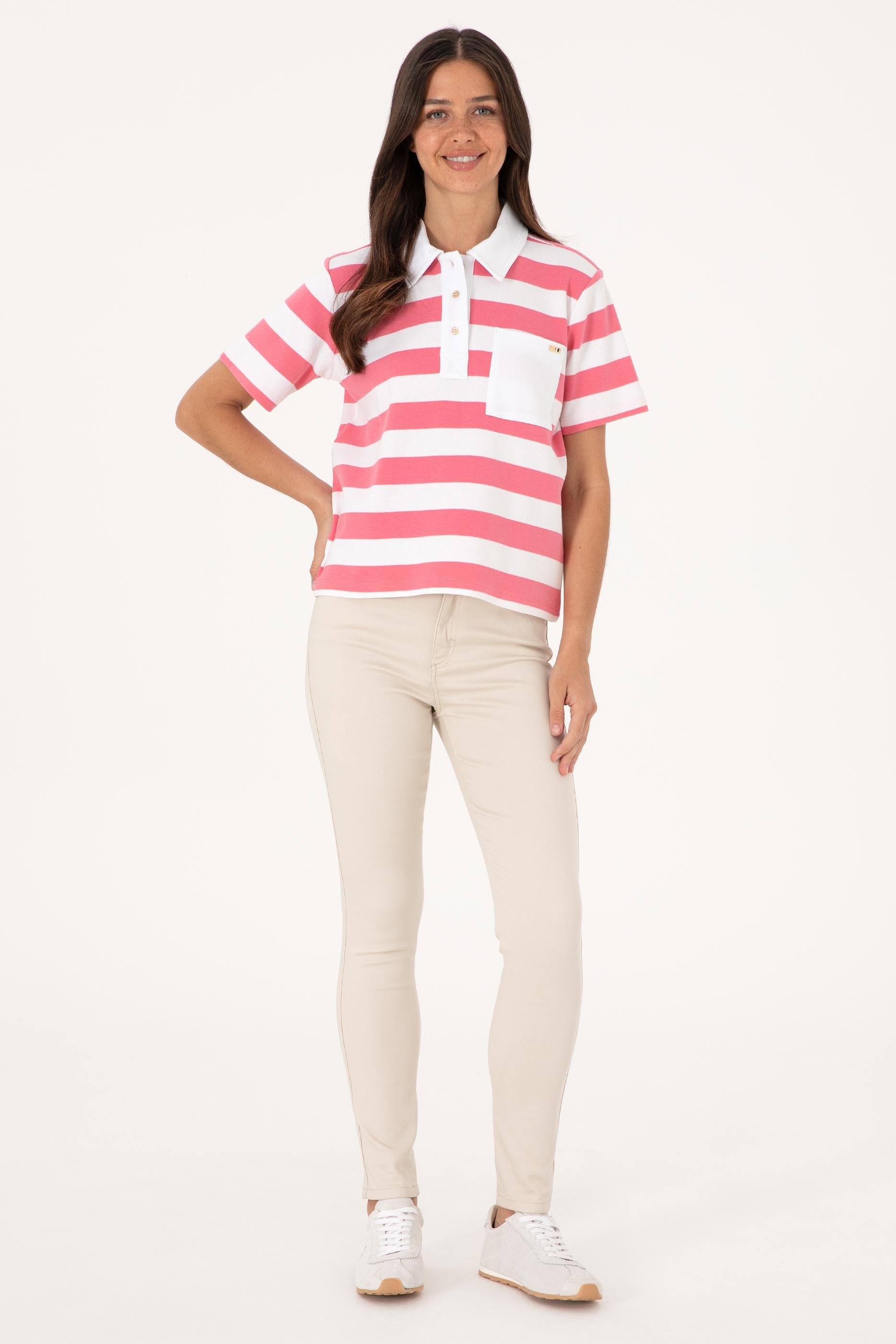 U.S. Polo Assn. markasına ait bu kadın polo yaka tişört, enerjik krem-camel çizgileriyle dikkat çekerken, dinamik tasarımıyla da fark yaratıyor. %100 pamuklu dokusu sayesinde gün boyu nefes alabilirlik ve doğal yumuşaklık sunan model, klasik formu modern detaylarla buluşturuyor. Geniş yapılı krem polo yaka ve yarım boy fermuarla birleşen düğmeli pat detayı, hem şıklık hem de pratiklik sağlıyor. Göğüs kısmında yer alan düz krem cep ve küçük metal logo, sportif tasarımı zarif bir ifadeyle tamamlıyor. Rahat kalıbı sayesinde günlük stile kolaylıkla uyum sağlayan bu tişört, açık tonlu pantolonlar ve şortlarla mükemmel uyum yakalıyor.