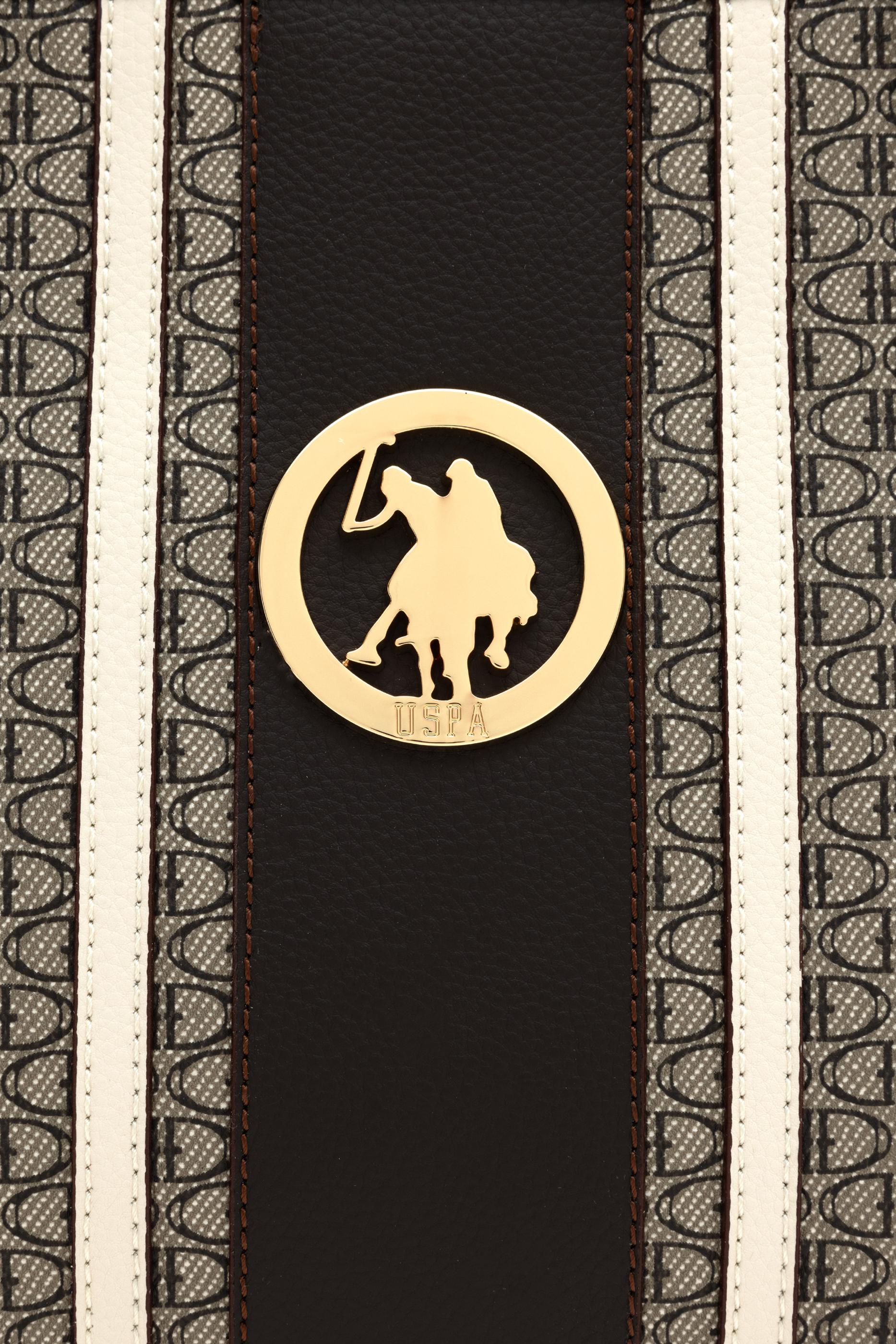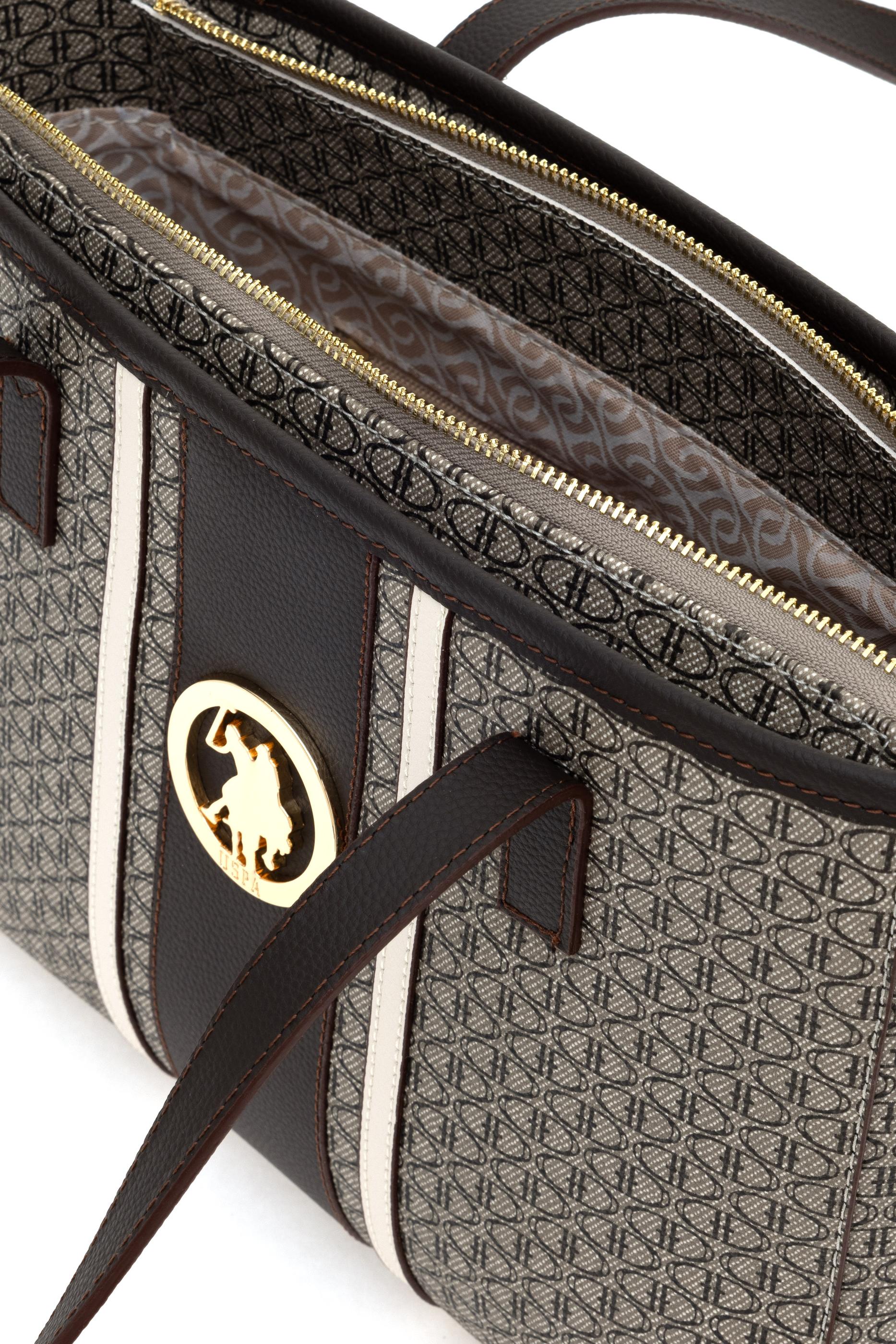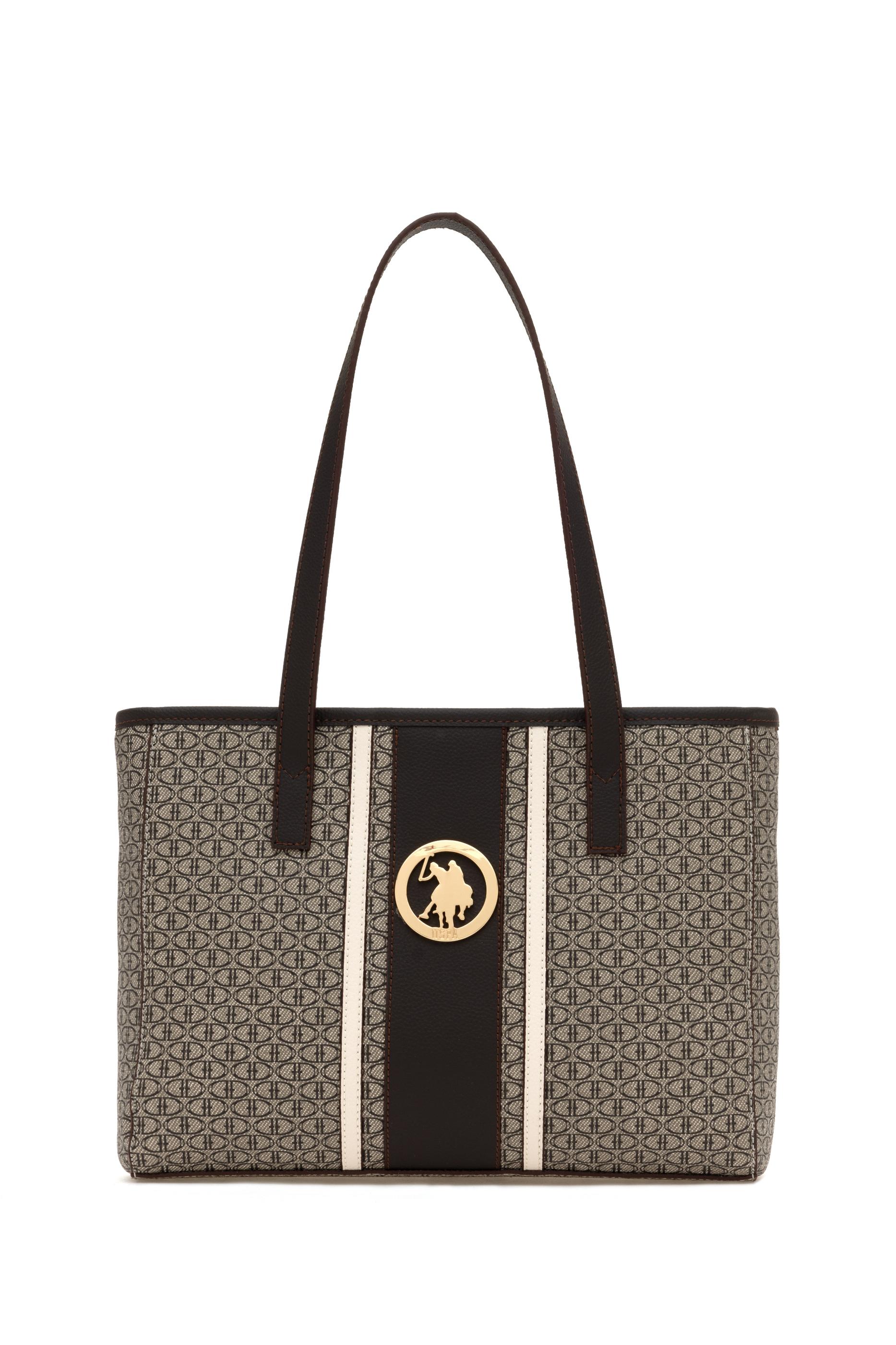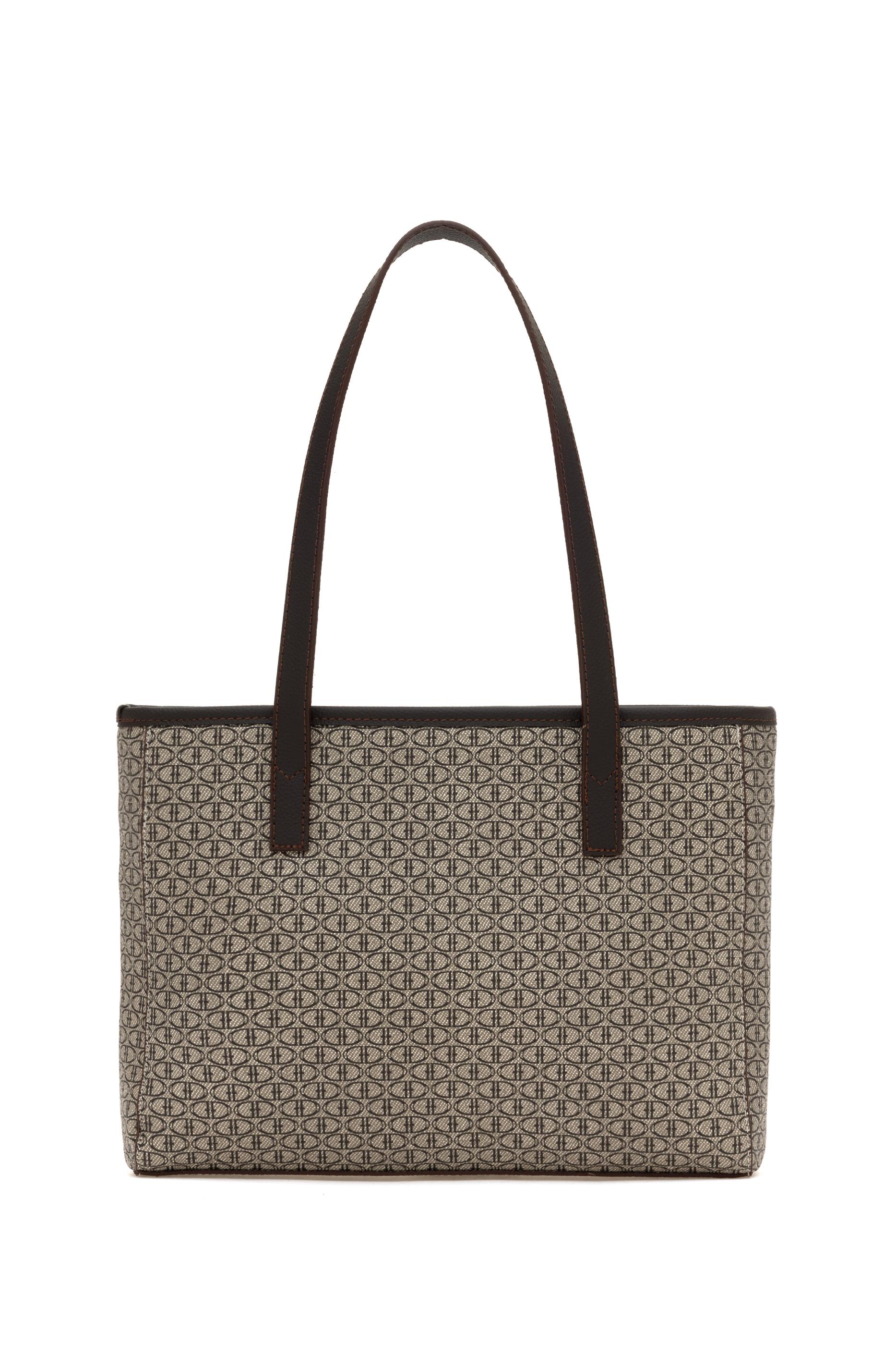 Keskin hatlı dikdörtgen formuyla öne çıkan bu vizon kol çantası, düz tabanı sayesinde ayakta durabilen sağlam bir yapı sunar. Yüzeyindeki monogram deseni dolgun ve tok bir his verirken, ortadaki kontrast şerit modern bir vurgu yaratır. Deri efektli dış yüzeyi kaliteli bir duruş sergilerken, geniş iç hacmi günlük ihtiyaçları rahatça taşımaya uygundur. İnce ve dayanıklı sapları sayesinde elde veya omuzda konforla kullanılabilir. Altın renkli metal logo detayı çantaya şık bir son dokunuş kazandırır.