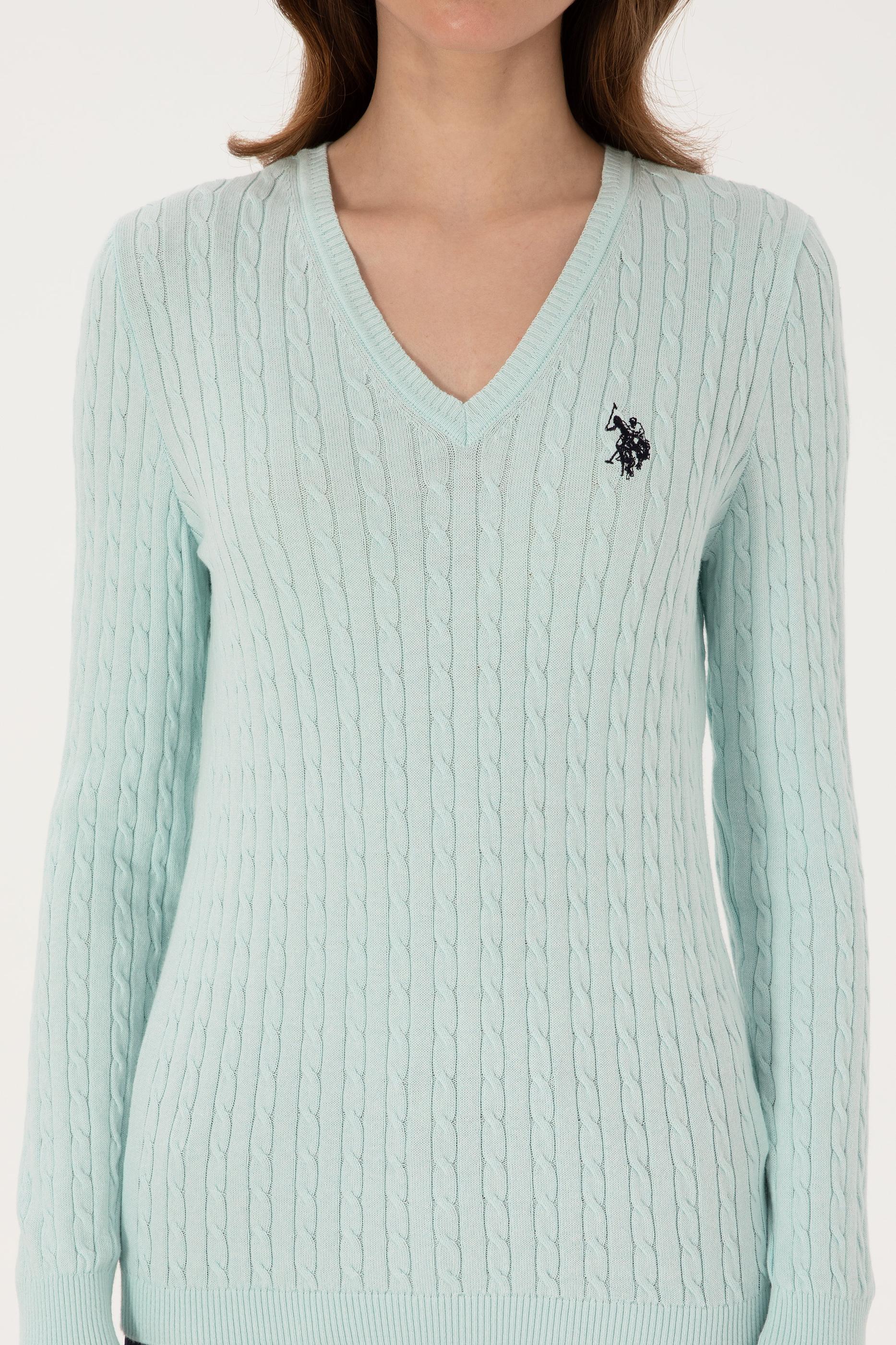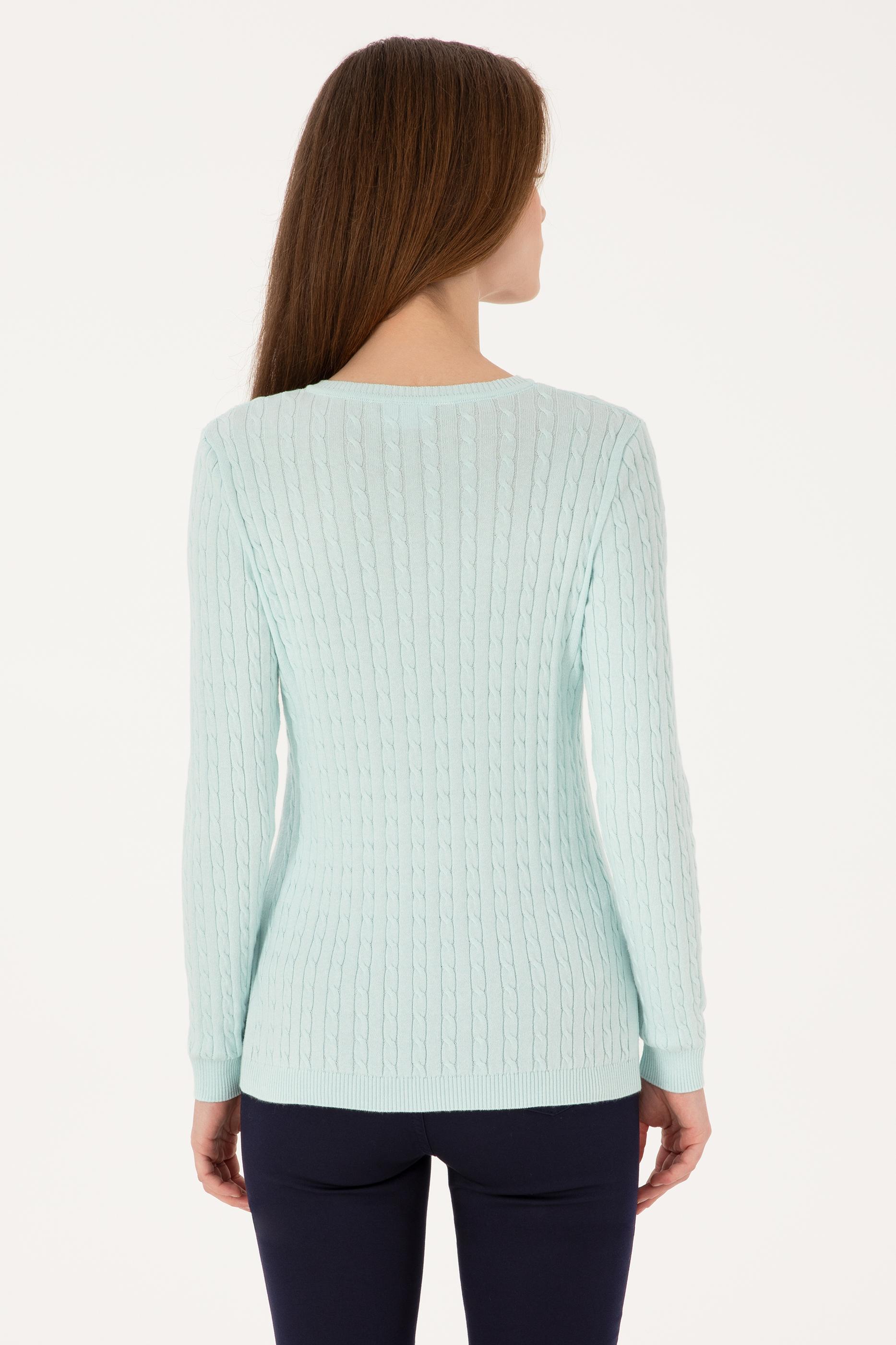 Doğal tonların zarafetini yansıtan bu mint rengi %100 pamuk triko kazak, baştan sona uzanan saç örgü dokusuyla sıcak ve sofistike bir stil sunuyor. V yaka detayı, hem tek başına hem de gömlek veya tişörtlerle katmanlı giyime uygun bir görünüm sağlarken, yaka, kol ucu ve etek ucundaki çift ribalı bitişler modele zarif bir çerçeve katıyor. Slim fit kesimi, bedeni hafifçe saran formuyla feminen ve modern bir siluet oluşturuyor. Yumuşak ve nefes alabilen pamuk dokusu sayesinde dört mevsim boyunca rahatlıkla kullanılabilir. Online özel olarak sunulan bu kazak, günlük kombinlerden daha özenli görünümlere kadar pek çok tarza uyum sağlayan zamansız bir parça.