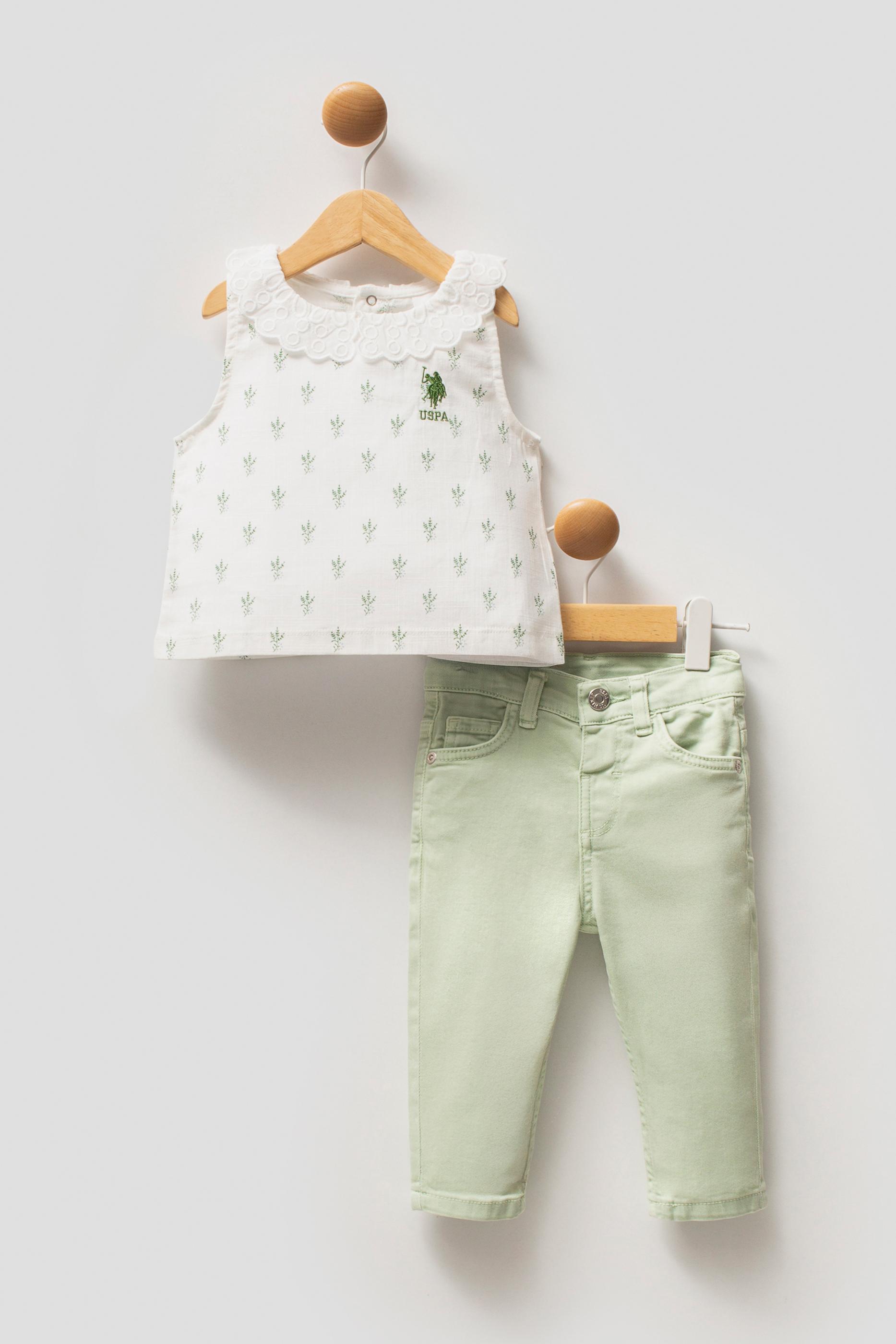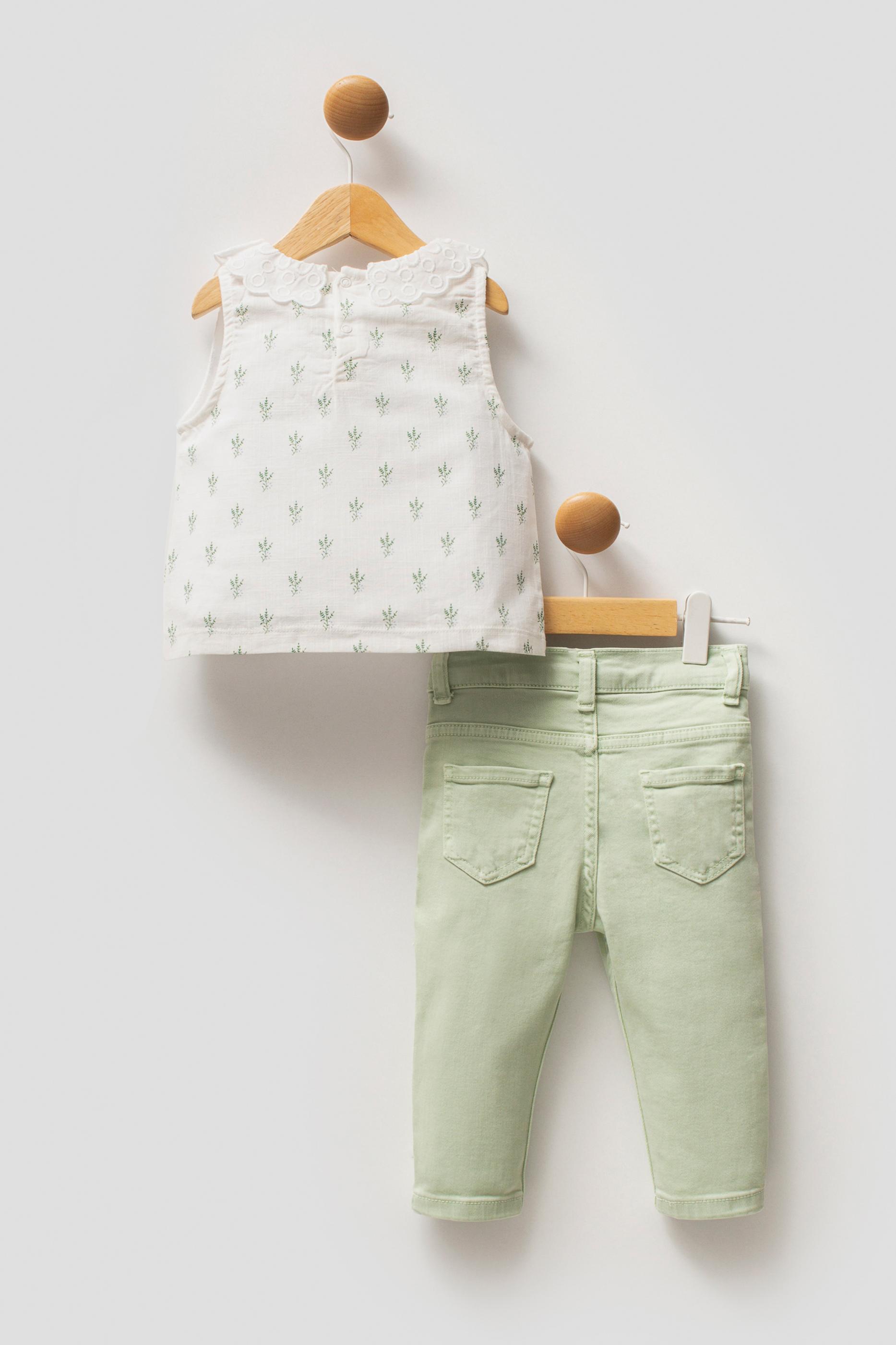 - Kız Bebek Su Yeşili Çiçek Desenli Dantel Yaka Tişört Jean Pantolon Takım 2'li