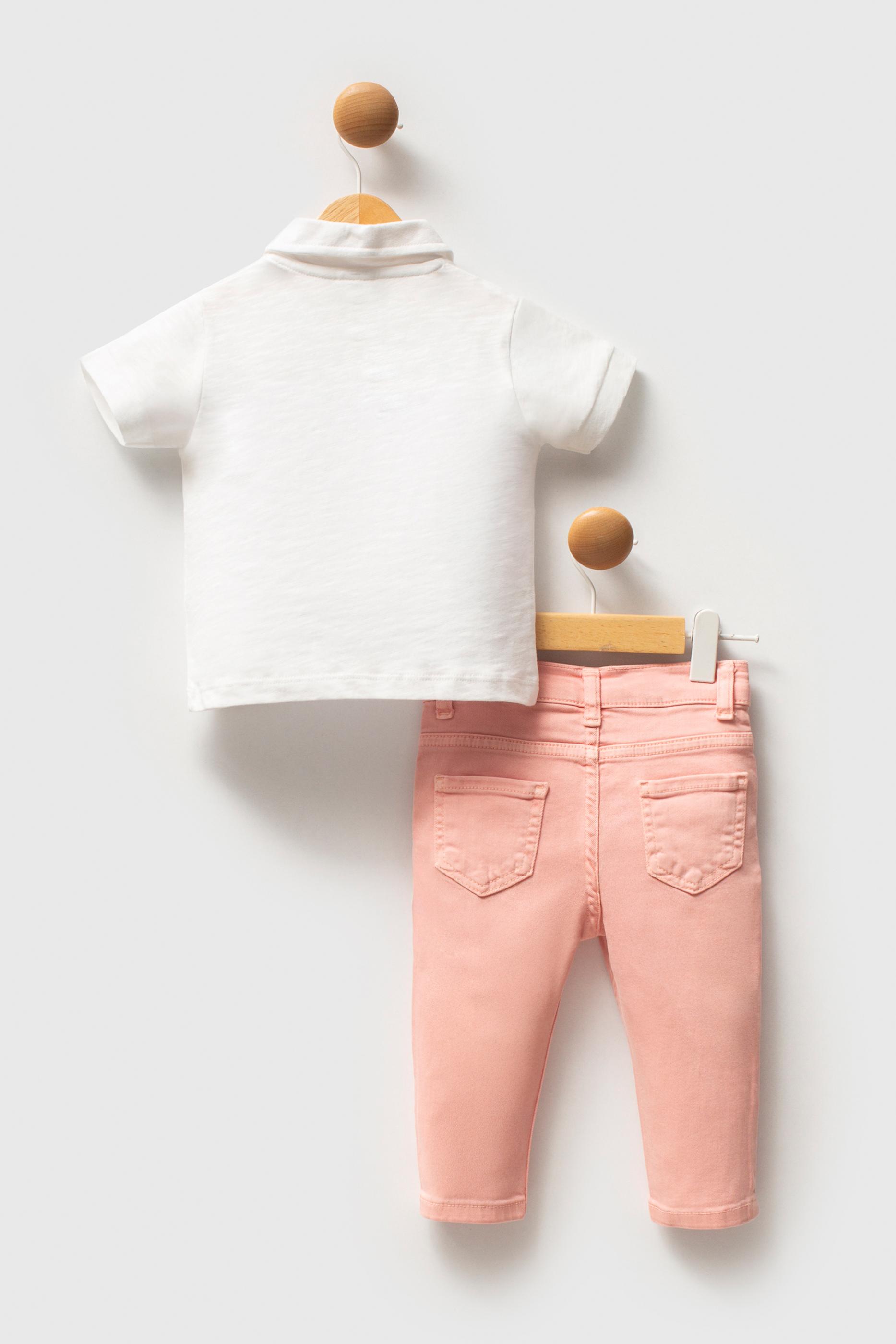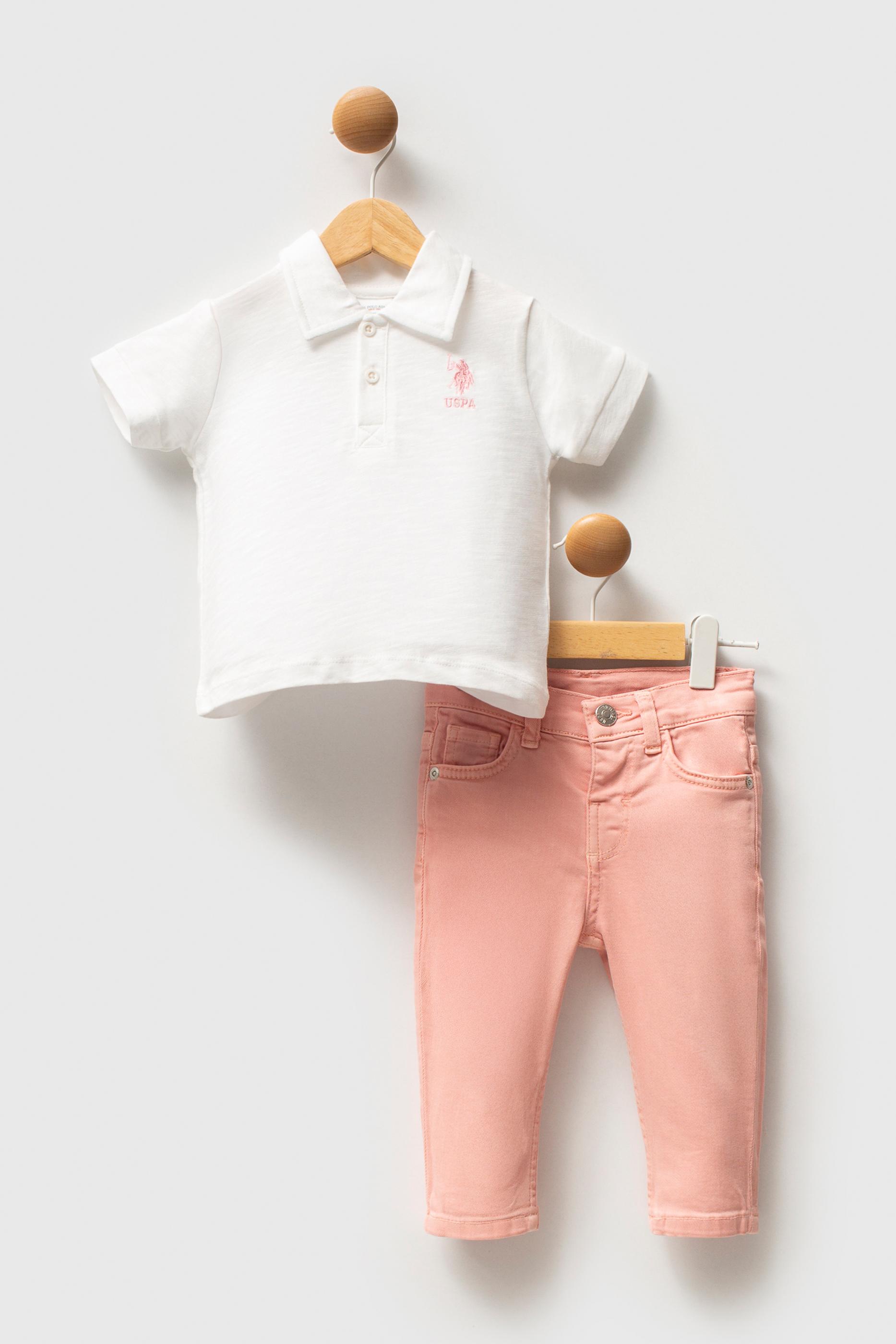 - Kız Bebek Beyaz %100 Pamuk Polo Yaka Tişört Jean Pantolon Takım 2'li