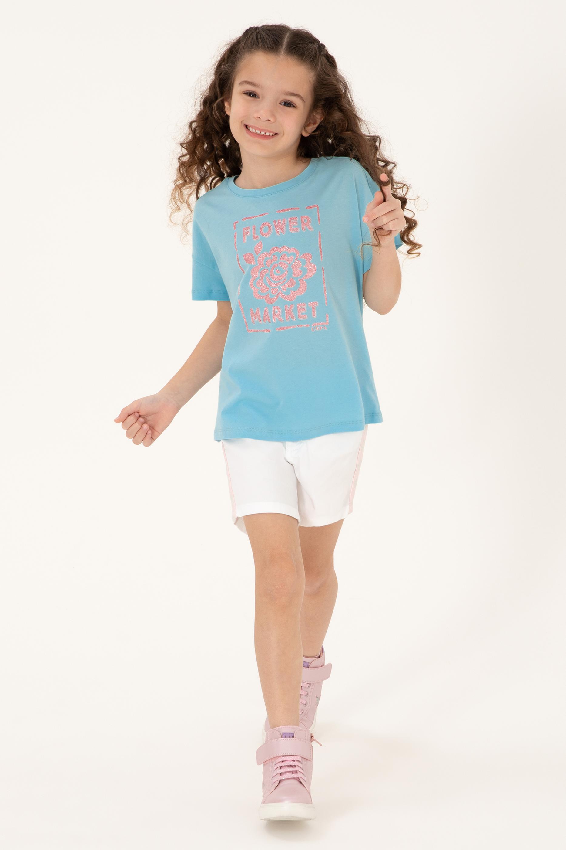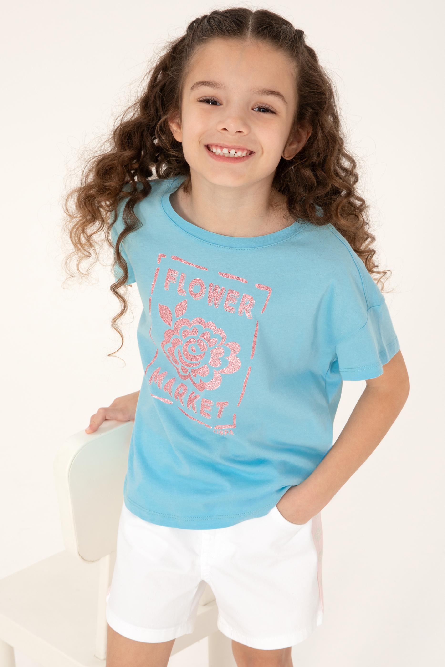 - Kız Çocuk Aqua Bisiklet Yaka Çiçek Baskılı Pamuk Tişört