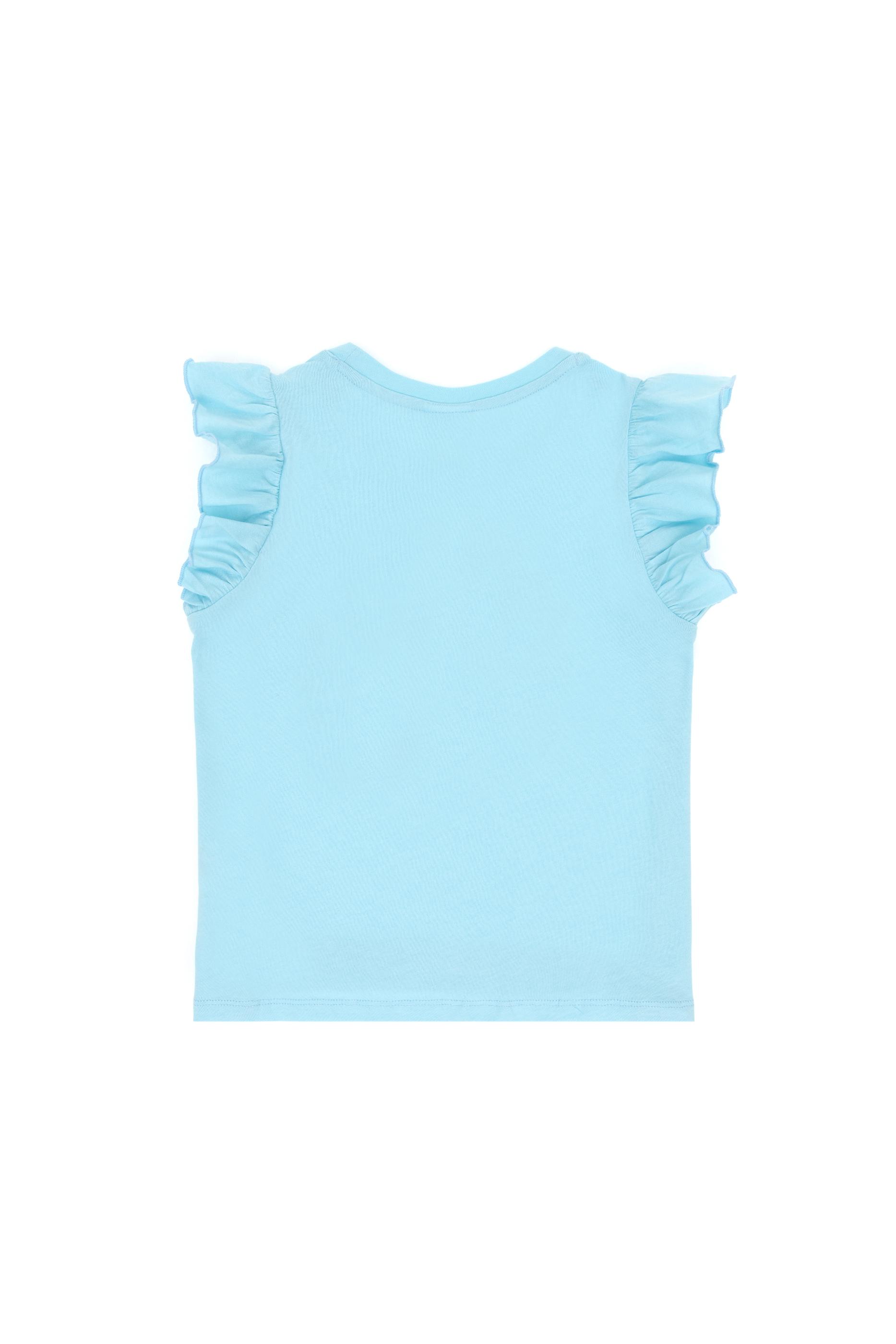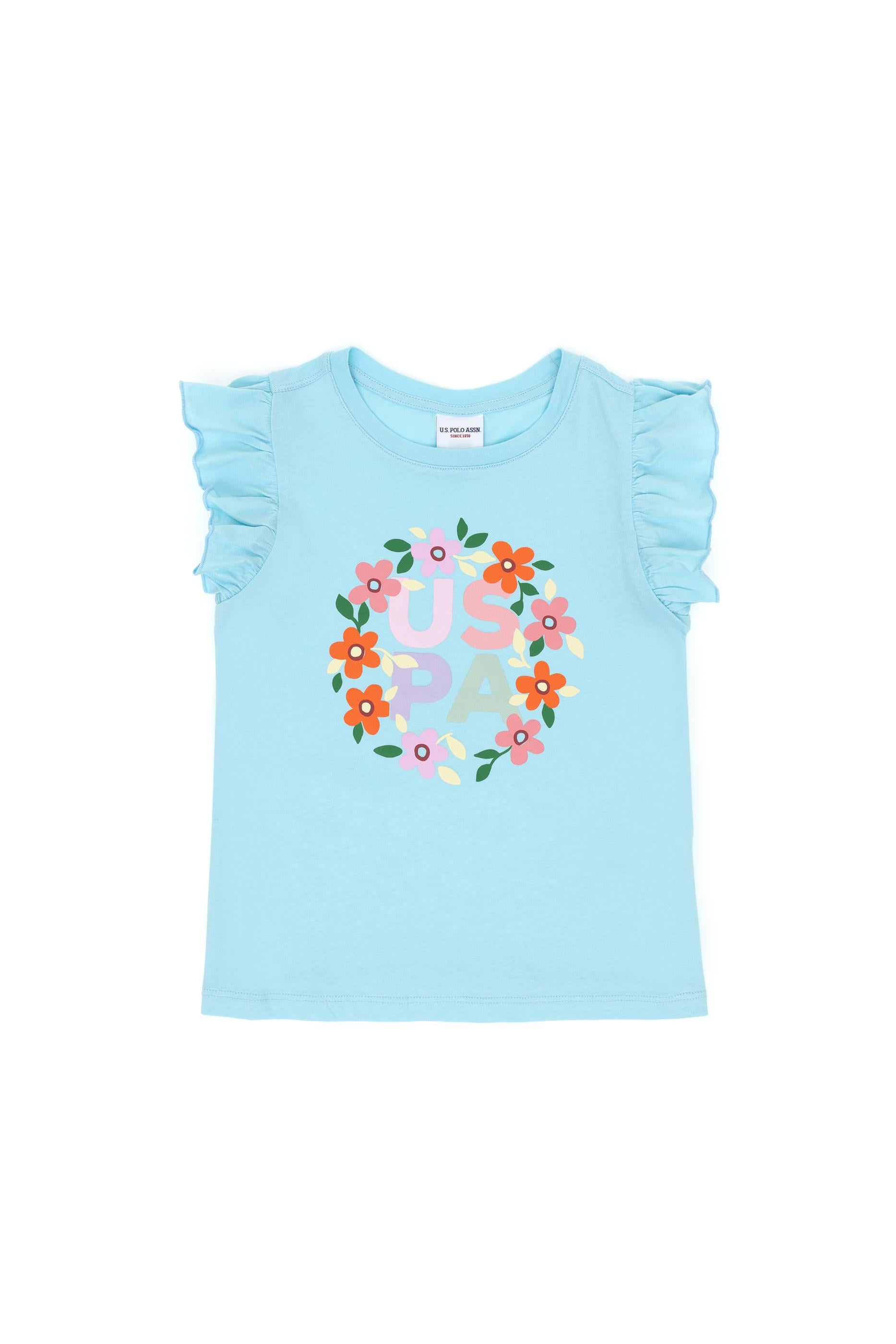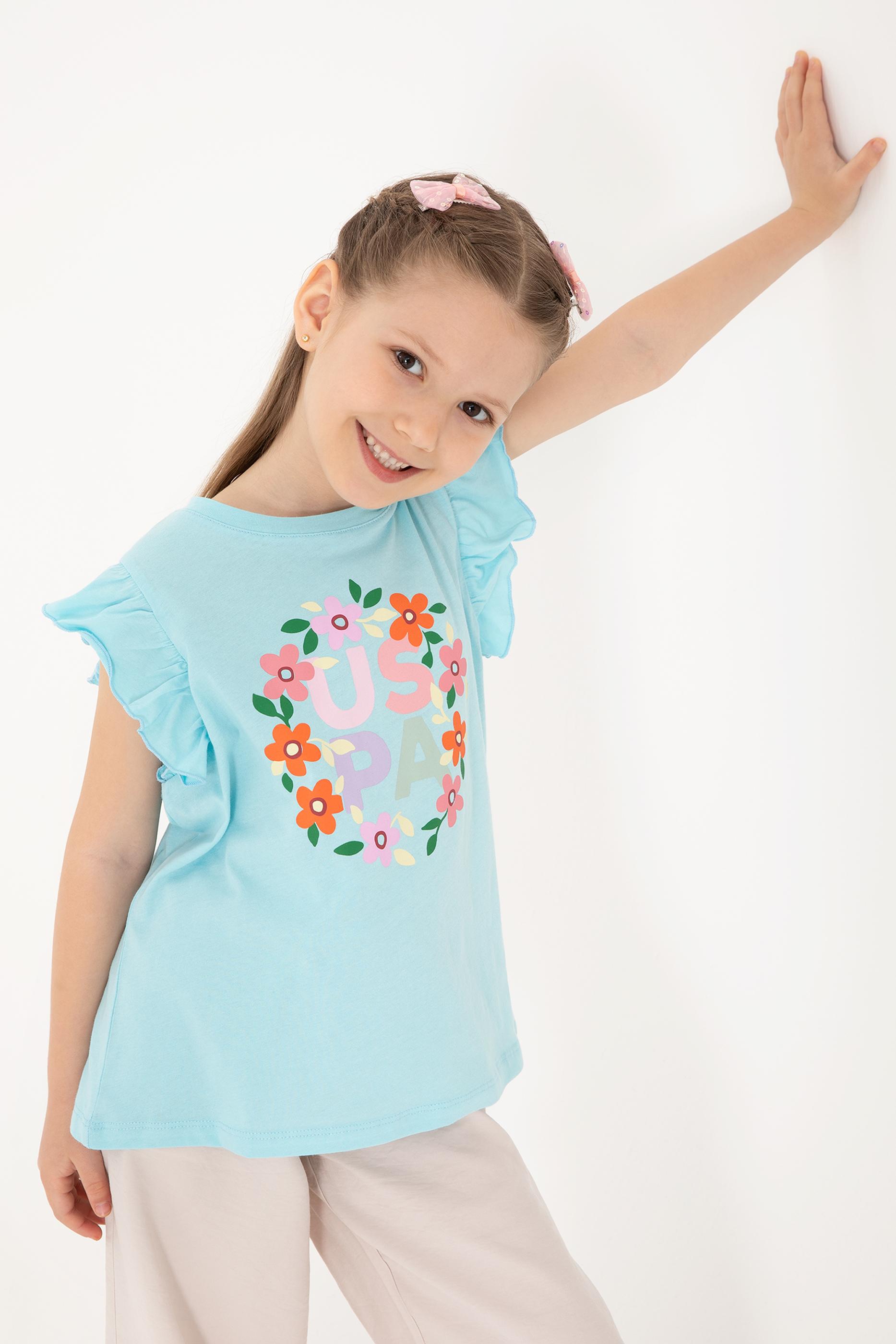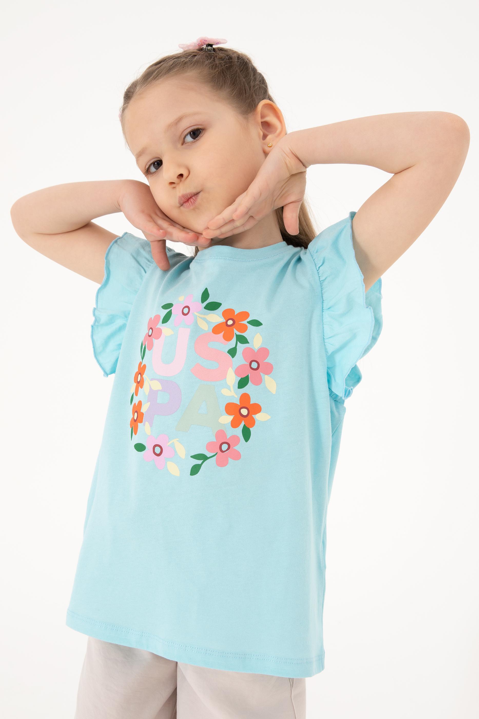 Kız Çocuk Aqua Bisiklet Yaka Pamuk Fırfırlı Çiçek Baskılı Tişört