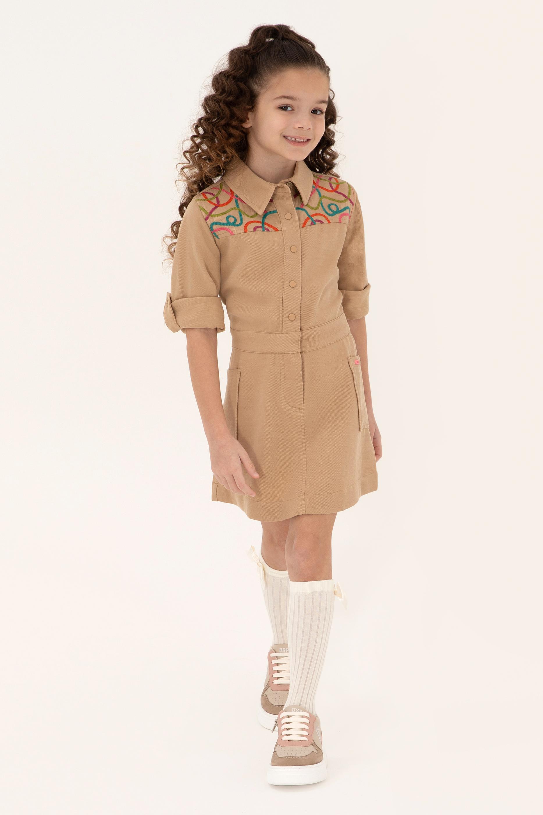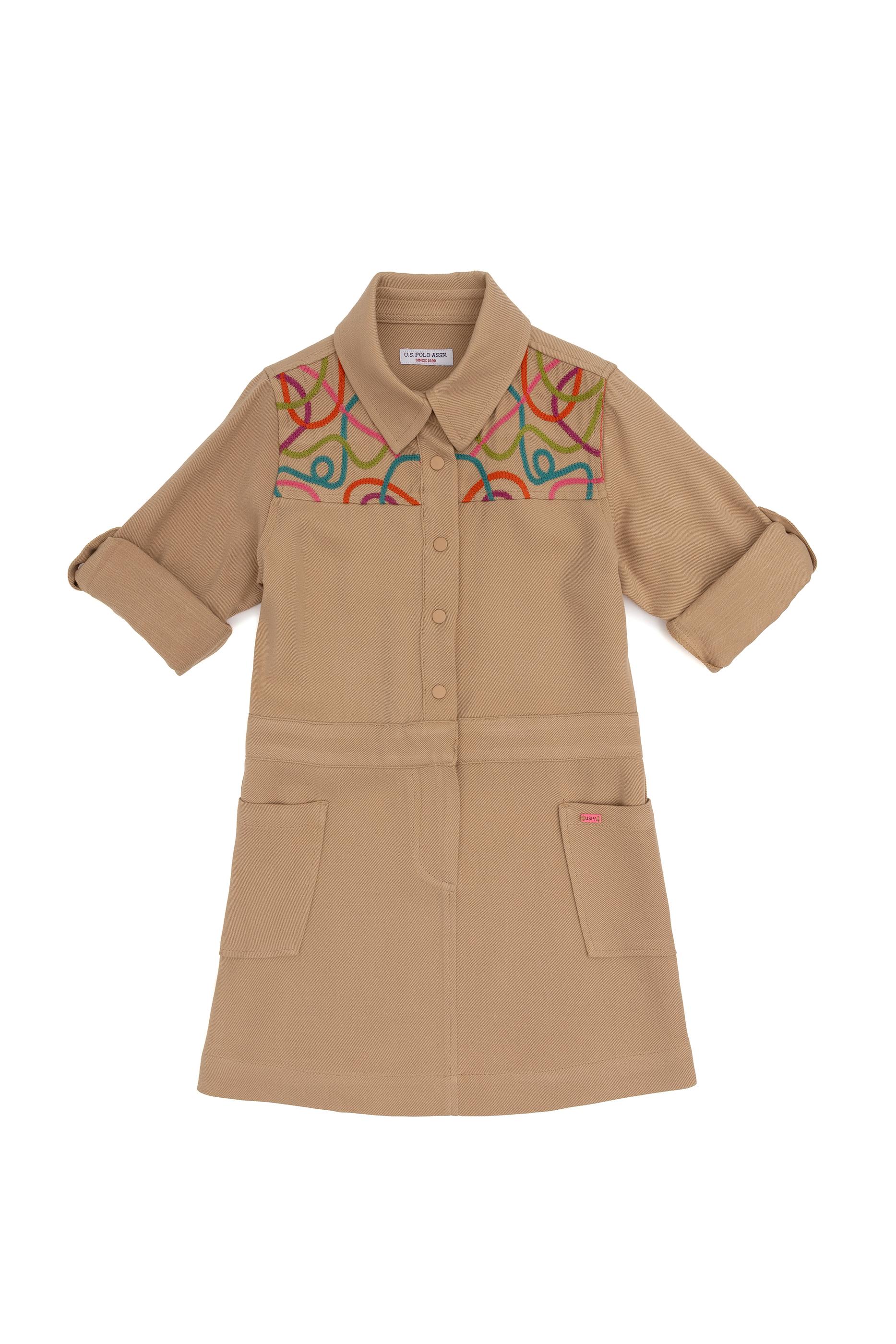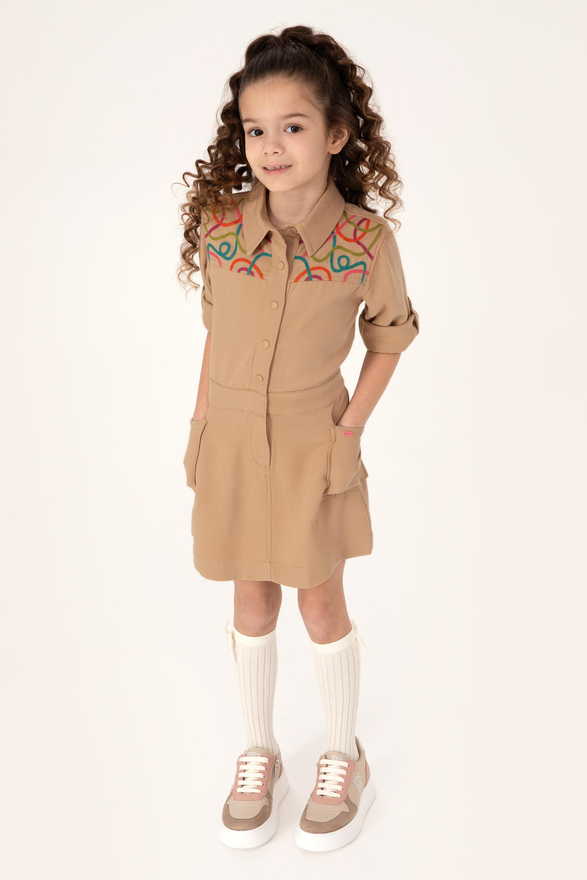 Kız Çocuk Camel Cep Detaylı İşlemeli Dokuma Elbise