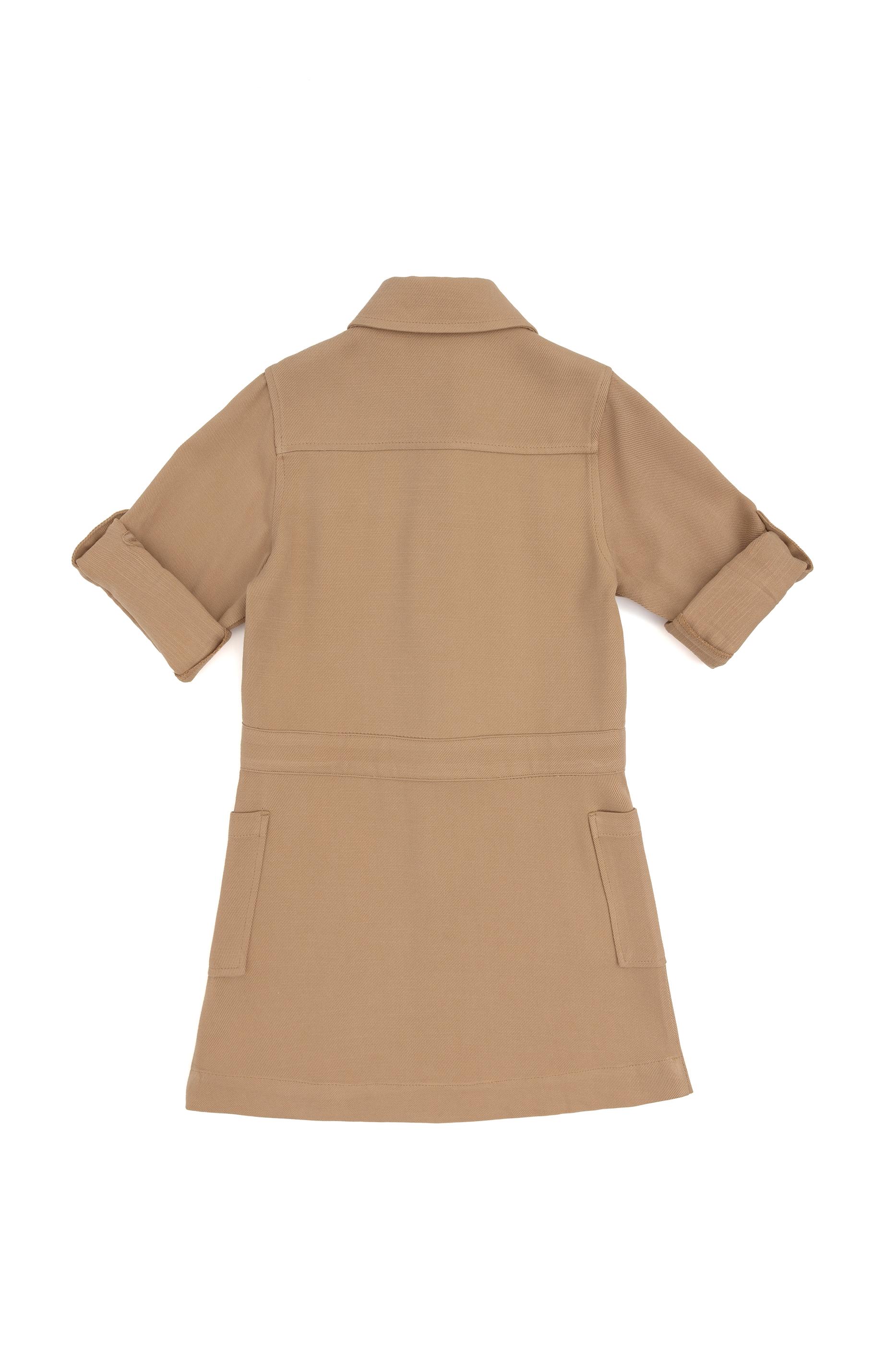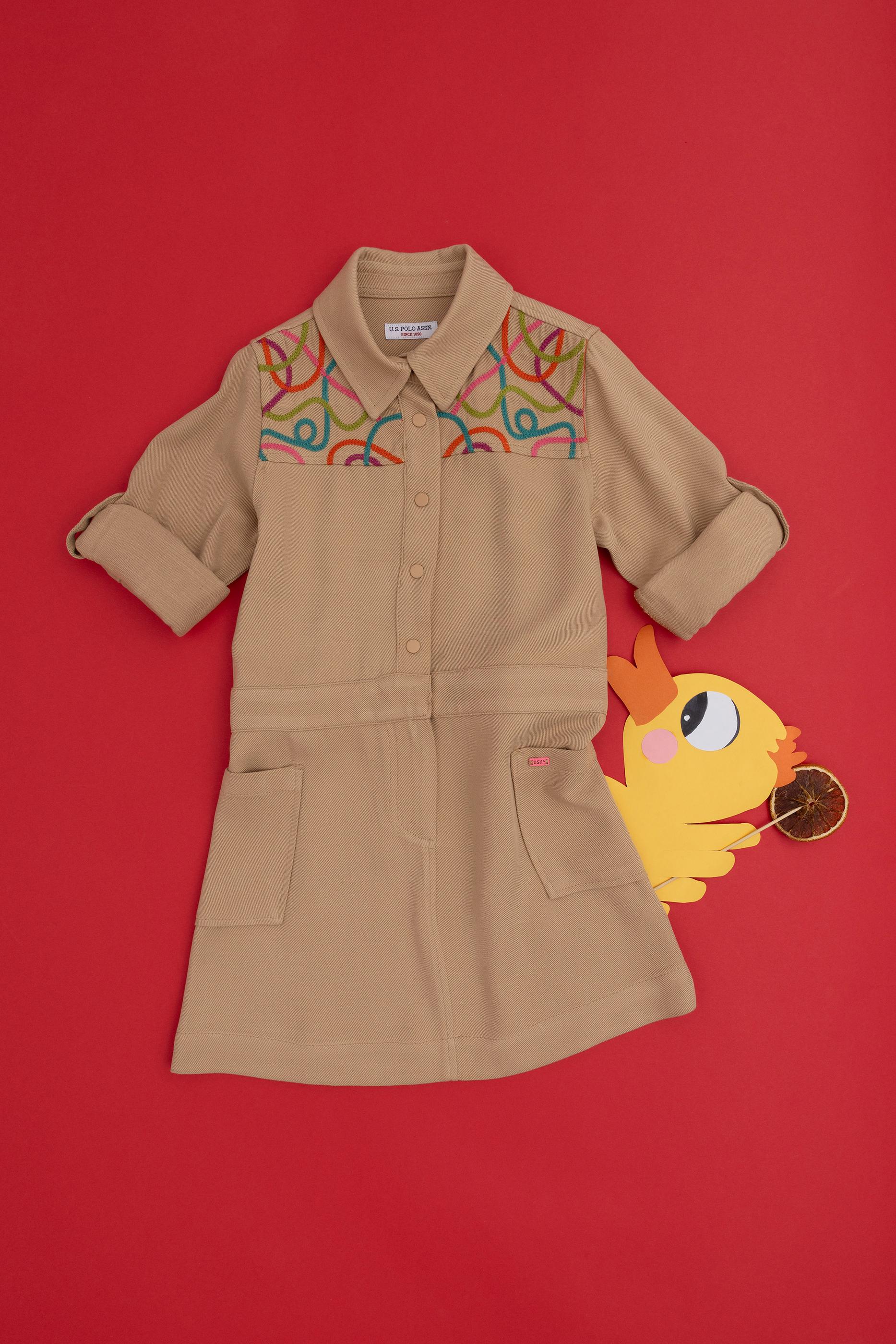 - Kız Çocuk Camel Cep Detaylı İşlemeli Dokuma Elbise