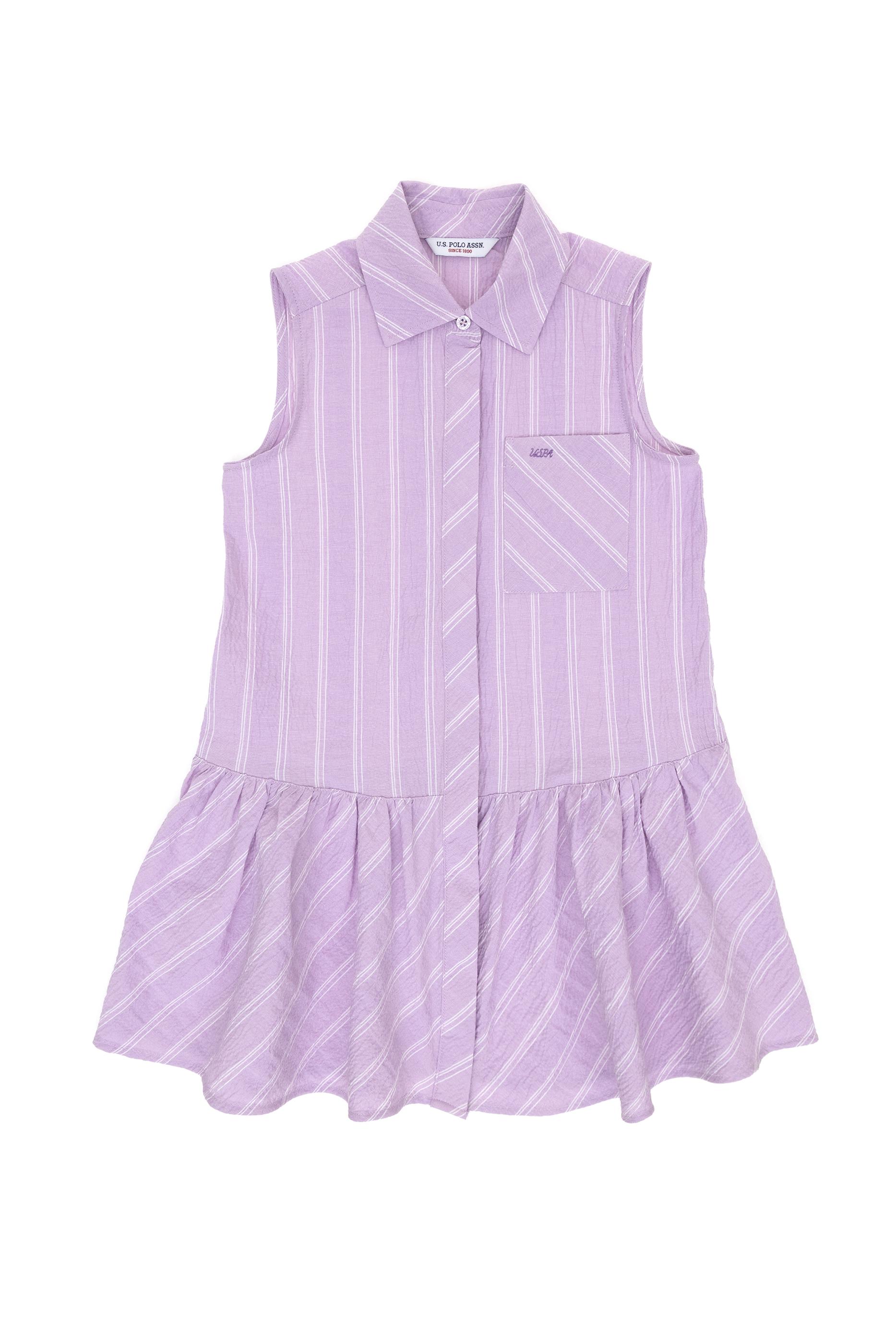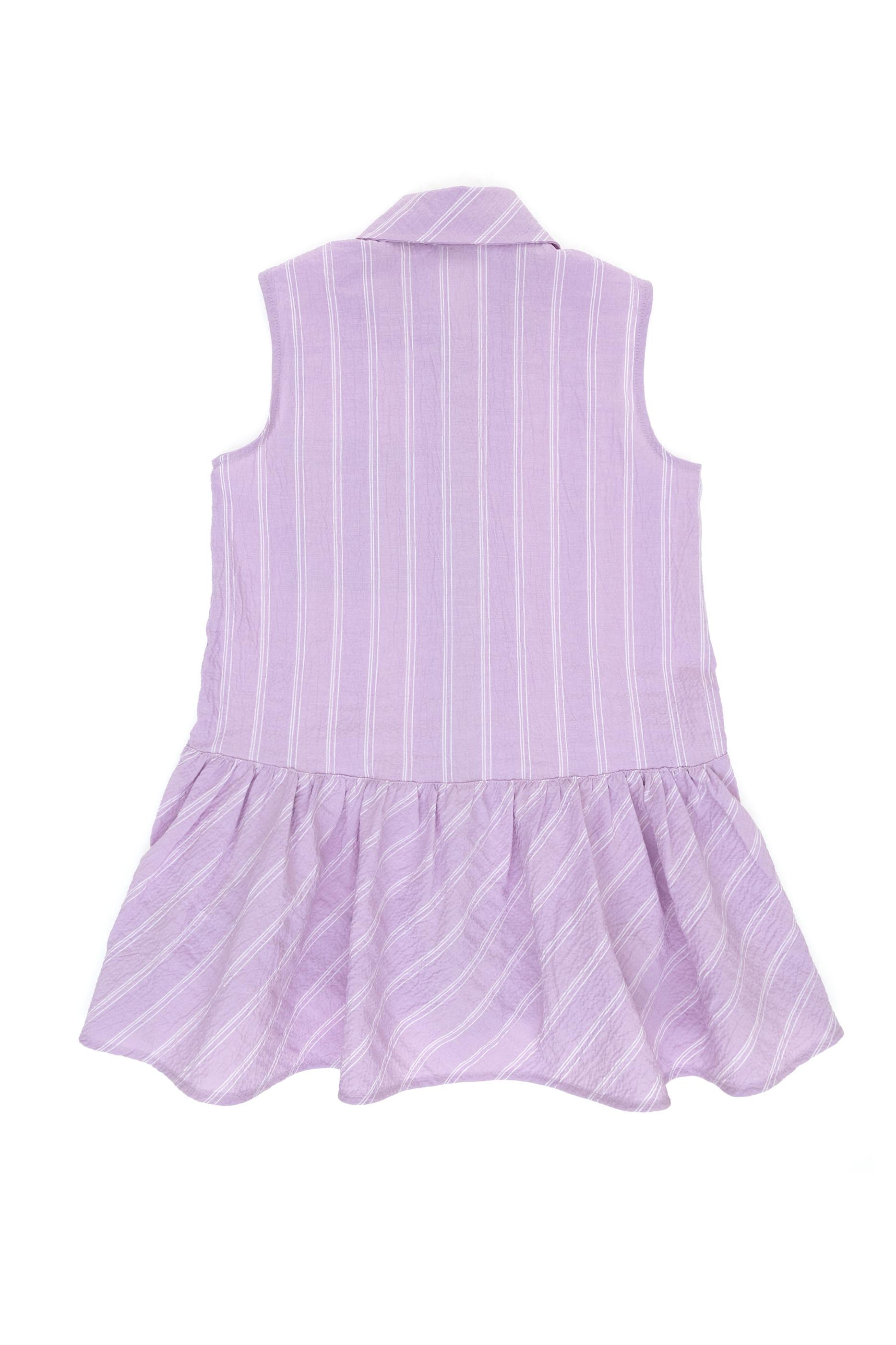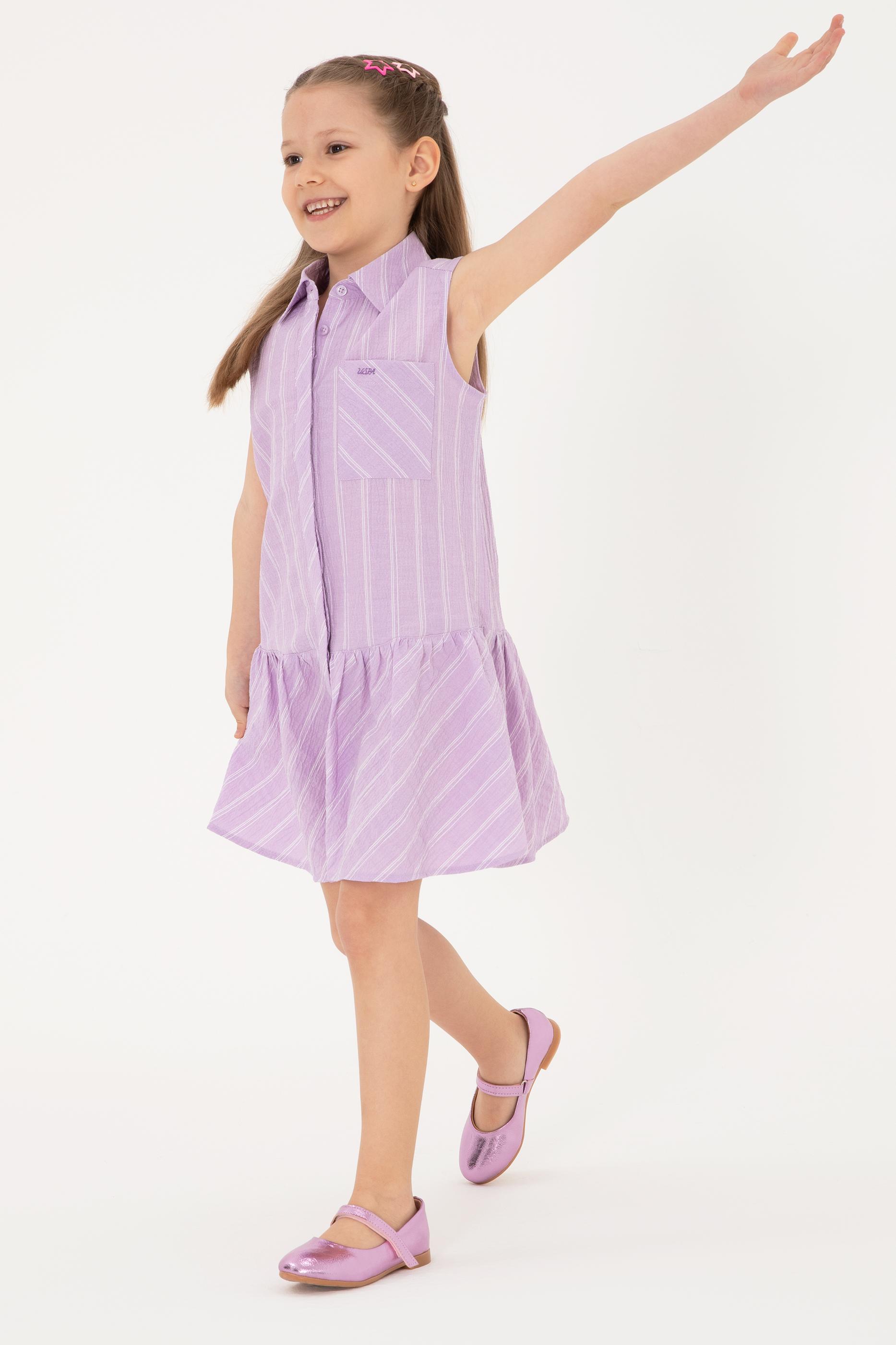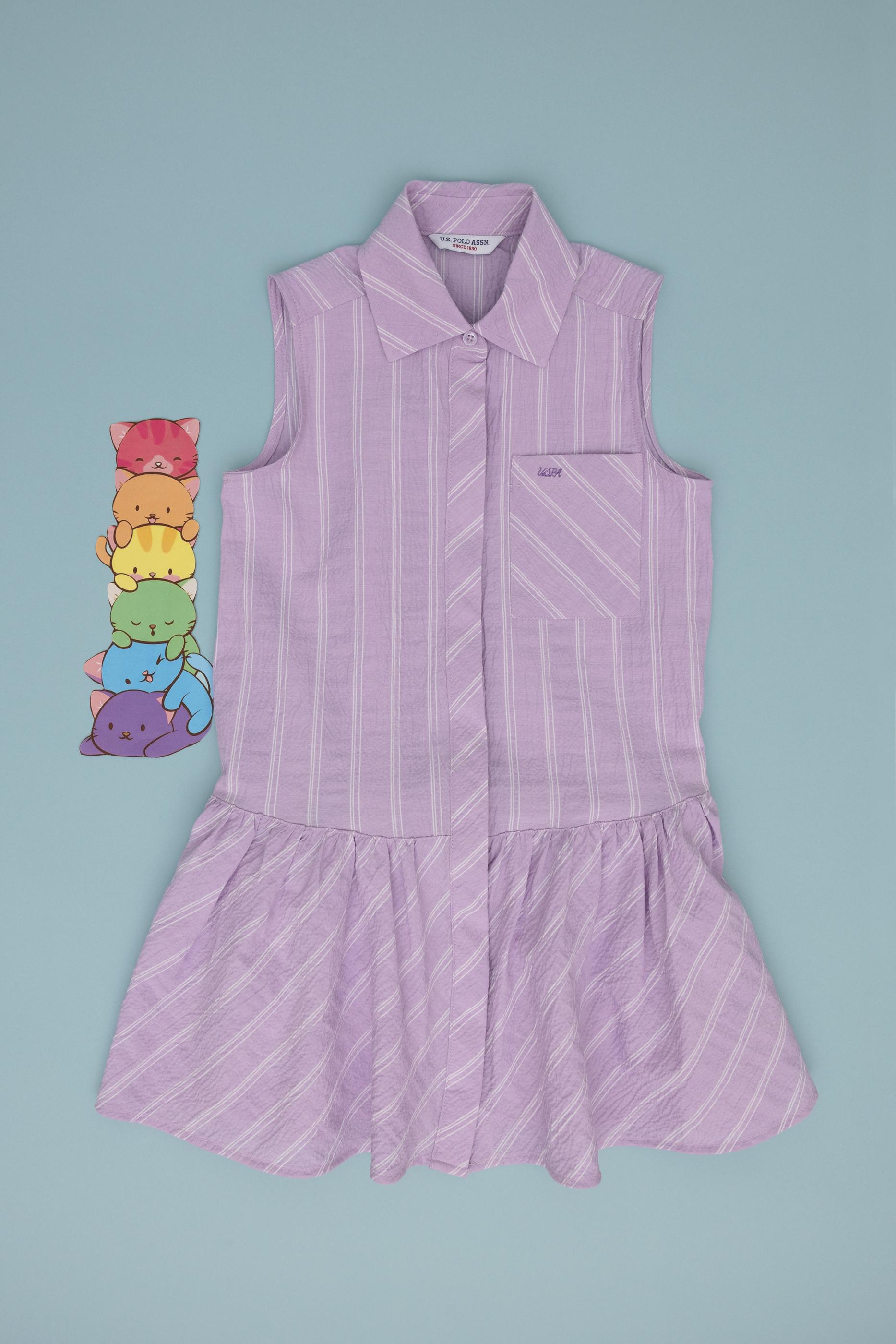 - Kız Çocuk Lila Polo Yaka Kolsuz Çizgili Dokuma Elbise