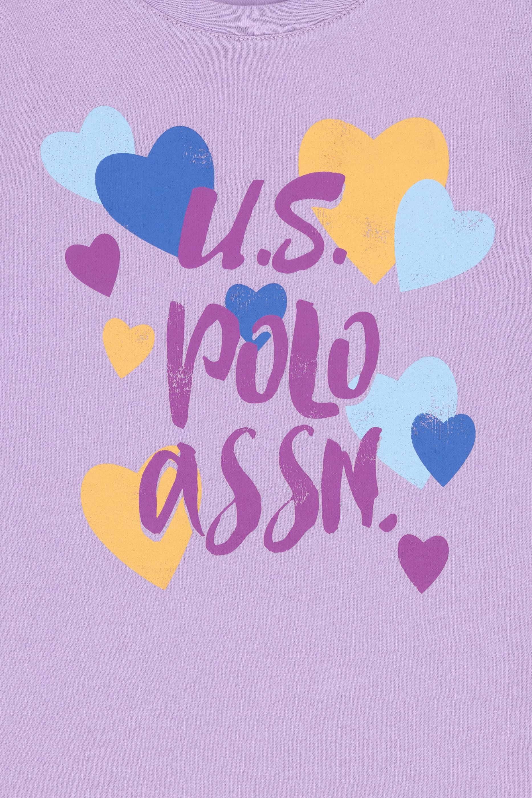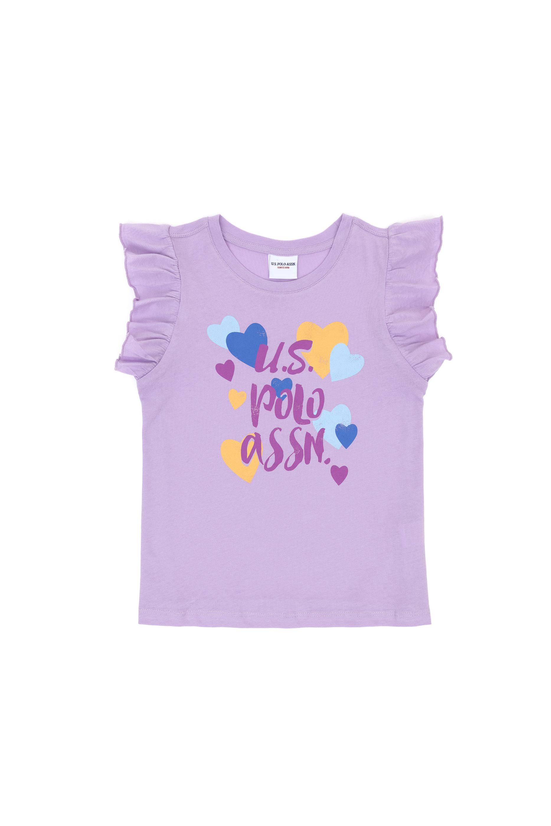 Kız Çocuk Lila Bisiklet Yaka Pamuk Fırfırlı Kalp Baskılı Tişört