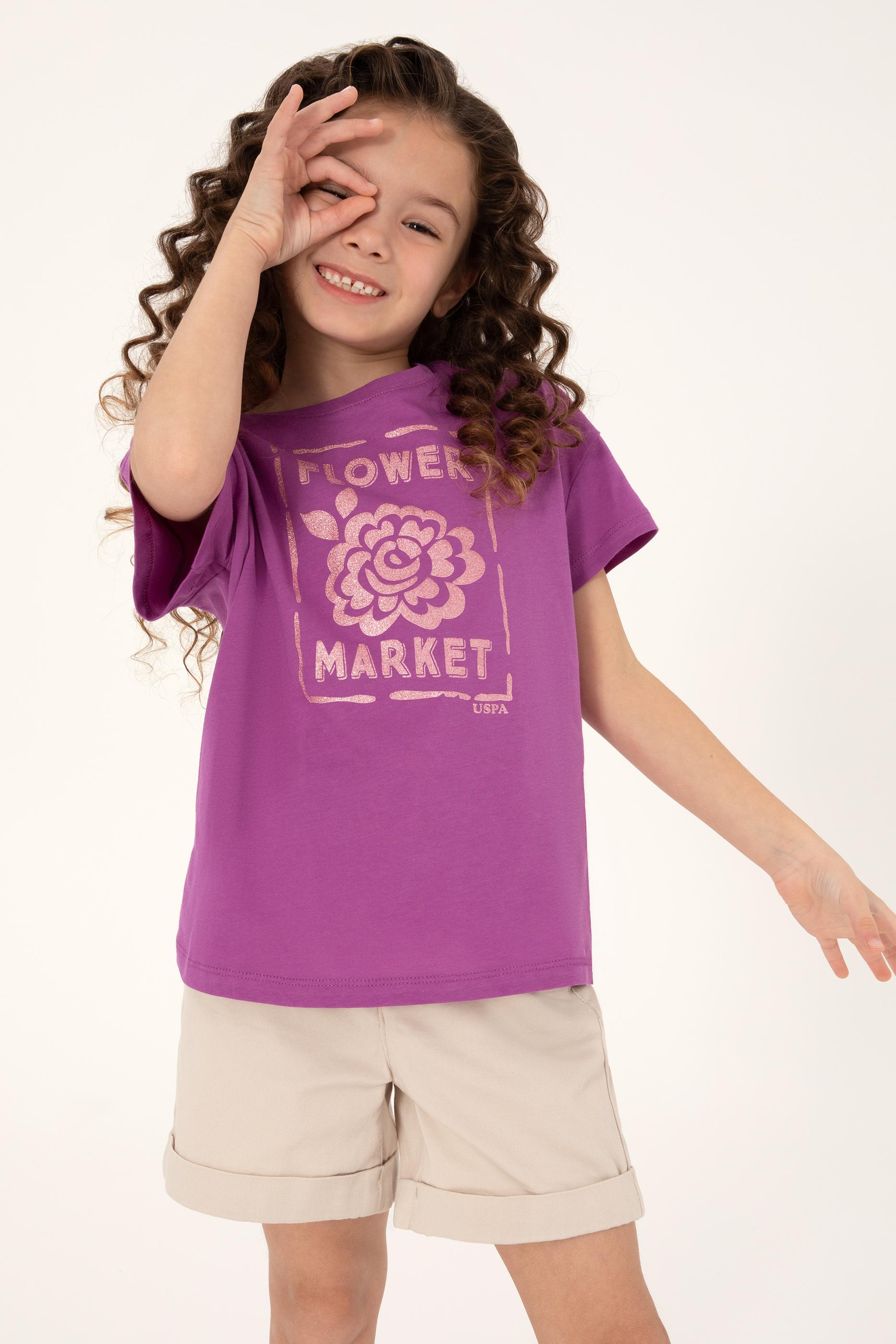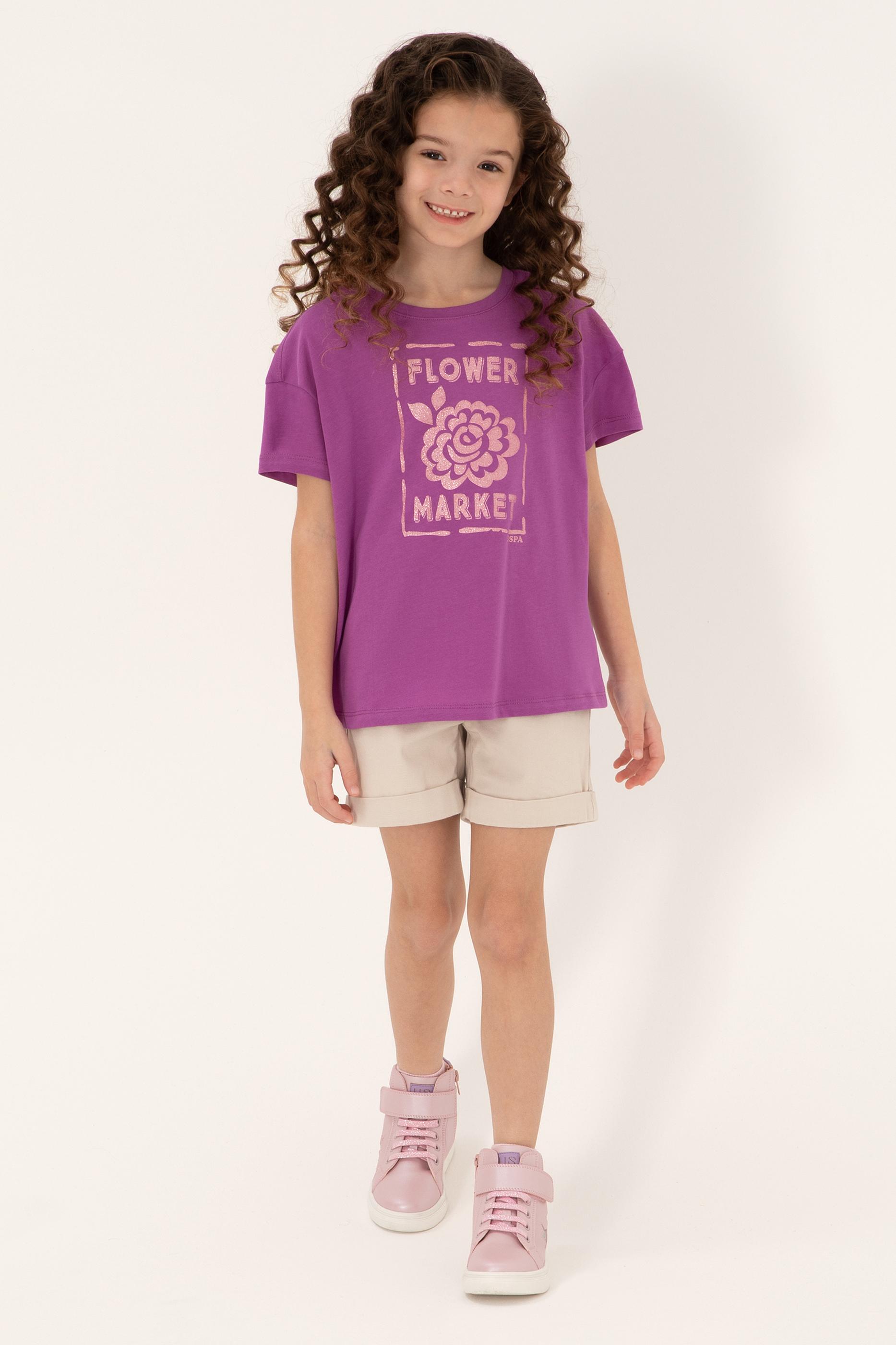 - Kız Çocuk Menekşe Bisiklet Yaka Çiçek Baskılı Pamuk Tişört