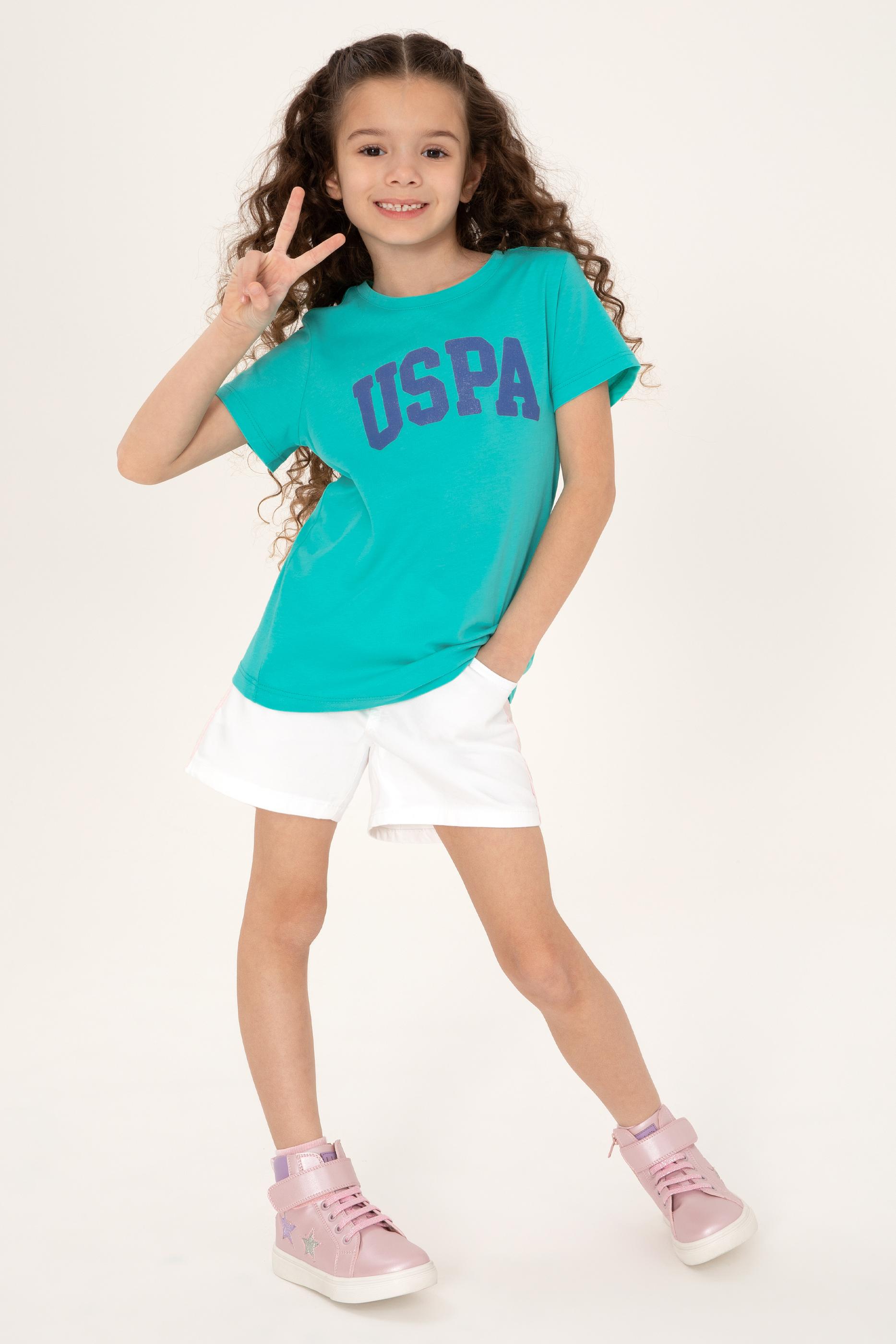 - Kız Çocuk Mint Bisiklet Yaka Pamuk Simli Uspa Baskılı Basic Tişört