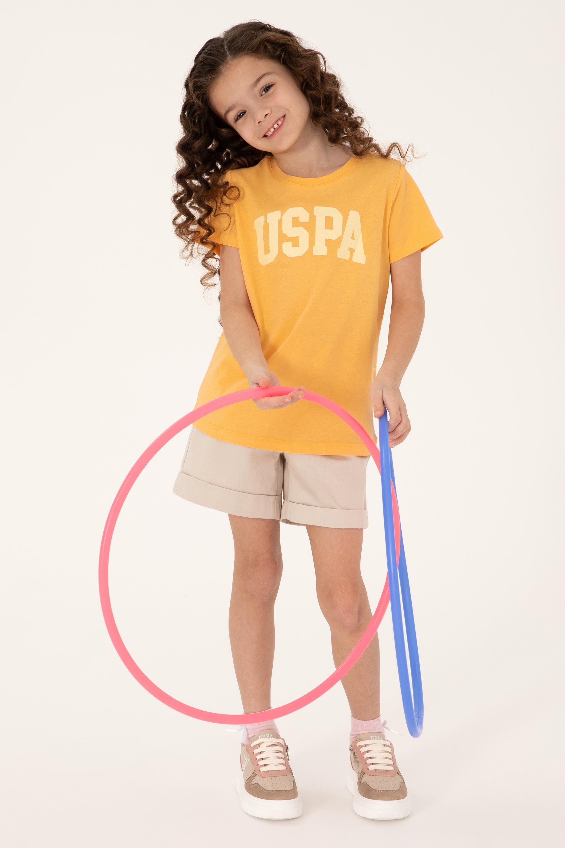 - Kız Çocuk Turuncu Bisiklet Yaka Pamuk Simli Uspa Baskılı Basic Tişört