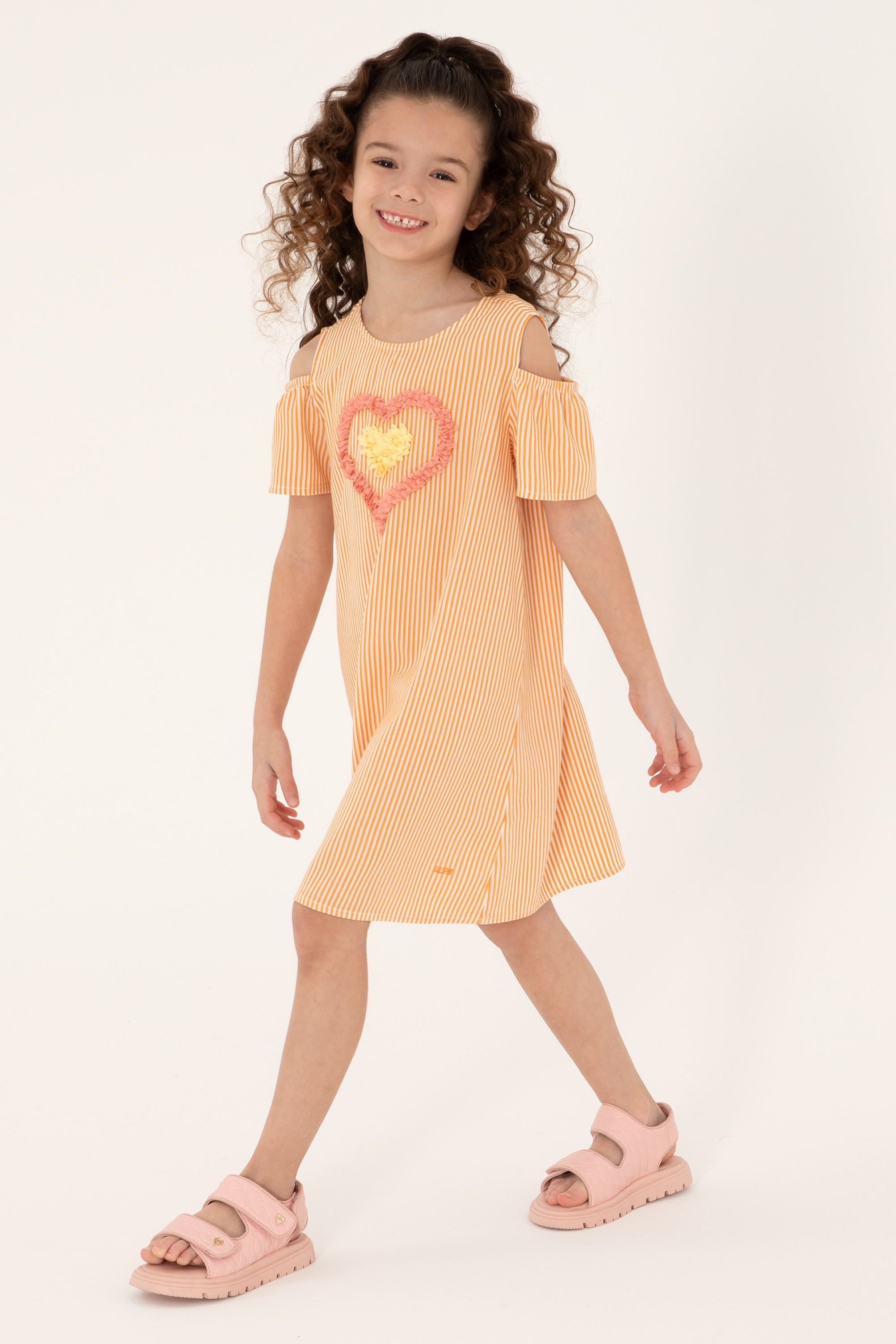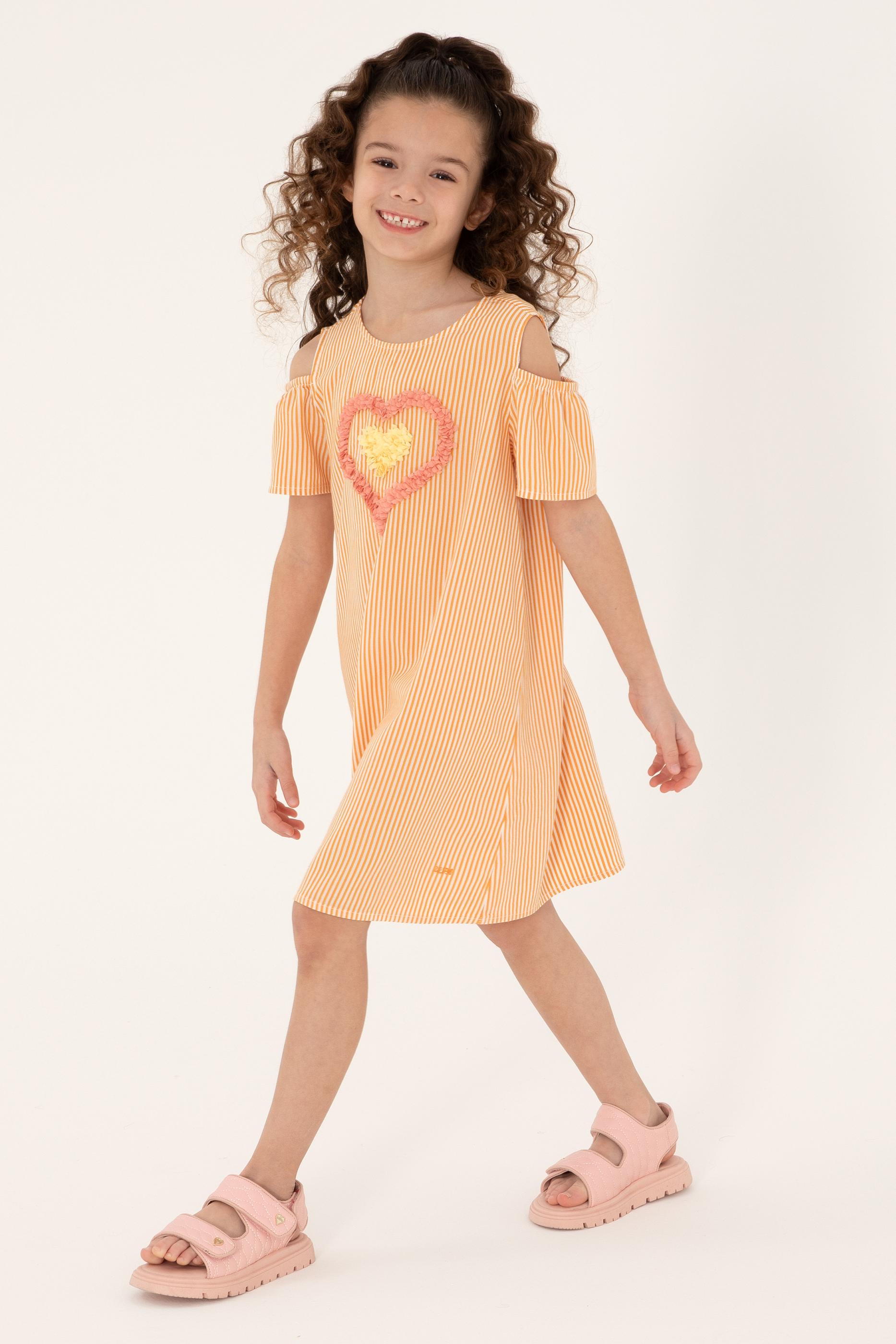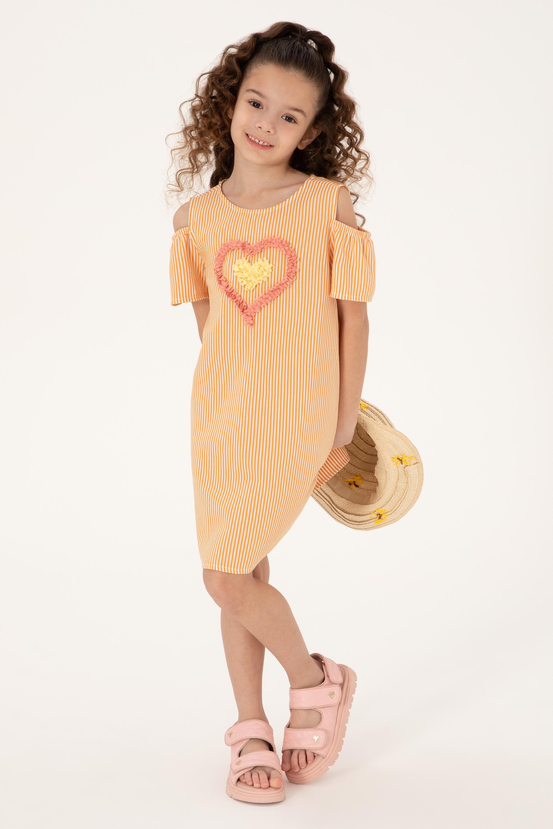 - Kız Çocuk Turuncu Kalp İşlemeli Çizgili Omuz Detaylı Dokuma Elbise